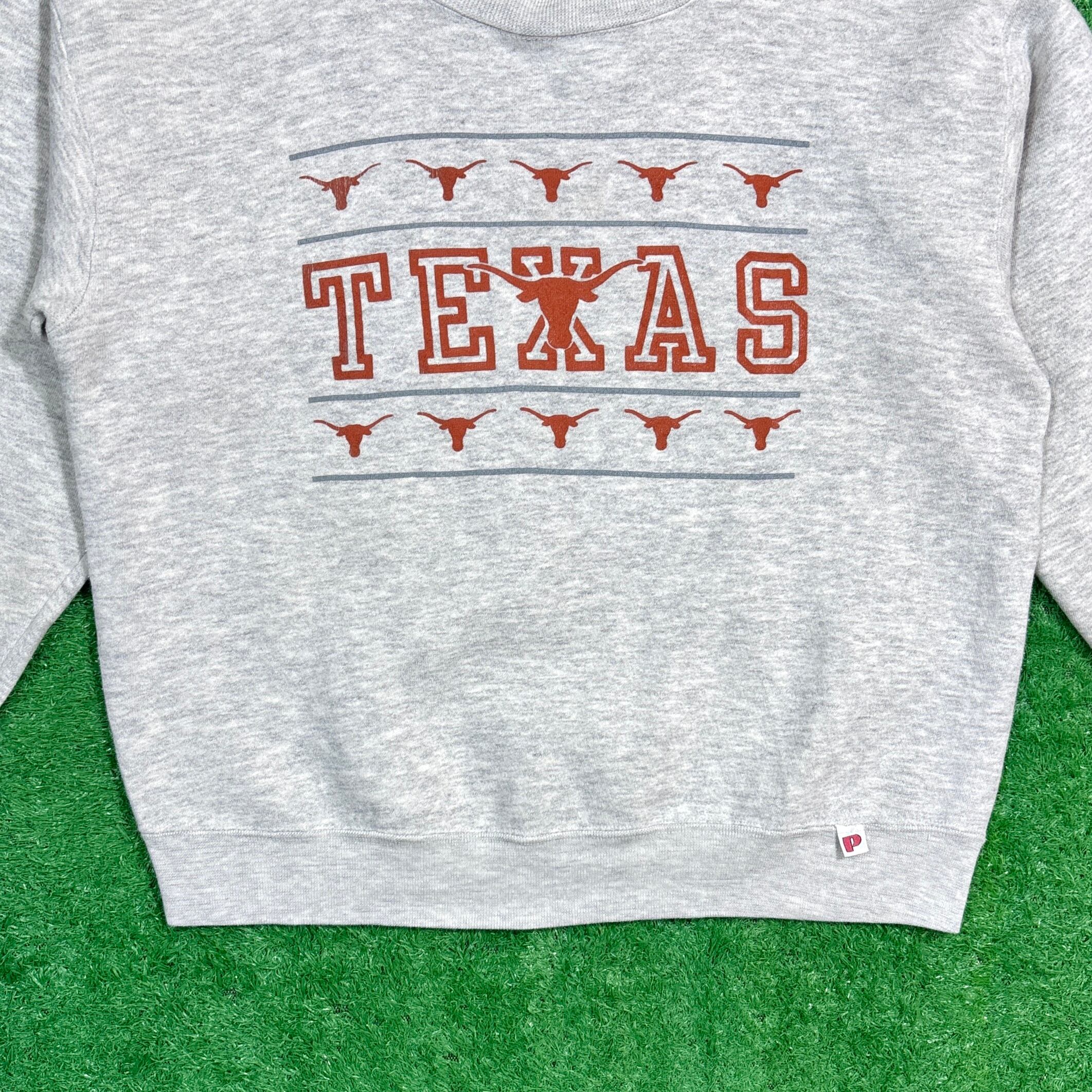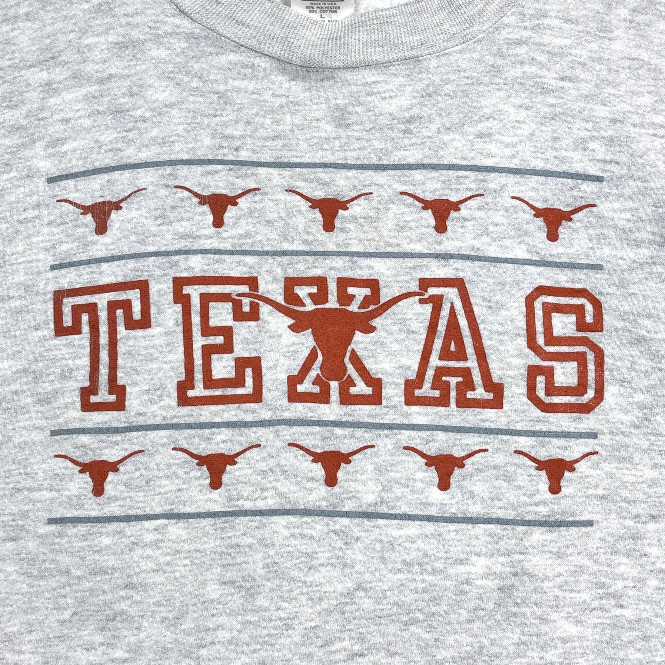 フロントには「TEXAS」のロゴとともに、ウエスタンカルチャーを象徴するバッファロースカルが描かれたデザインが印象的。杢グレーのボディにレンガ色のプリントがよく映え、当時らしいアメリカンカレッジ風×ウエスタンテイストを楽しめる一枚です。
