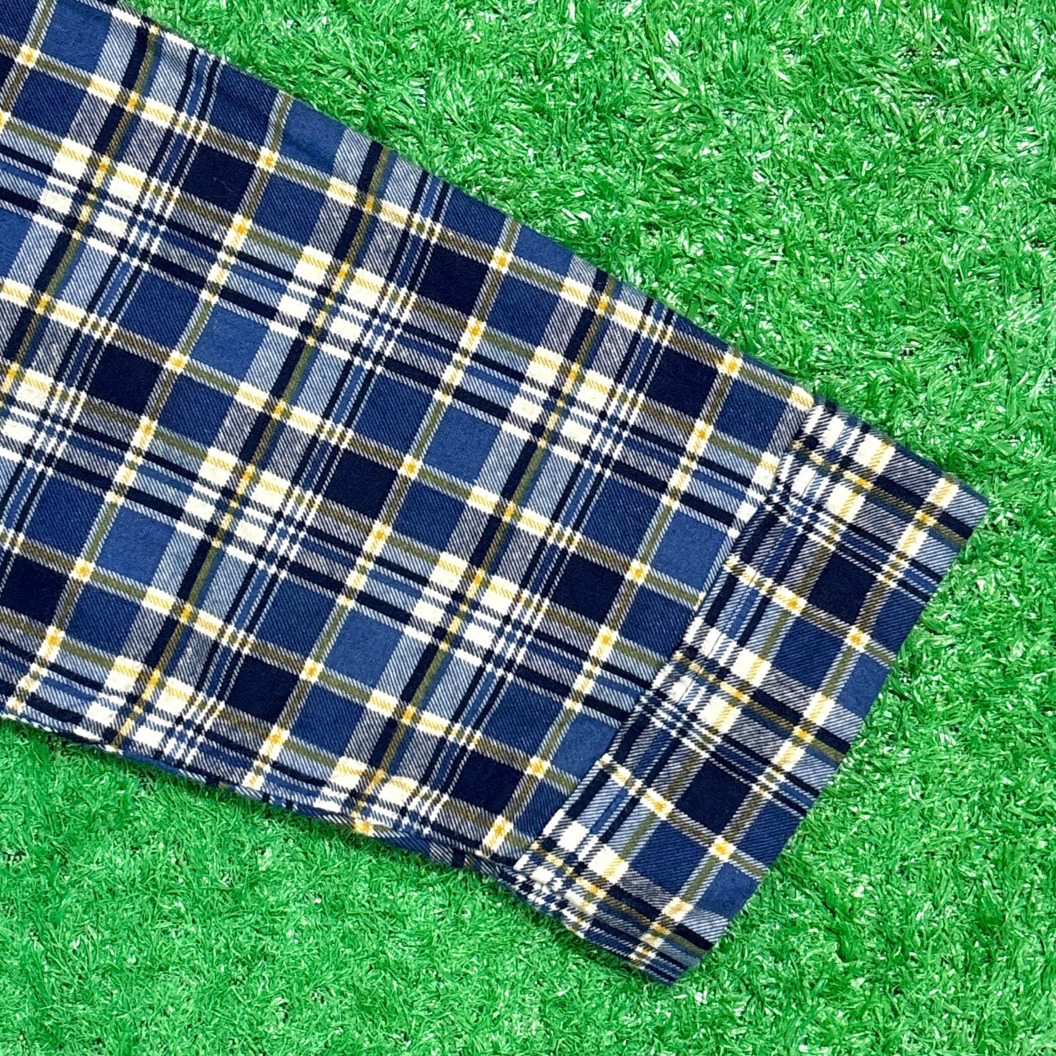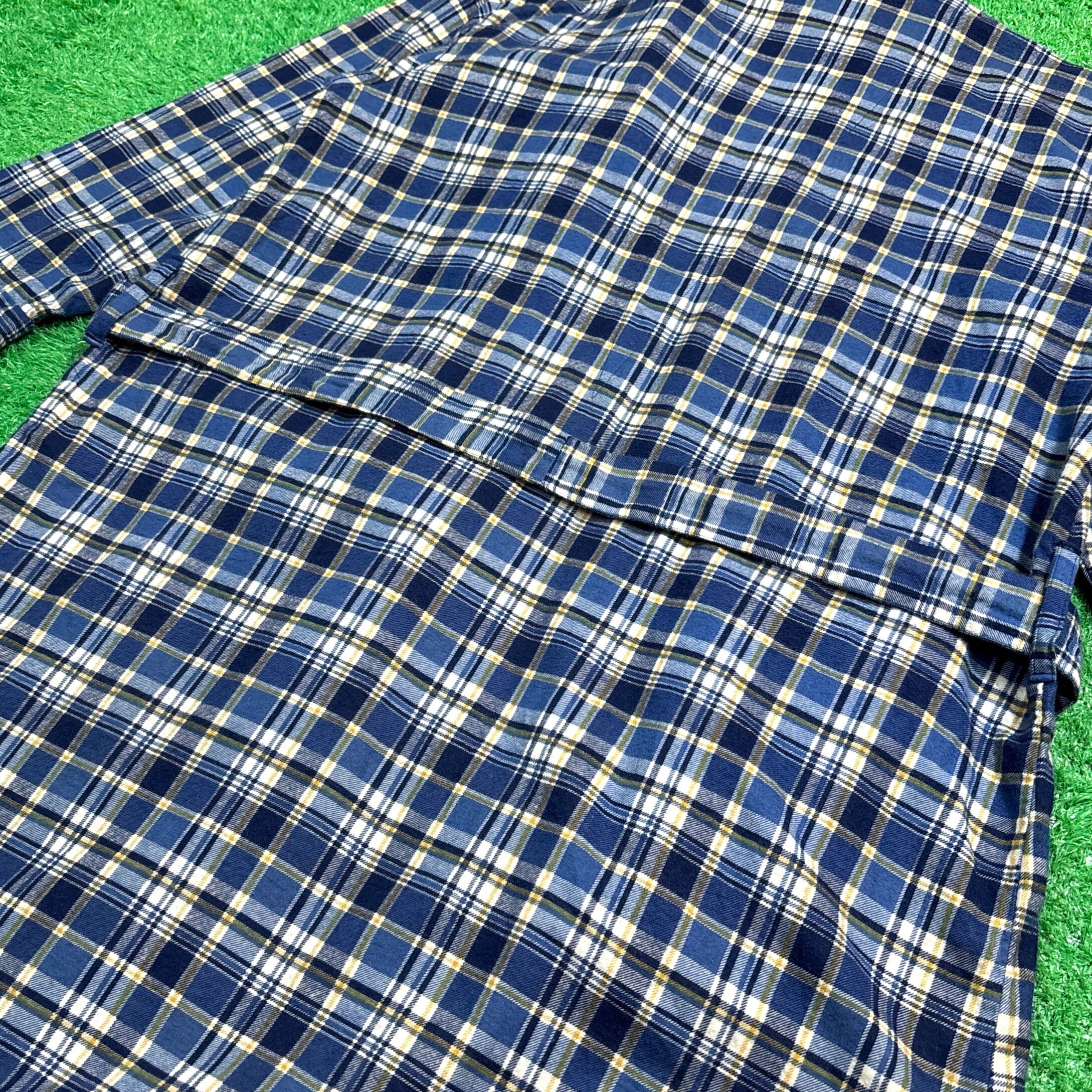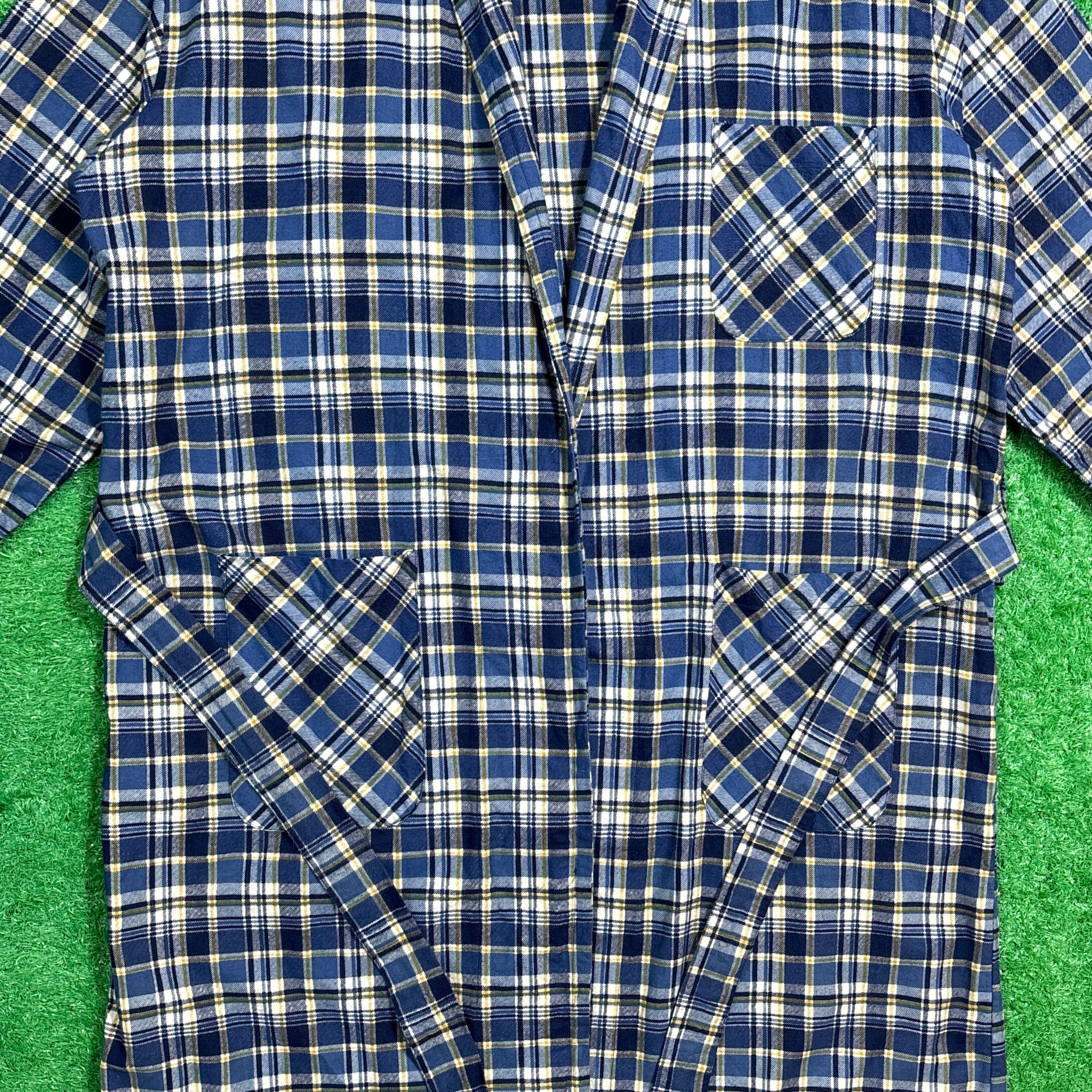 ブルーを基調としたチェックパターンに胸ポケット・腰ポケットが付き、実用性とデザイン性を兼ね備えた1着。素材表記は不明ですが、起毛感のあるフランネル生地のような柔らかい質感で、軽やかに羽織れるのが魅力です。ロング丈で存在感があり、ヒッピーやリラックススタイルにもぴったり。