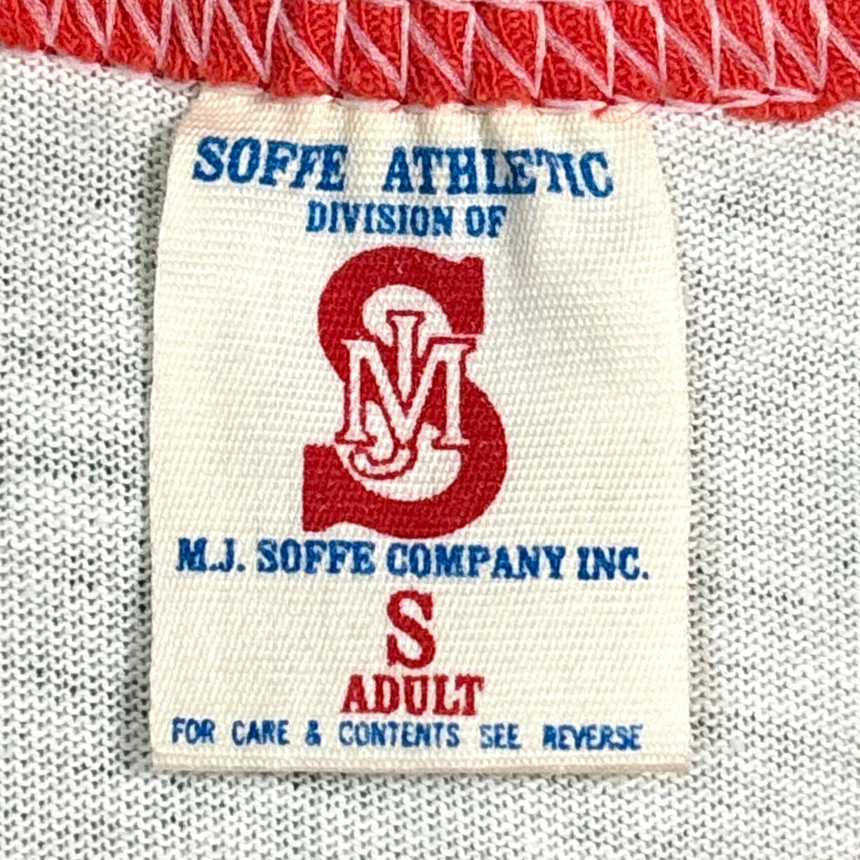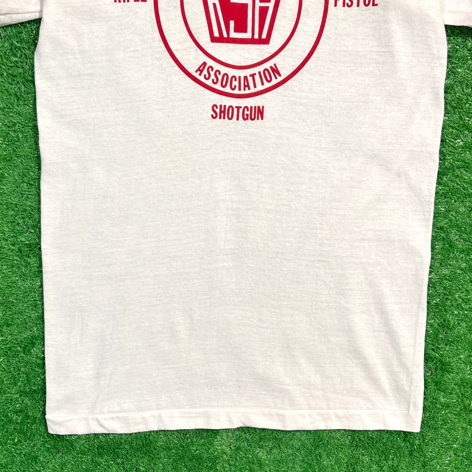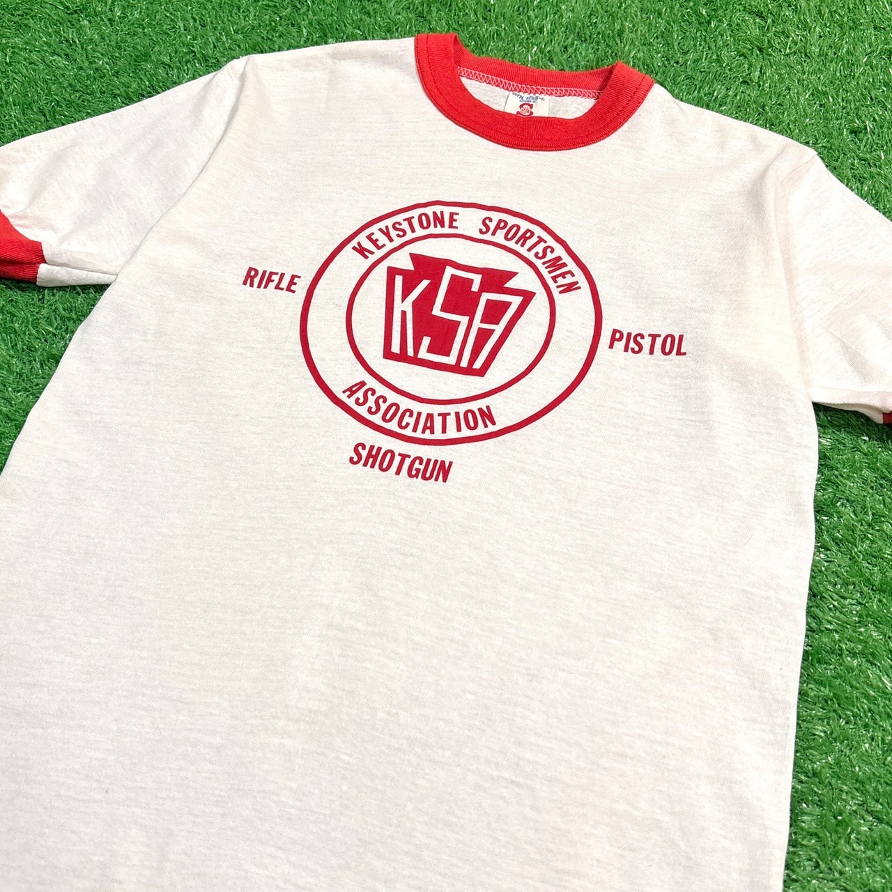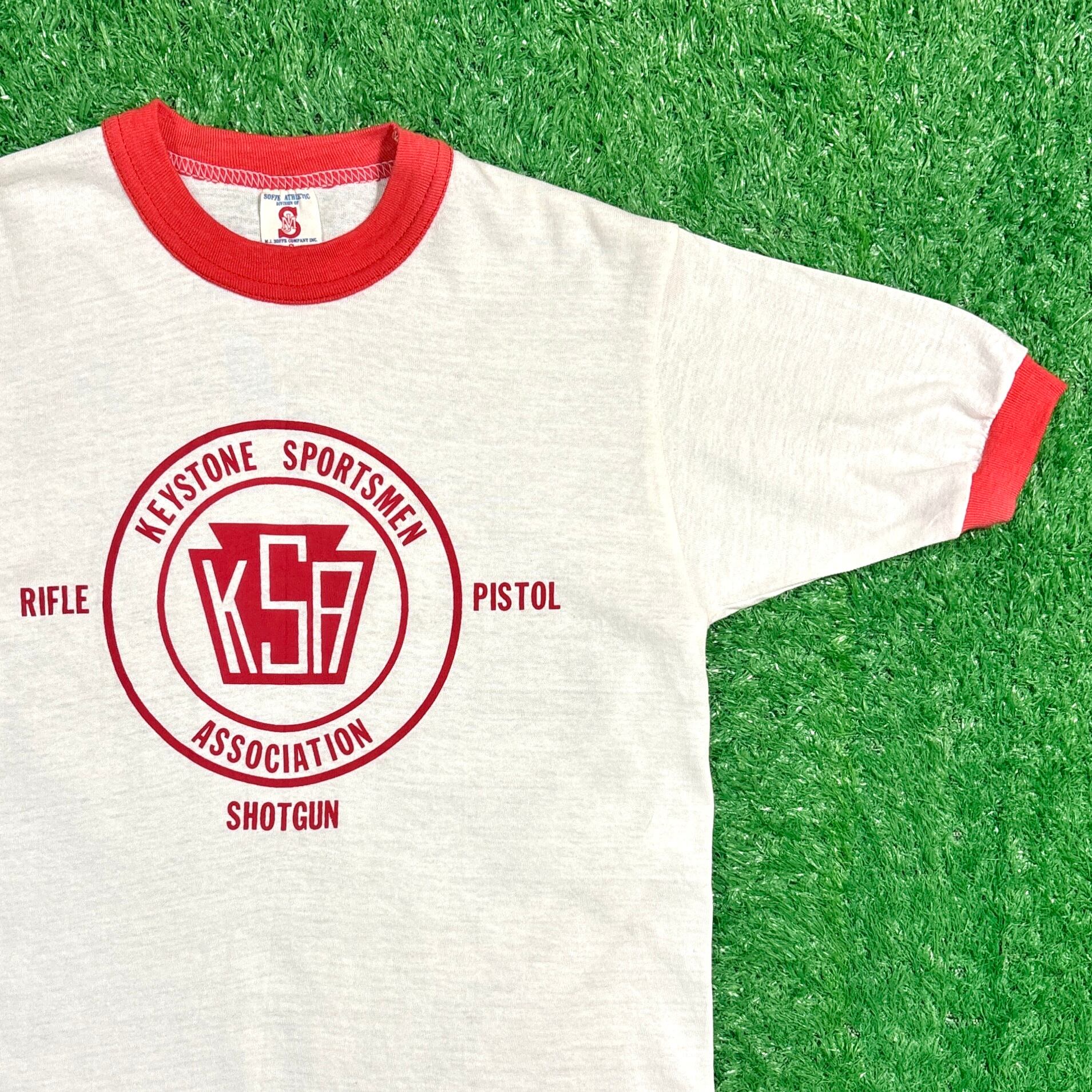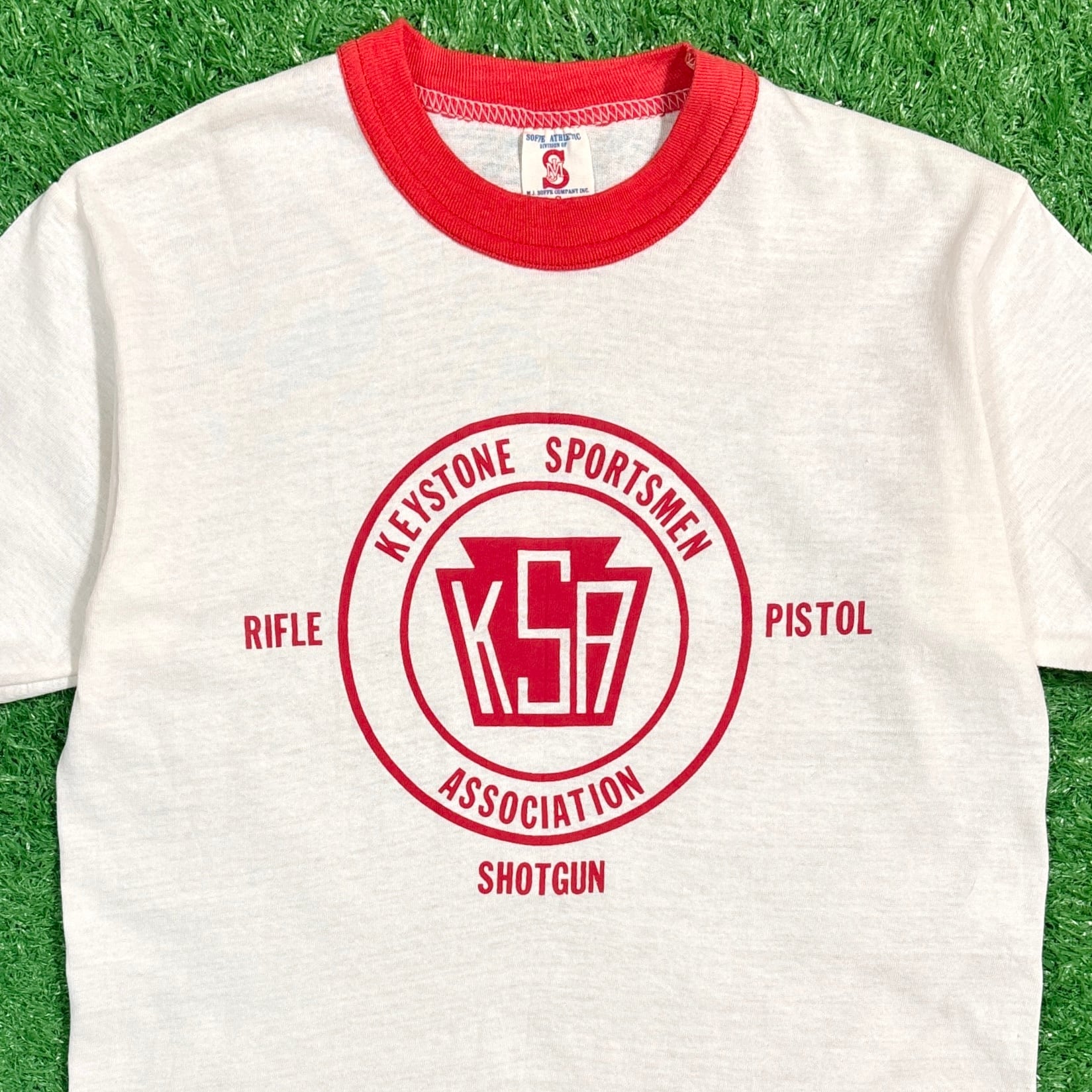 赤いバインダー(襟・袖口)に、胸中央へ Keystone Sportsmen Association(KSA)のラウンドロゴ。ペンシルベニア州の象徴“キーストーン(要石)”をかたどったエンブレムの中にKSAが配され、外周には “RIFLE / PISTOL / SHOTGUN” の文字が入るクラブ物スーベニア。ペンシルベニア州マンシーの老舗射撃クラブ(1968年創設)由来の一枚で、70sらしいレトロな配色とリンガー仕様が雰囲気抜群です。