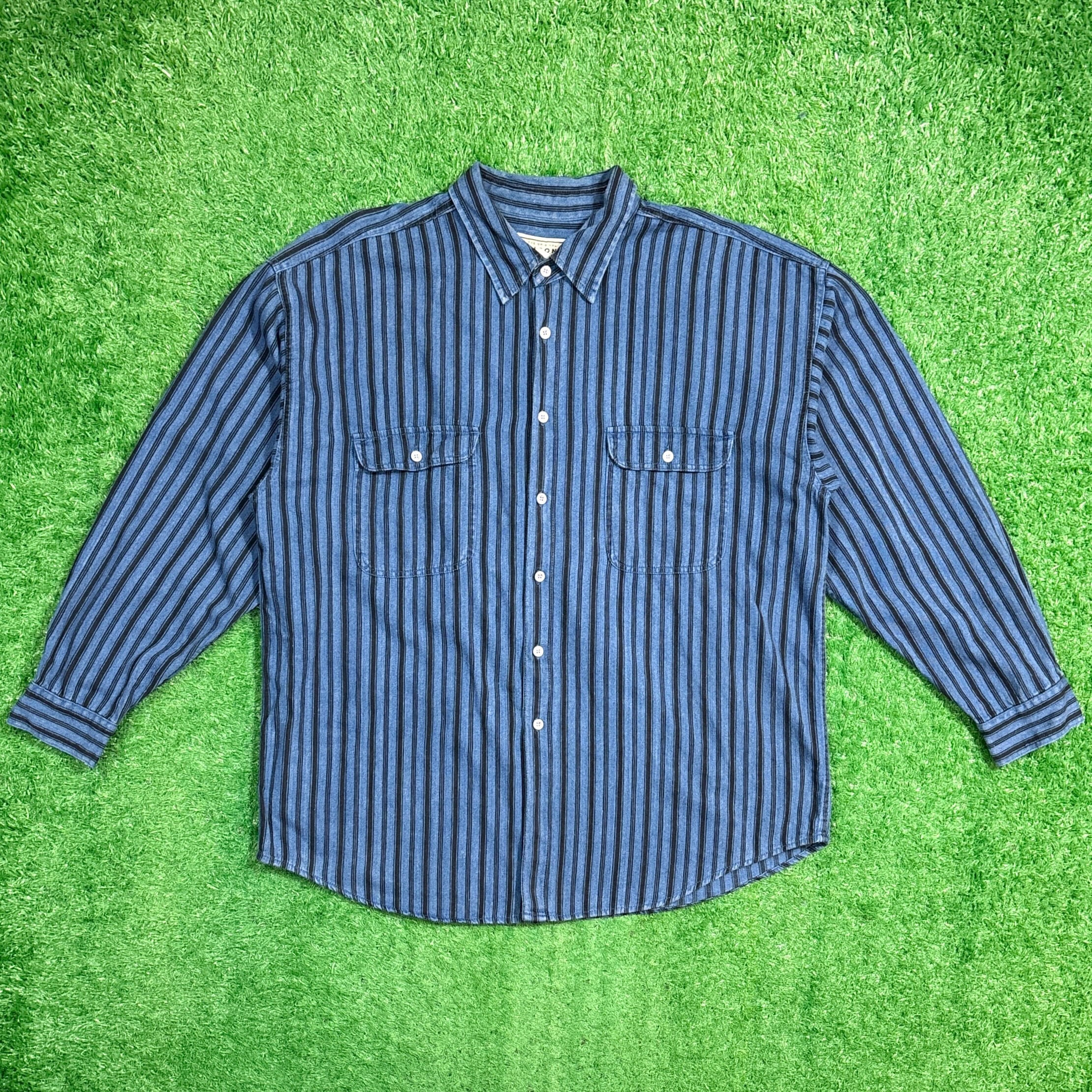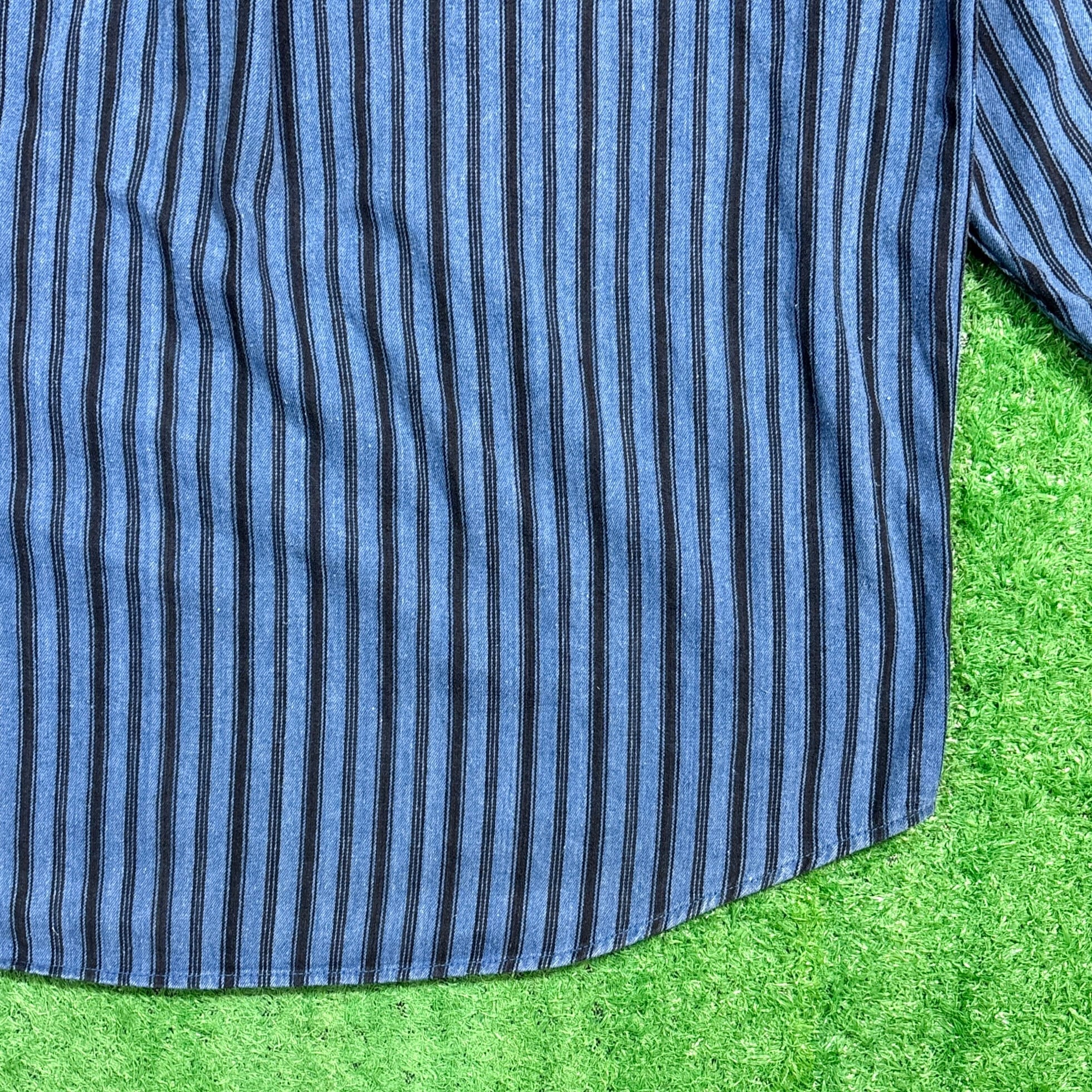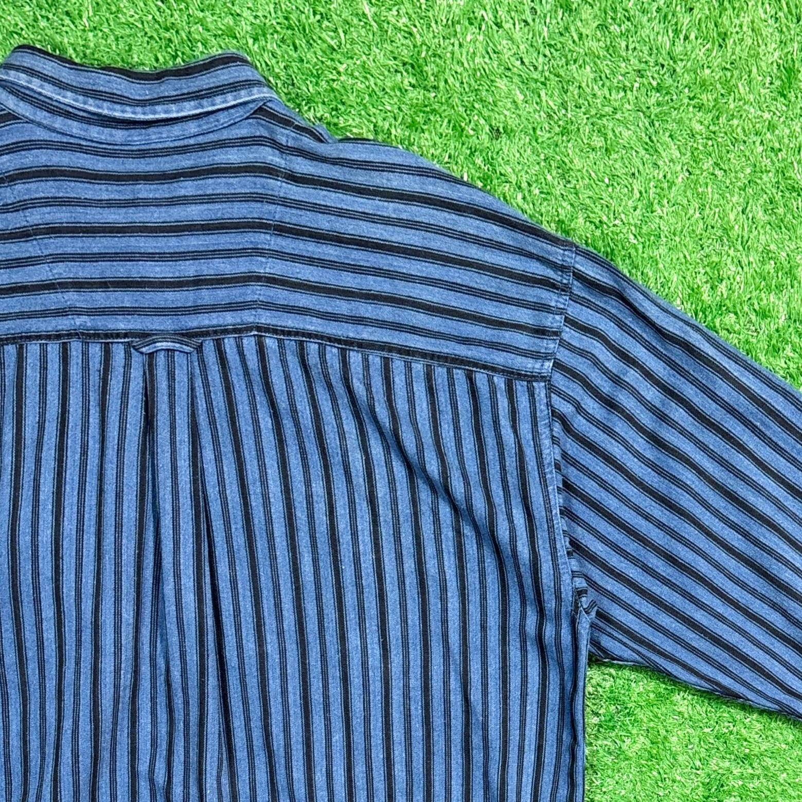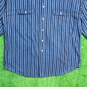 ネイビーカラーをベースにしたストライプ柄で、経年による程よい色落ち感が雰囲気抜群。シンプルながら古着らしい風合いが魅力の一枚です。フロントには両胸ポケット付きで、実用性も兼ね備えています。