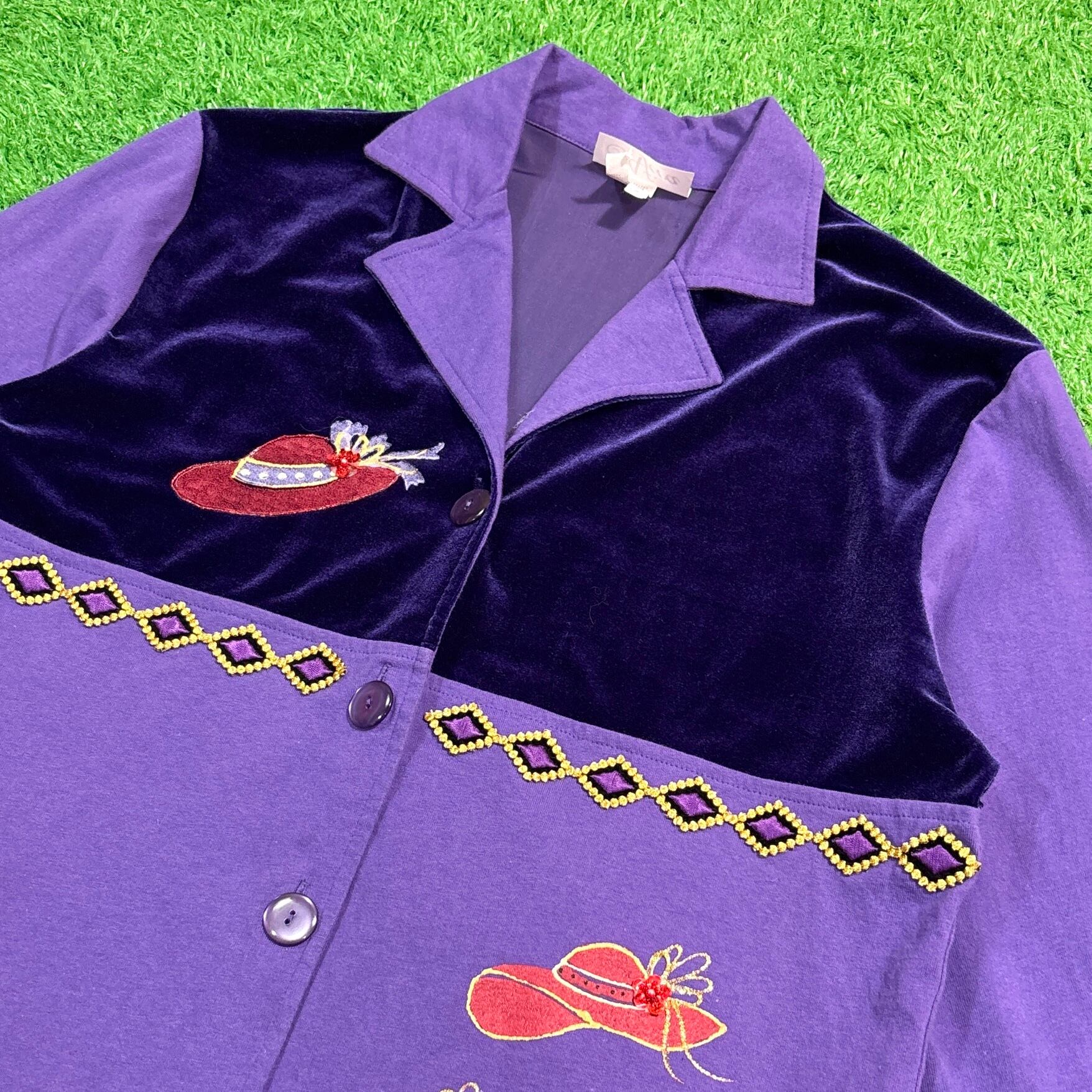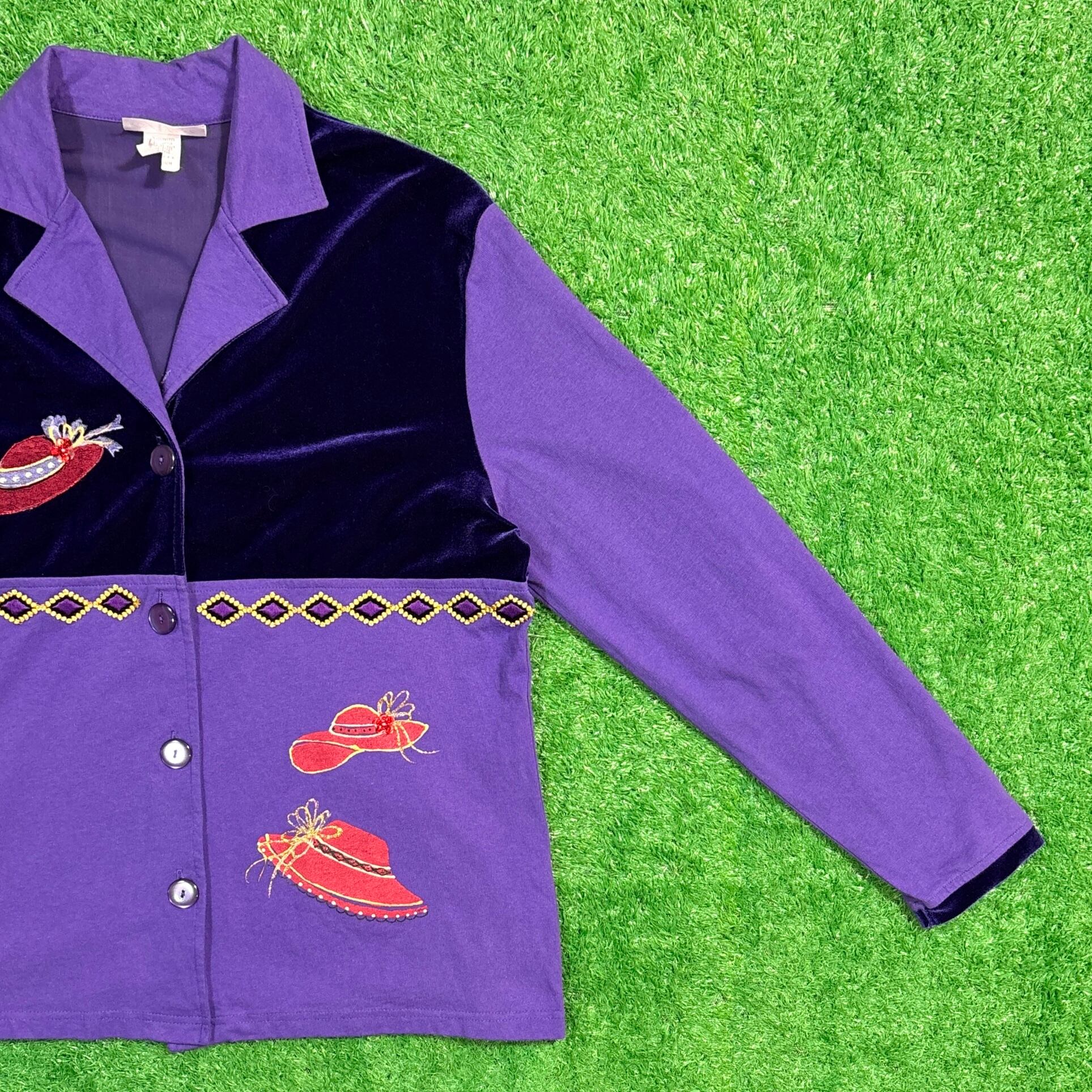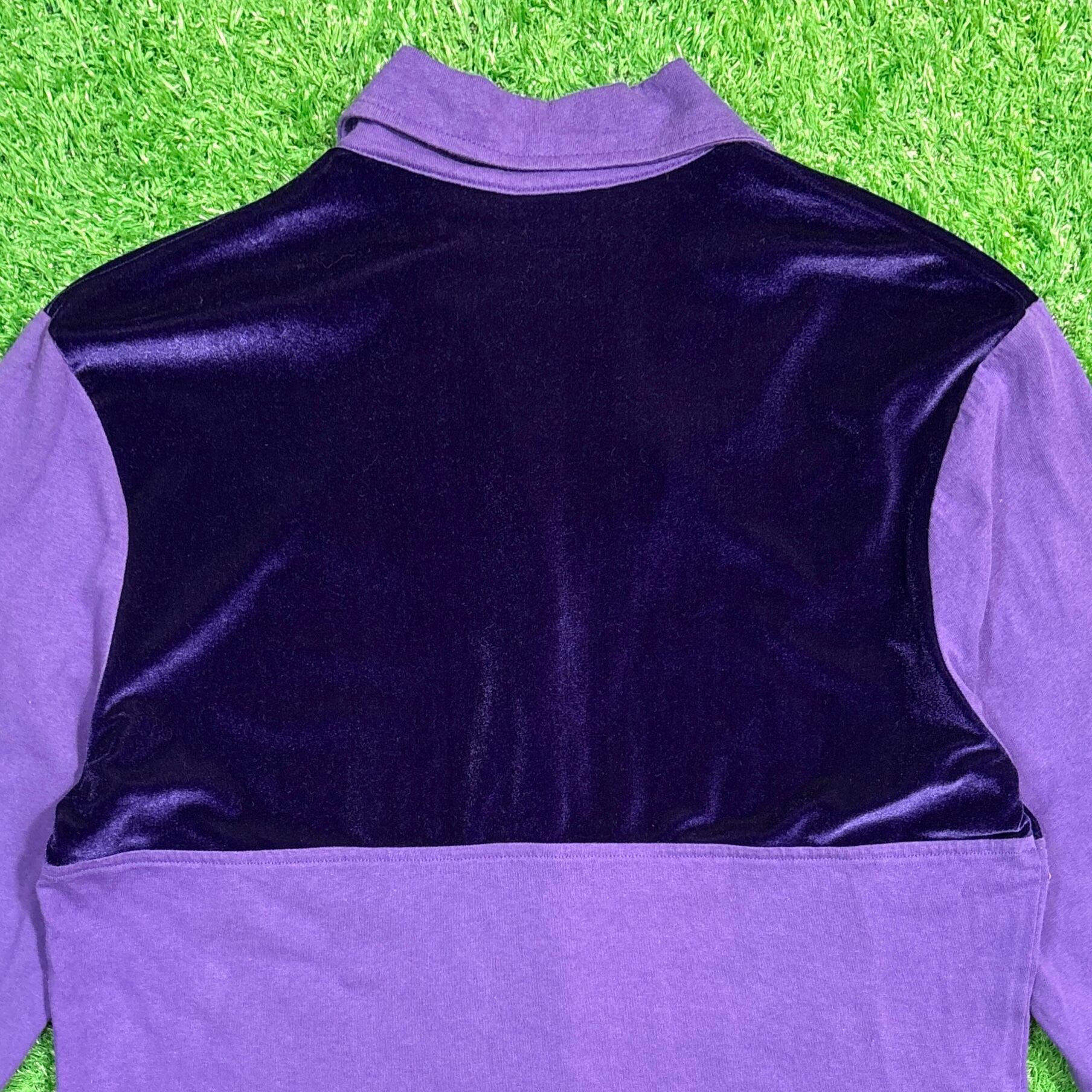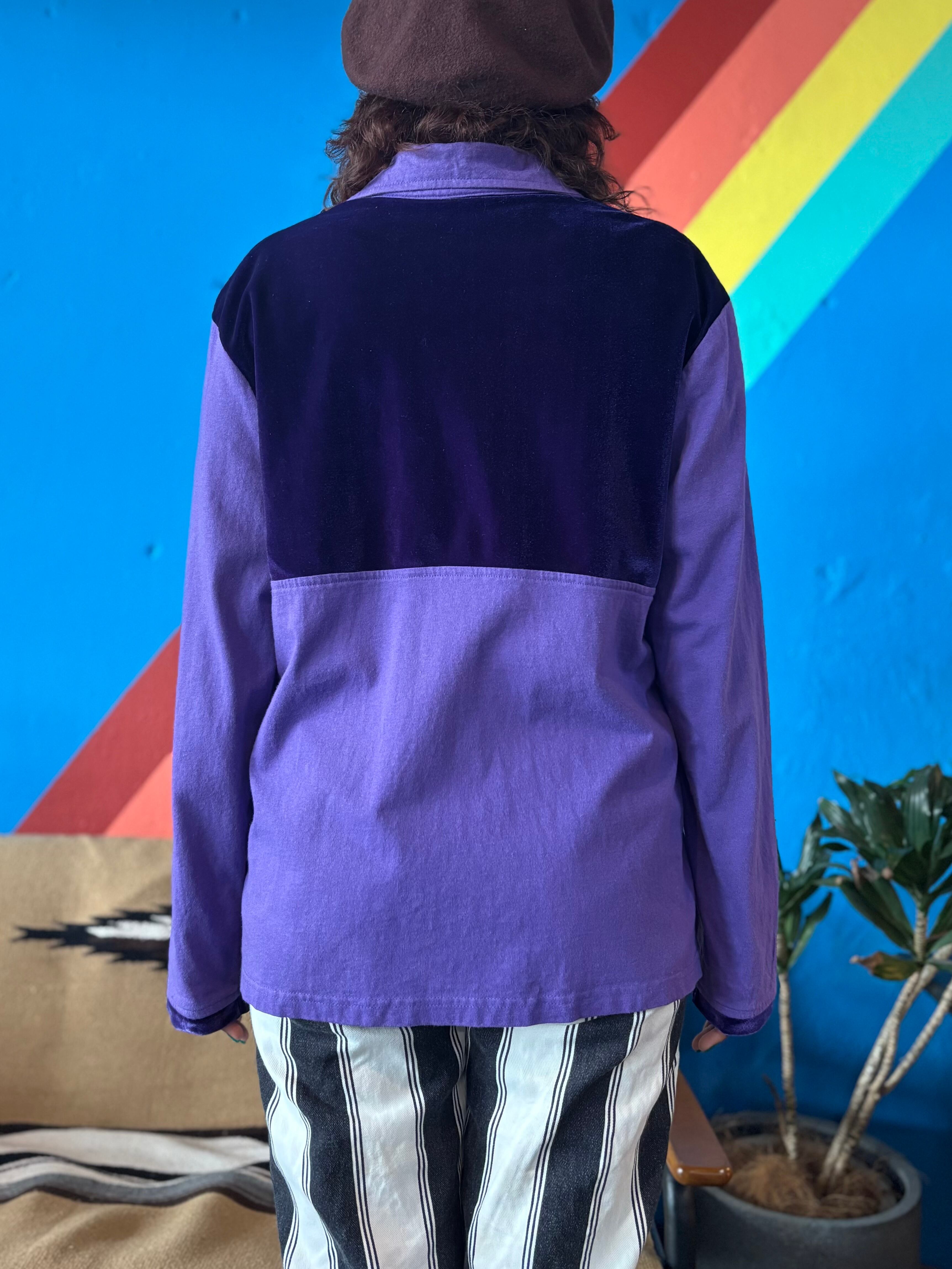 90年代のアメリカ製カットソー素材のシャツジャケットです。肩から胸にかけてはベロア素材で切り替えられており、異素材ミックスが魅力的なデザイン。ボディ部分は厚手のポリコットン系カットソー素材で仕立てられており、柔らかさとしっかりした生地感を兼ね備えています。ポップなペイントデザインやテープデザインも加わり、個性的で遊び心のある雰囲気が楽しめる一枚です。