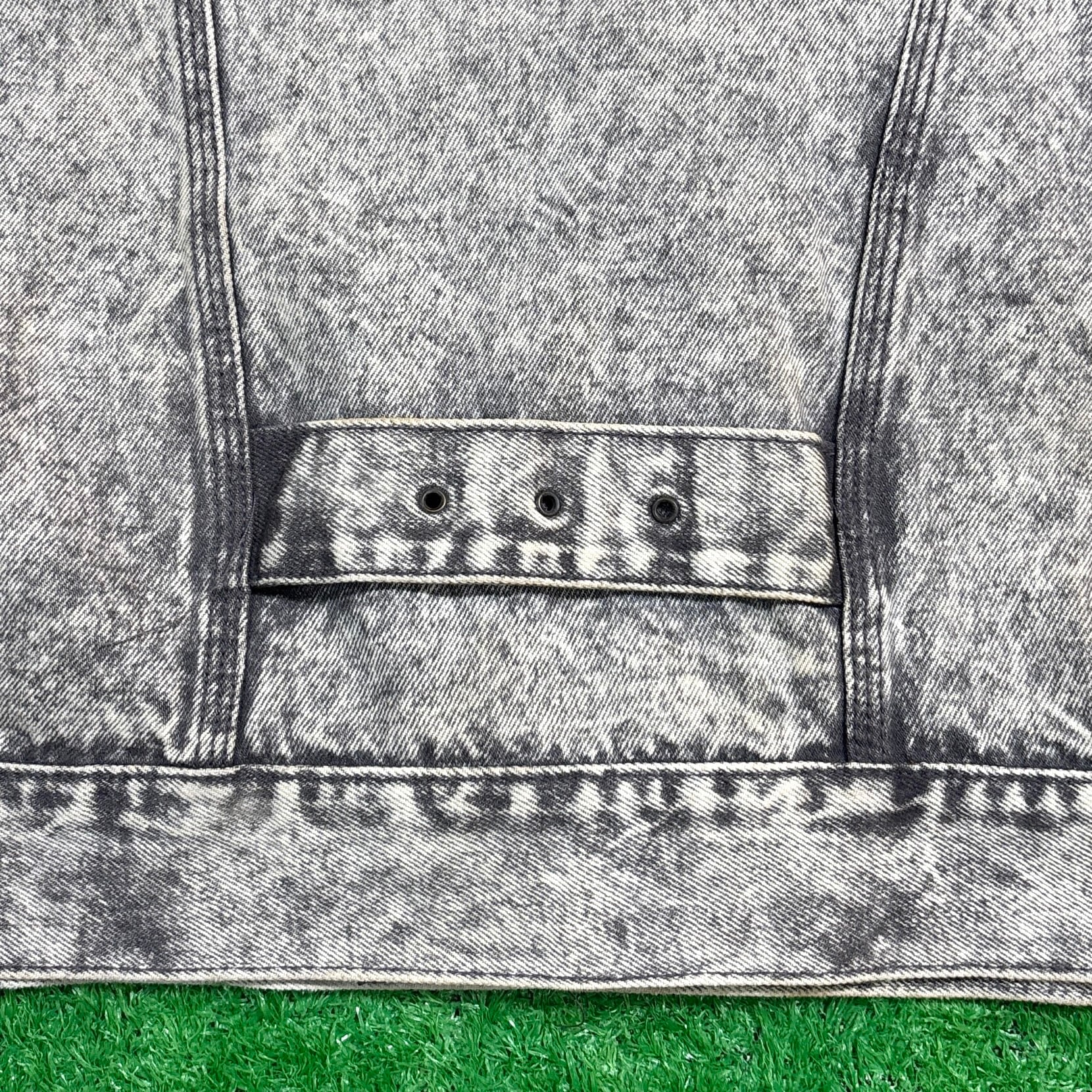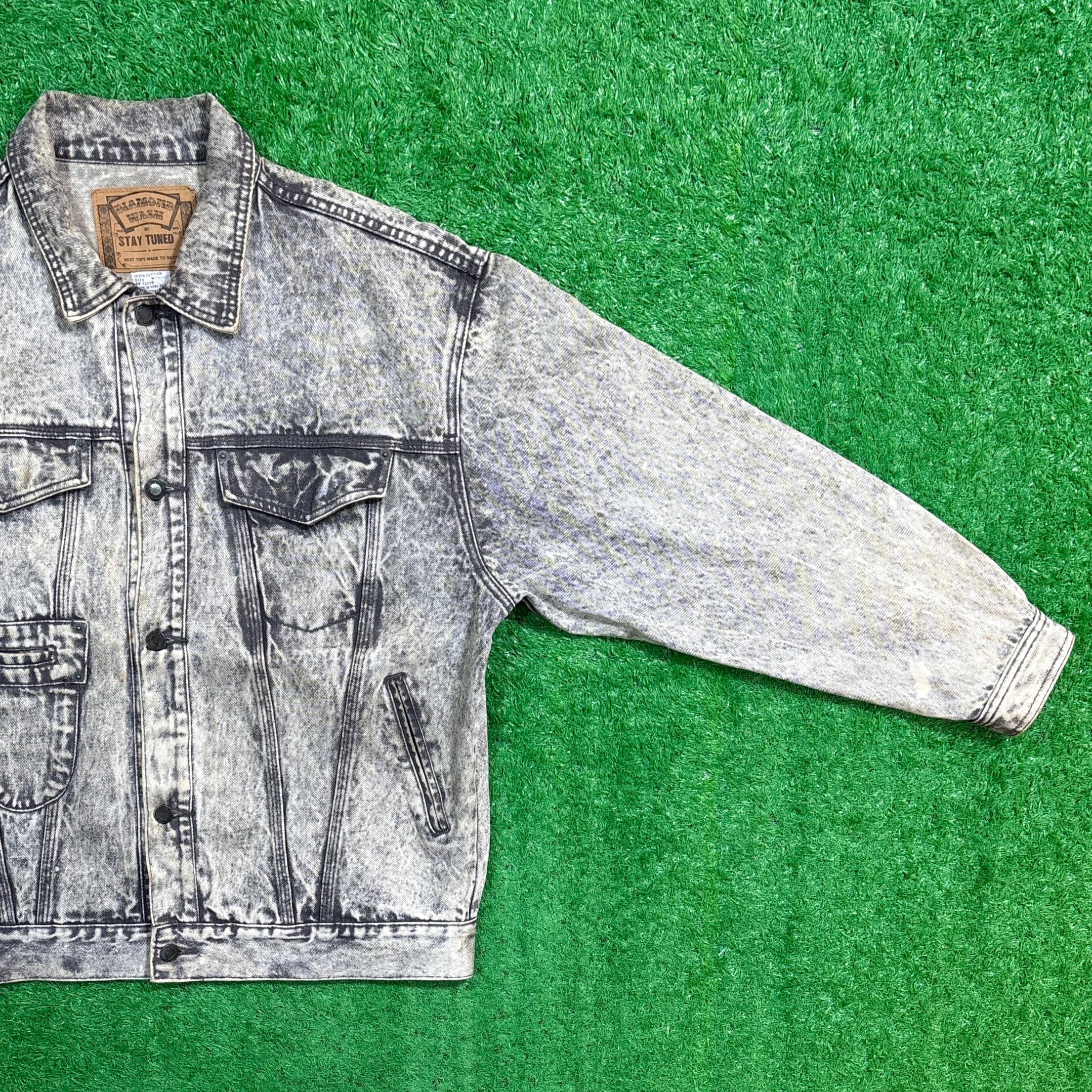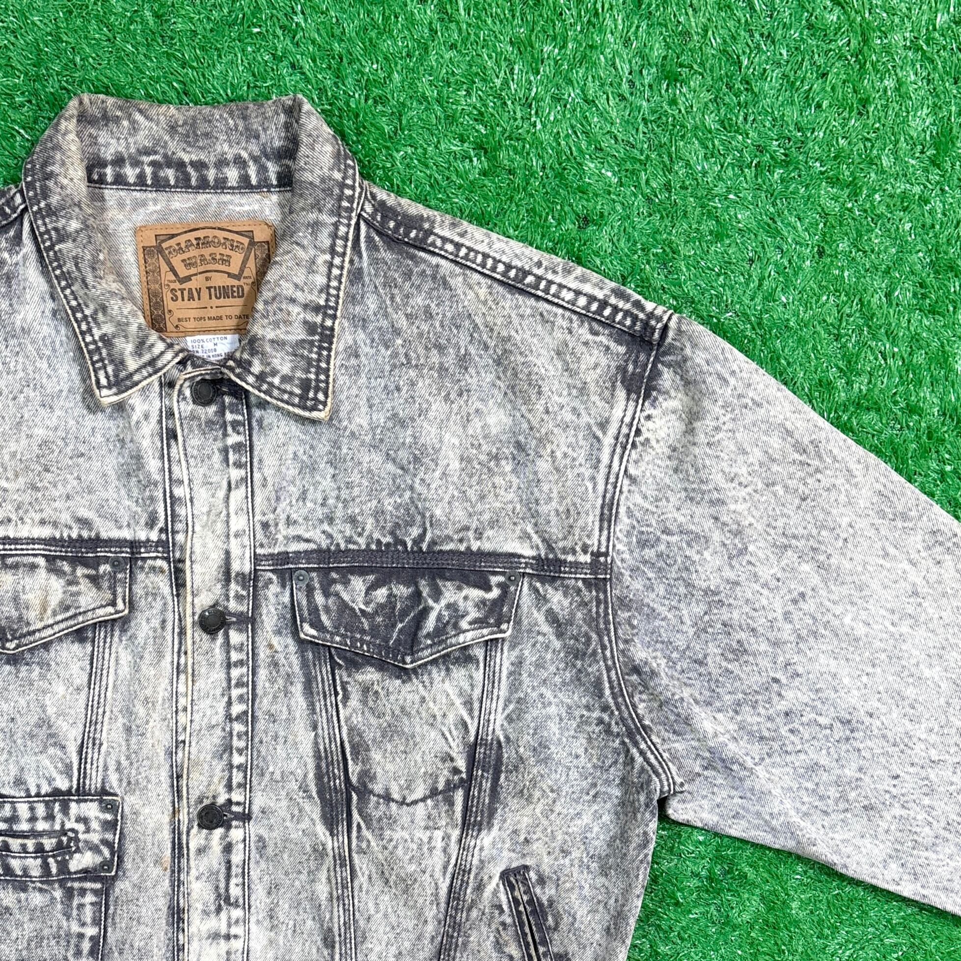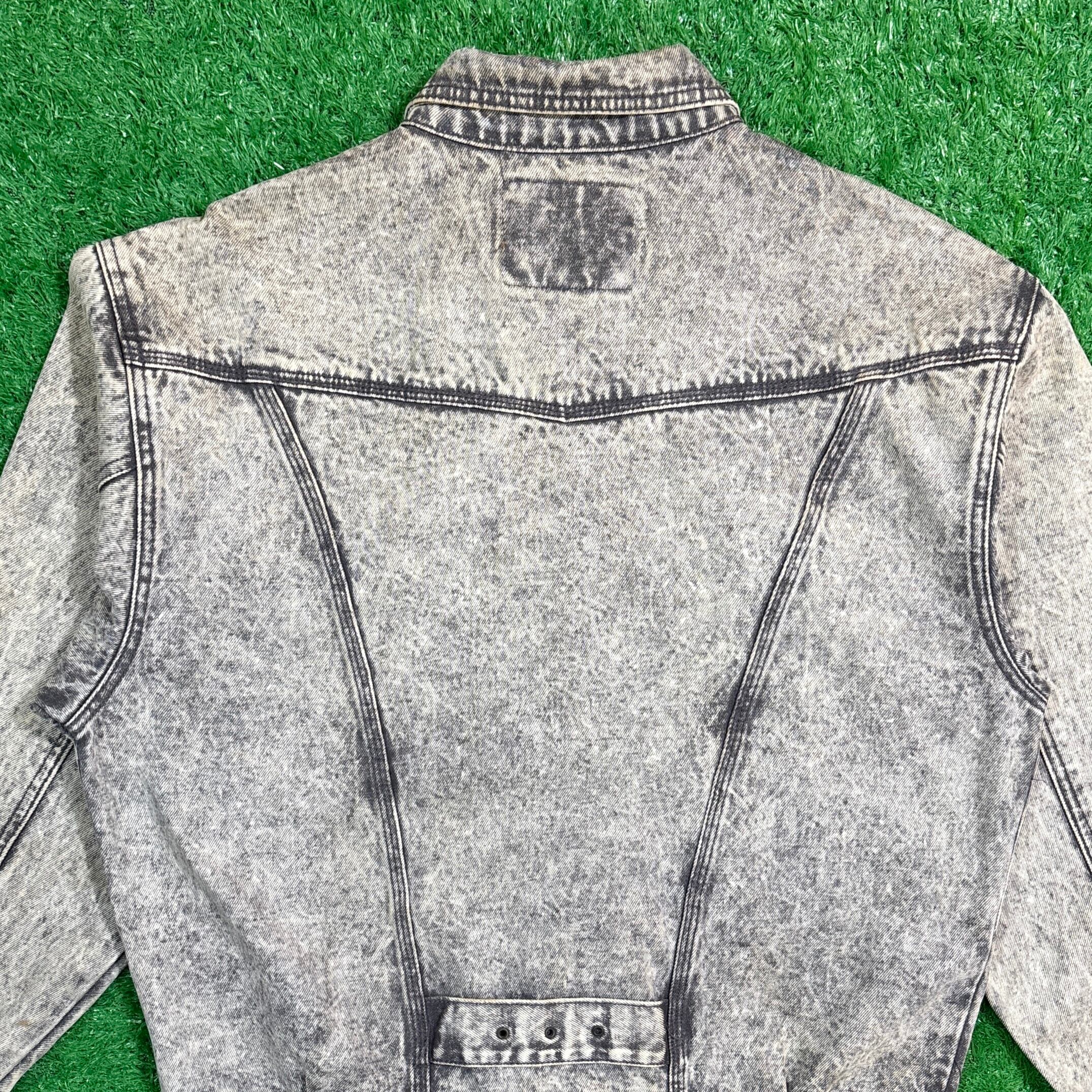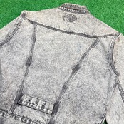 1990年代のケミカルウォッシュ・ブラックデニムジャケットです。独特のムラ感あるケミカルウォッシュが90sらしい存在感を放つ一着。ブラックデニムをベースにしたモノトーン調の色味がしっかり主役になるアイテムです。ややゆとりのあるシルエットで、メンズはもちろんユニセックスでも着用しやすいサイズ感。