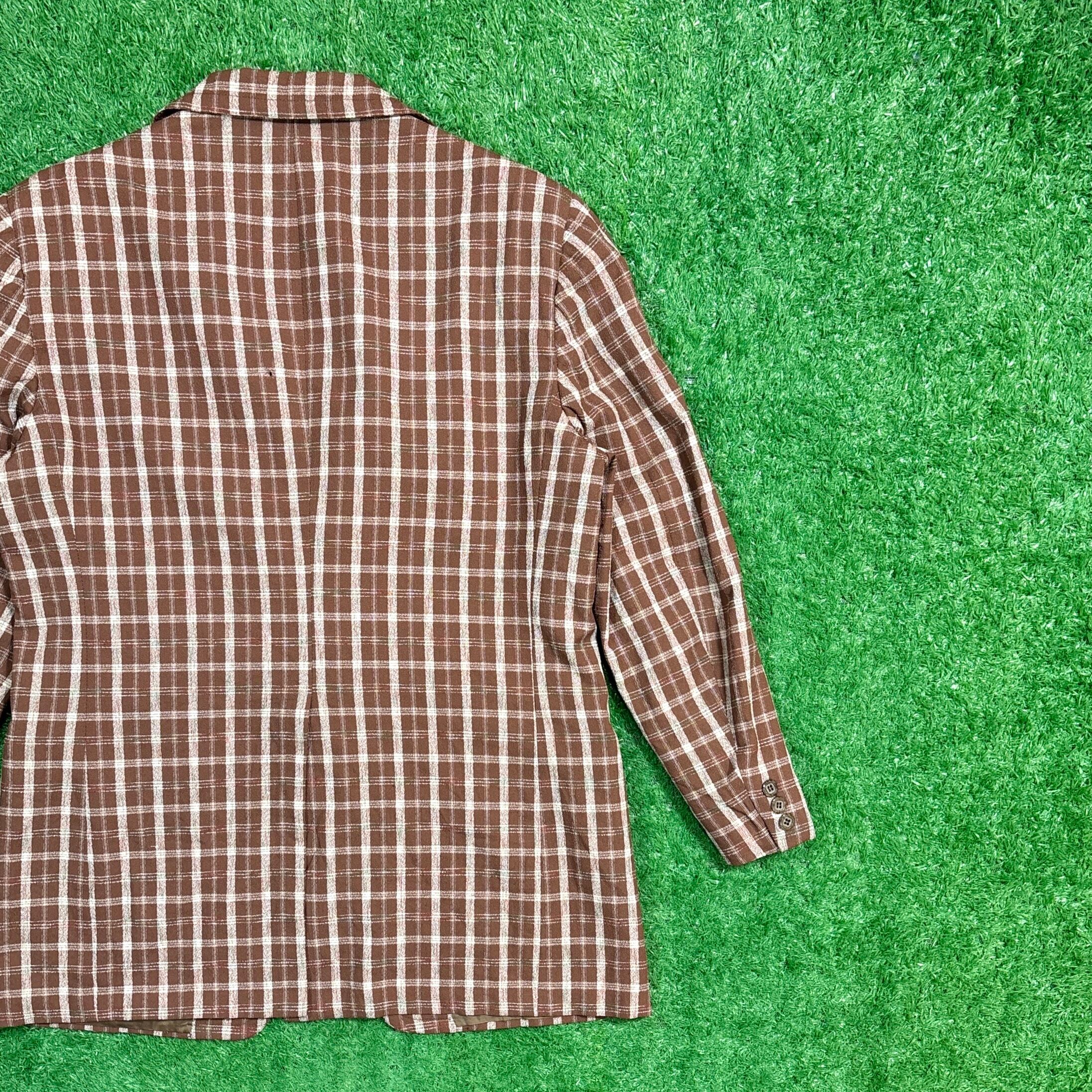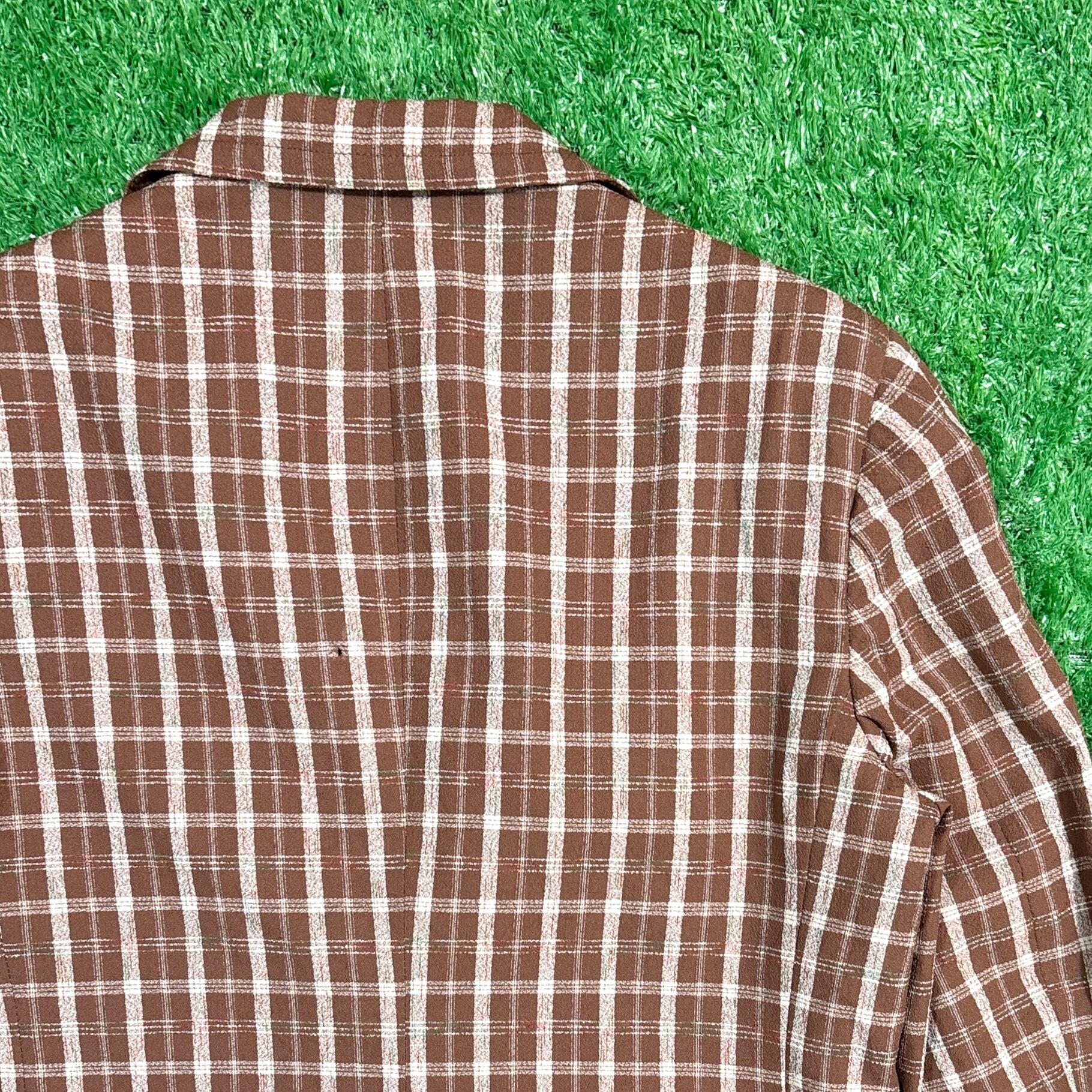 ブラウン系をベースにしたトラッドなチェックパターンが印象的で、ヴィンテージらしい存在感を放つ一着。ややザラっとした軽めの生地感で、春秋シーズンに羽織りやすいライトな着心地です。着丈がしっかりあるため腰下までカバーする長めのシルエットが特徴。やや縦長の印象で大人っぽく着られます。