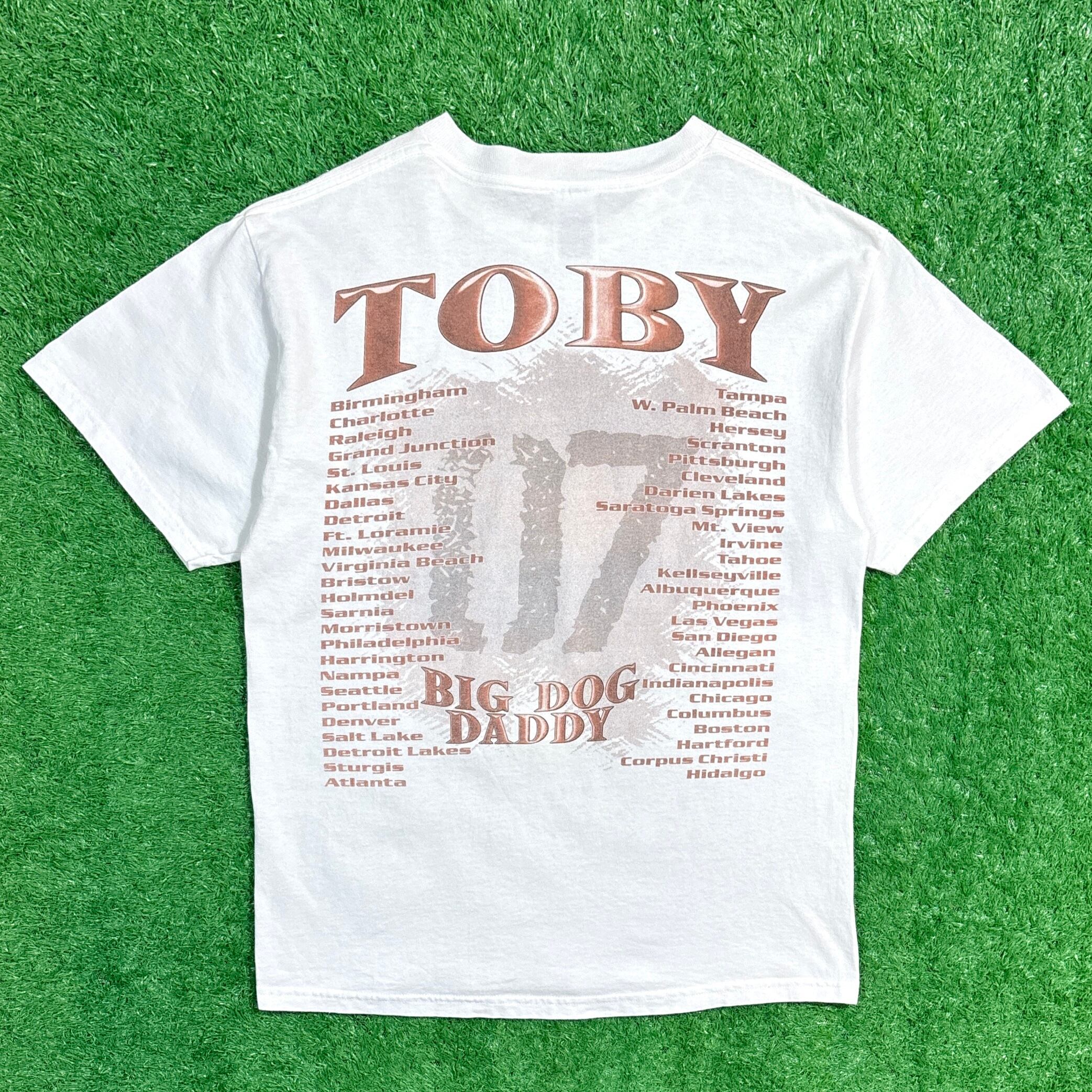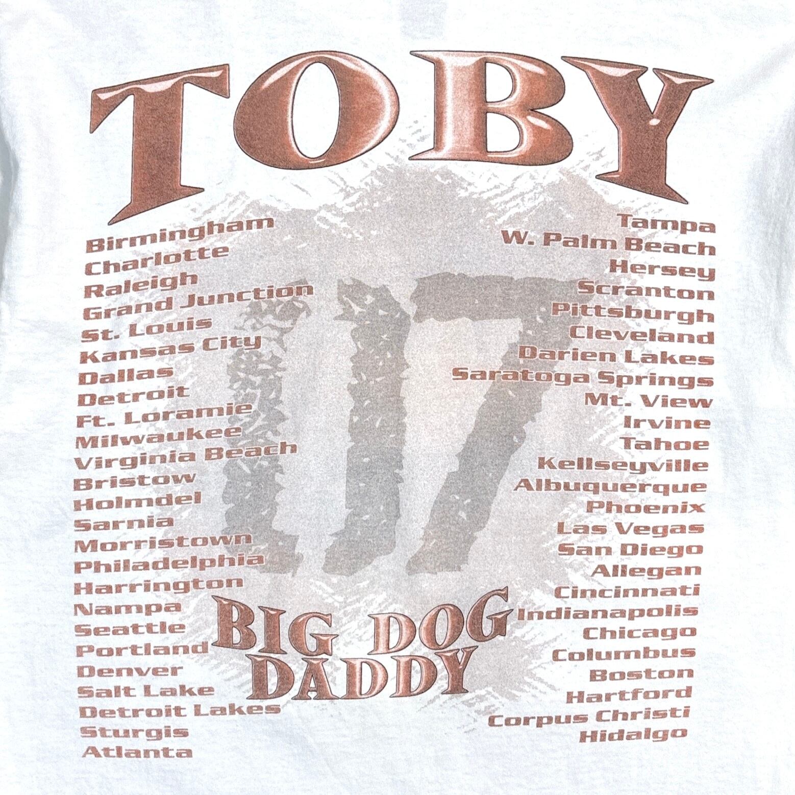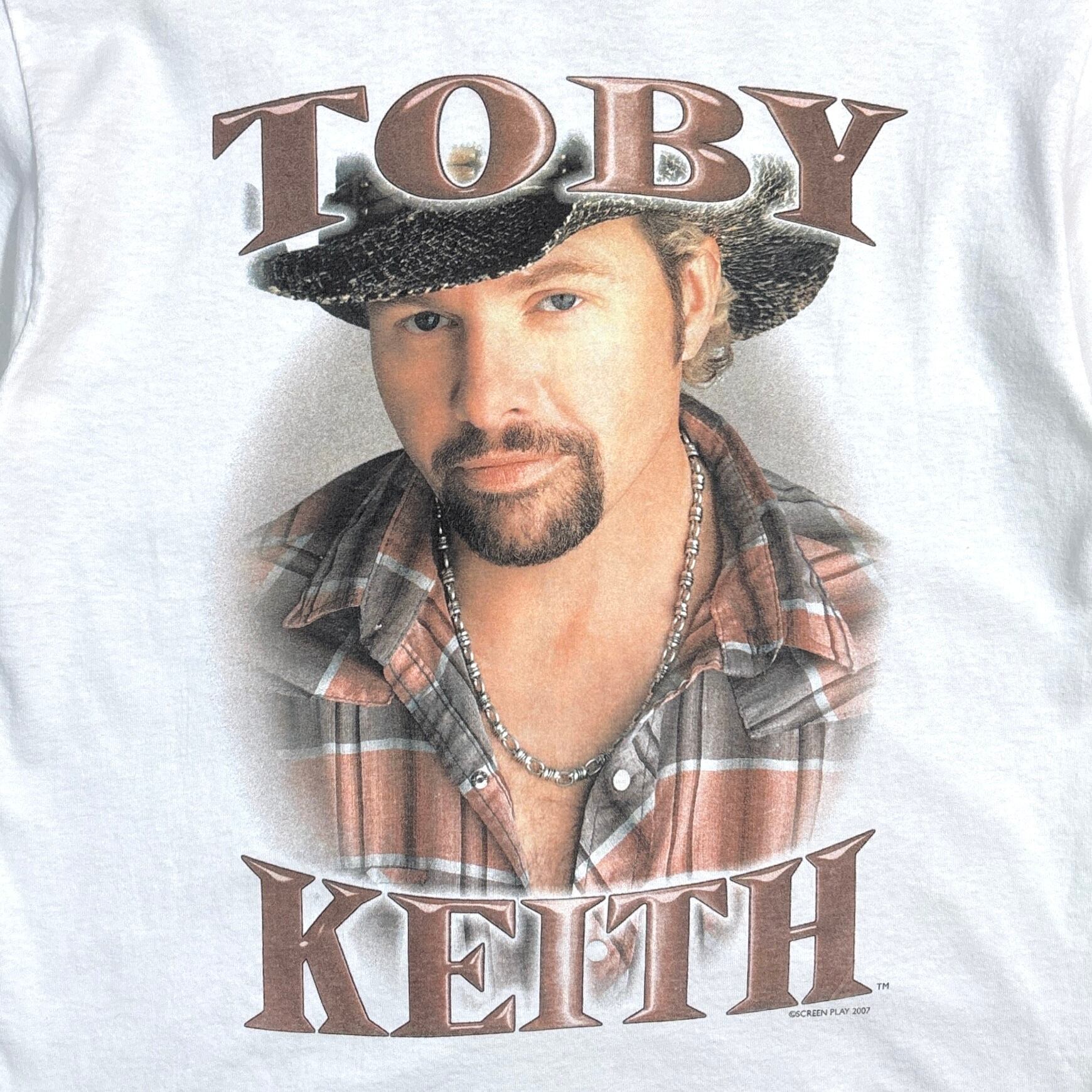 フロントにはトビー・キース本人のポートレートが大きくプリントされ、バックには「BIG DOG DADDY TOUR '07」の文字と全ツアー開催地がずらりと並ぶツアー日程デザイン。愛国的で力強い歌声が特徴のアメリカを代表するカントリーシンガーとして知られる彼の2000年代の音楽シーンを象徴するメモリアルなアイテムです。