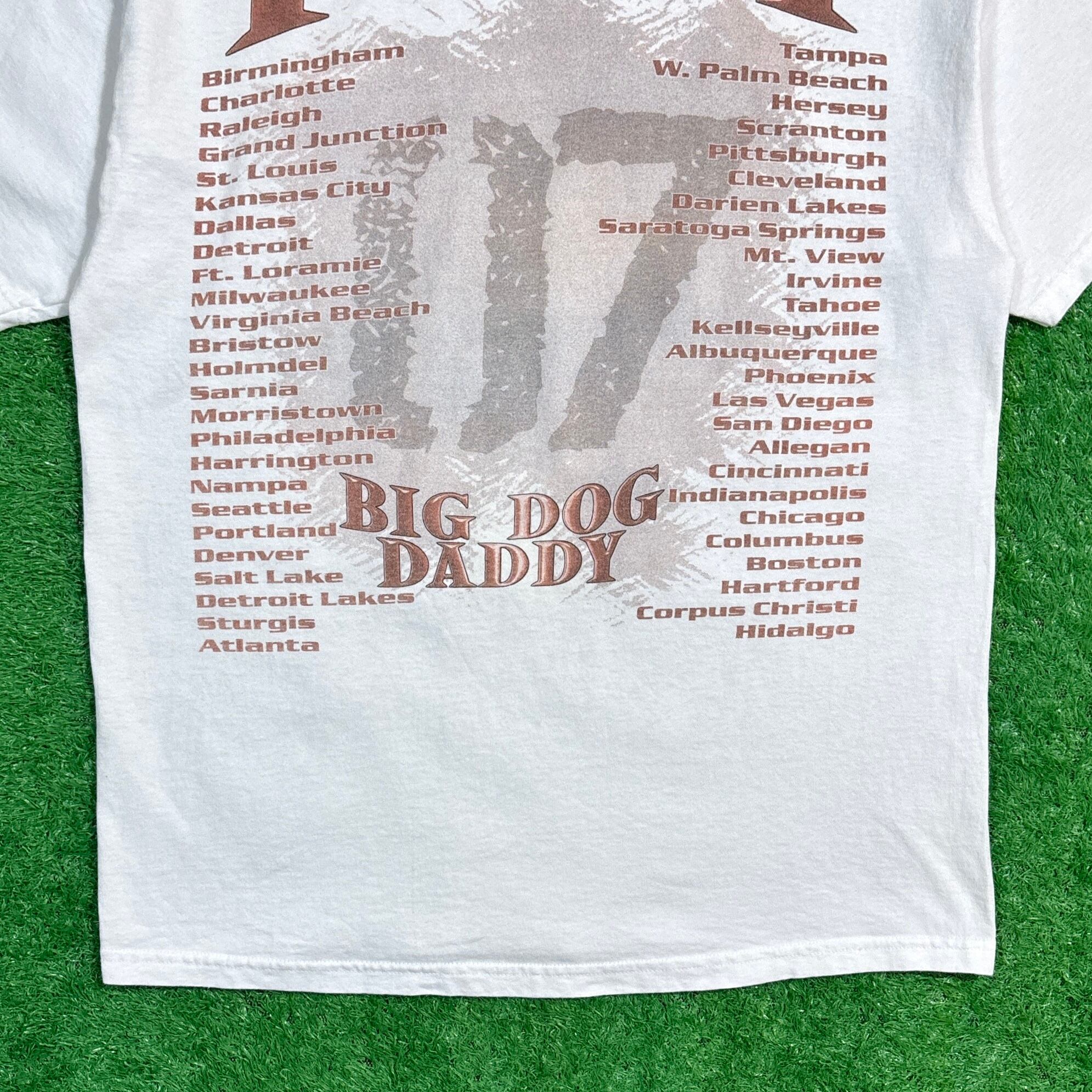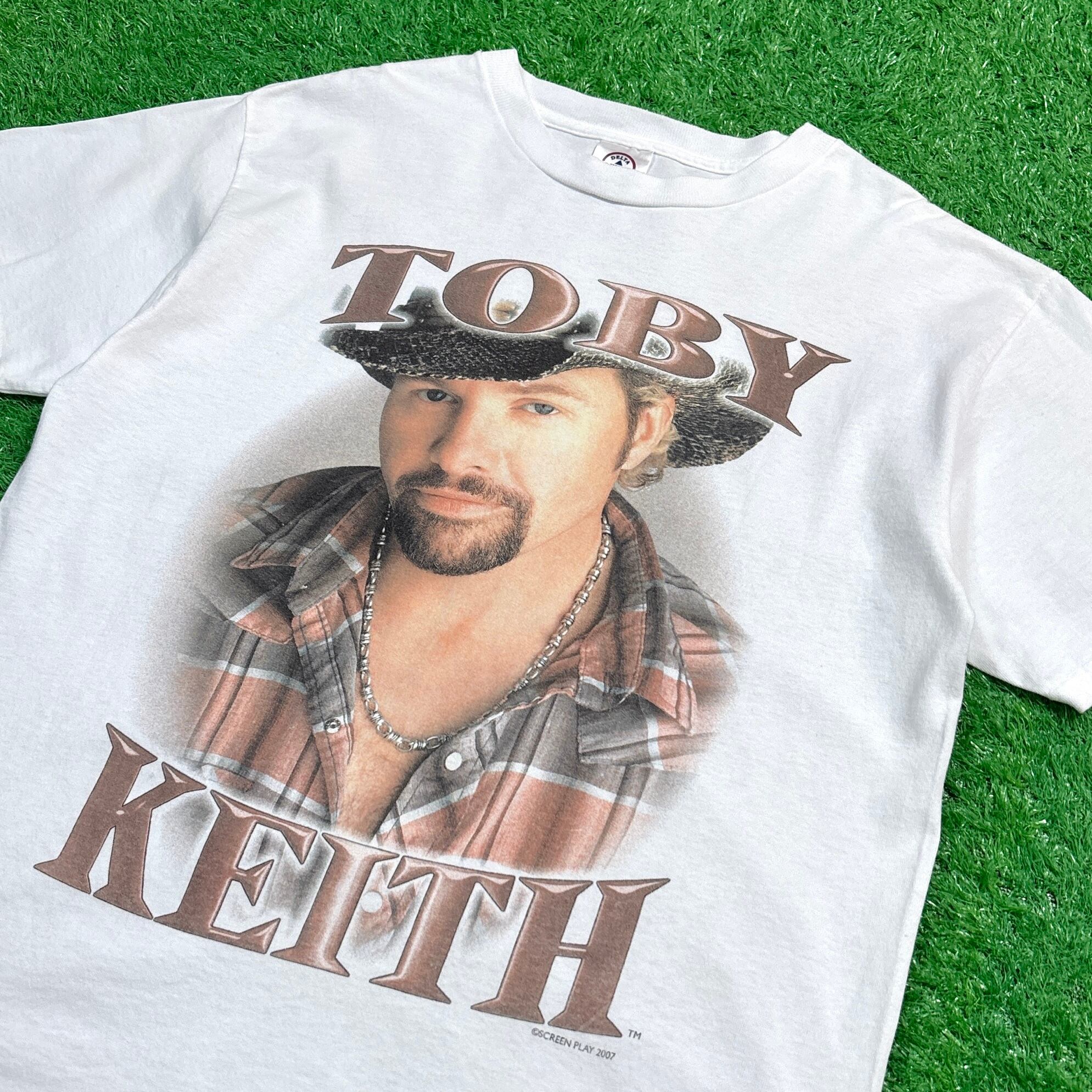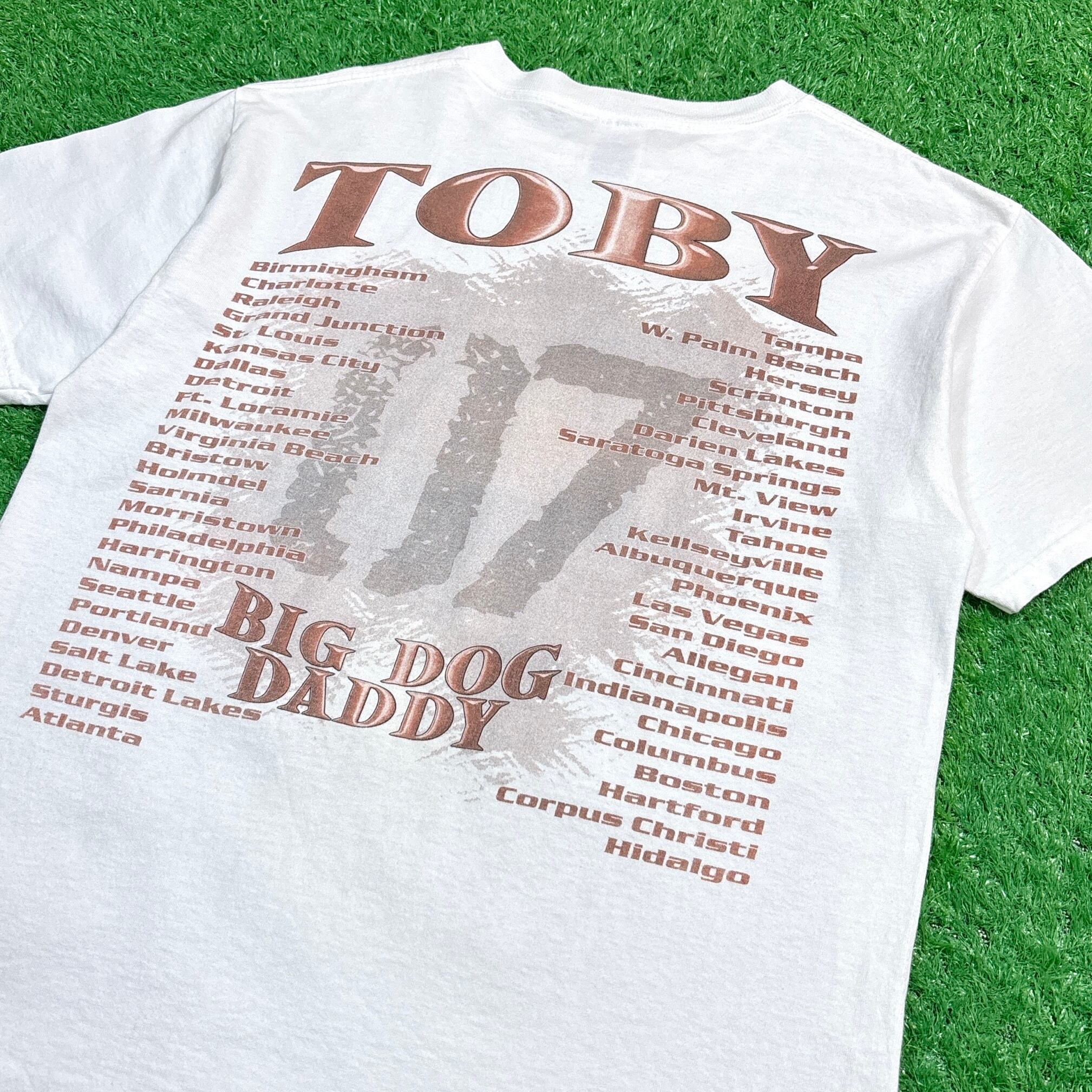 フロントにはトビー・キース本人のポートレートが大きくプリントされ、バックには「BIG DOG DADDY TOUR '07」の文字と全ツアー開催地がずらりと並ぶツアー日程デザイン。愛国的で力強い歌声が特徴のアメリカを代表するカントリーシンガーとして知られる彼の2000年代の音楽シーンを象徴するメモリアルなアイテムです。