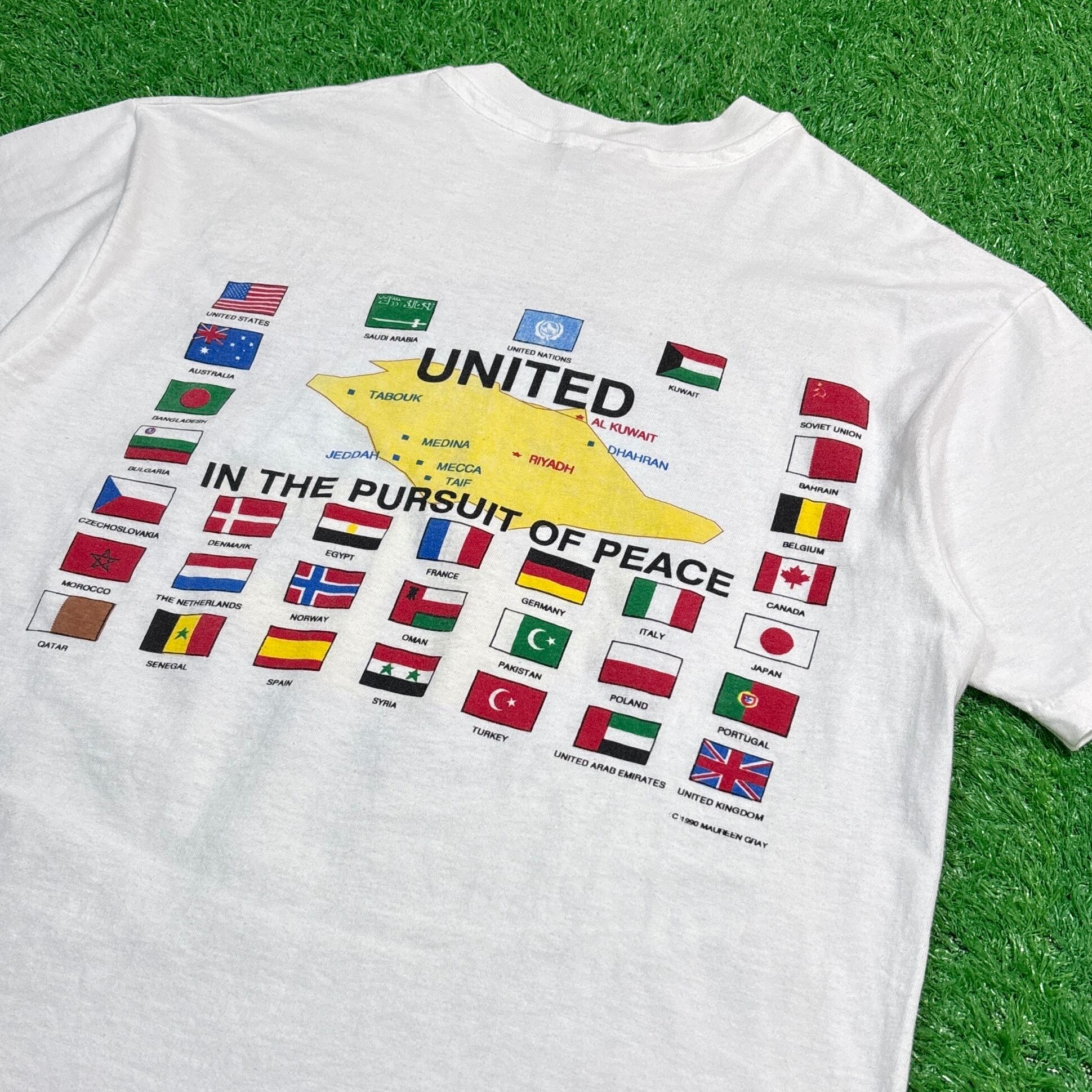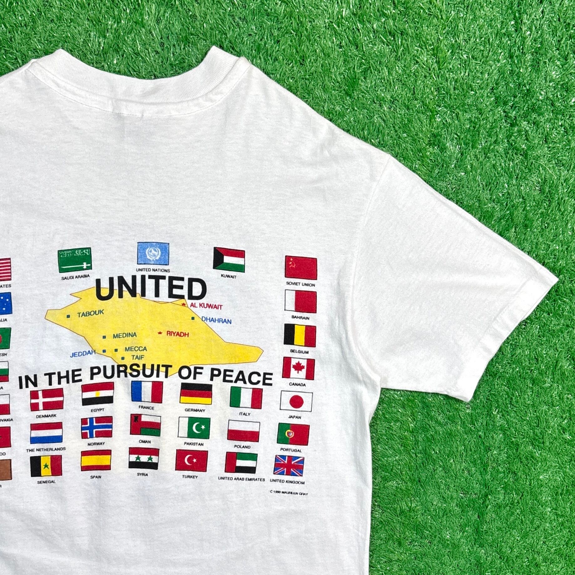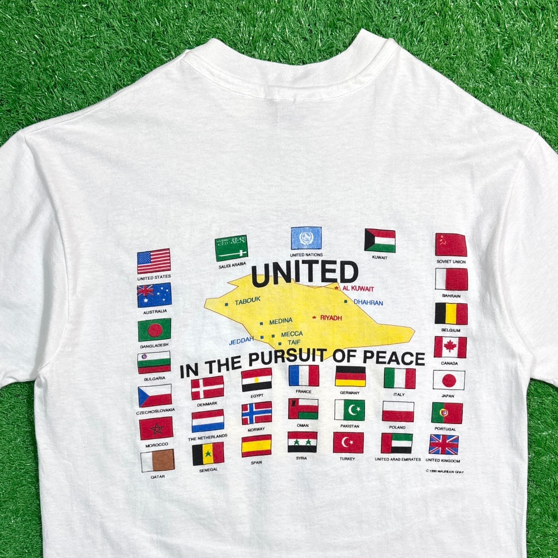 フロントにはパームツリーと戦車、戦闘機のシルエットを配した公式エンブレム風デザイン。背面には多国籍軍に参加した各国の国旗と「UNITED IN THE PURSUIT OF PEACE」のメッセージが並びます。湾岸戦争(1990–1991年)において、クウェート侵攻後に多国籍軍が展開した軍事作戦「デザートシールド(砂漠の盾作戦)」を記念したアイテムです。