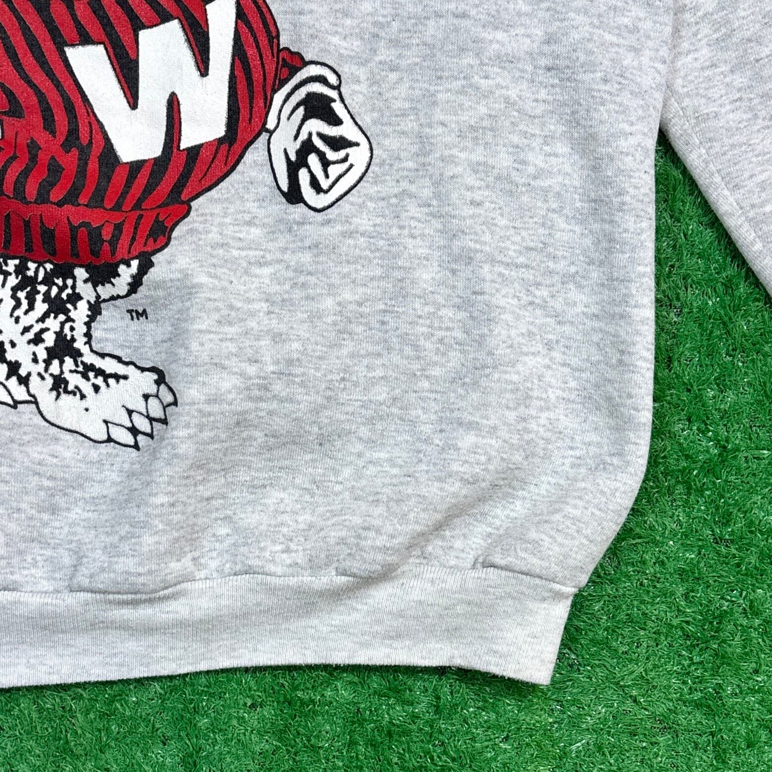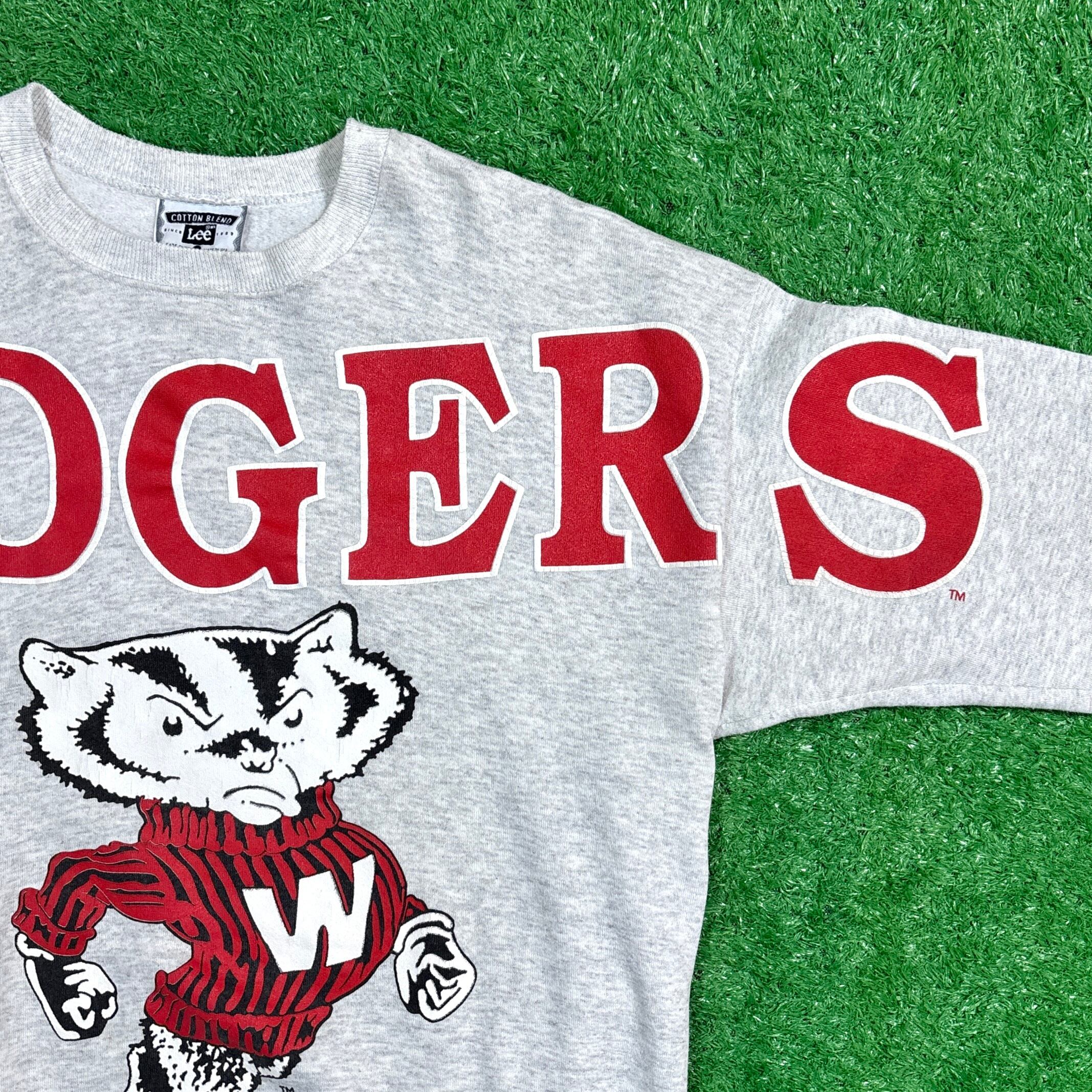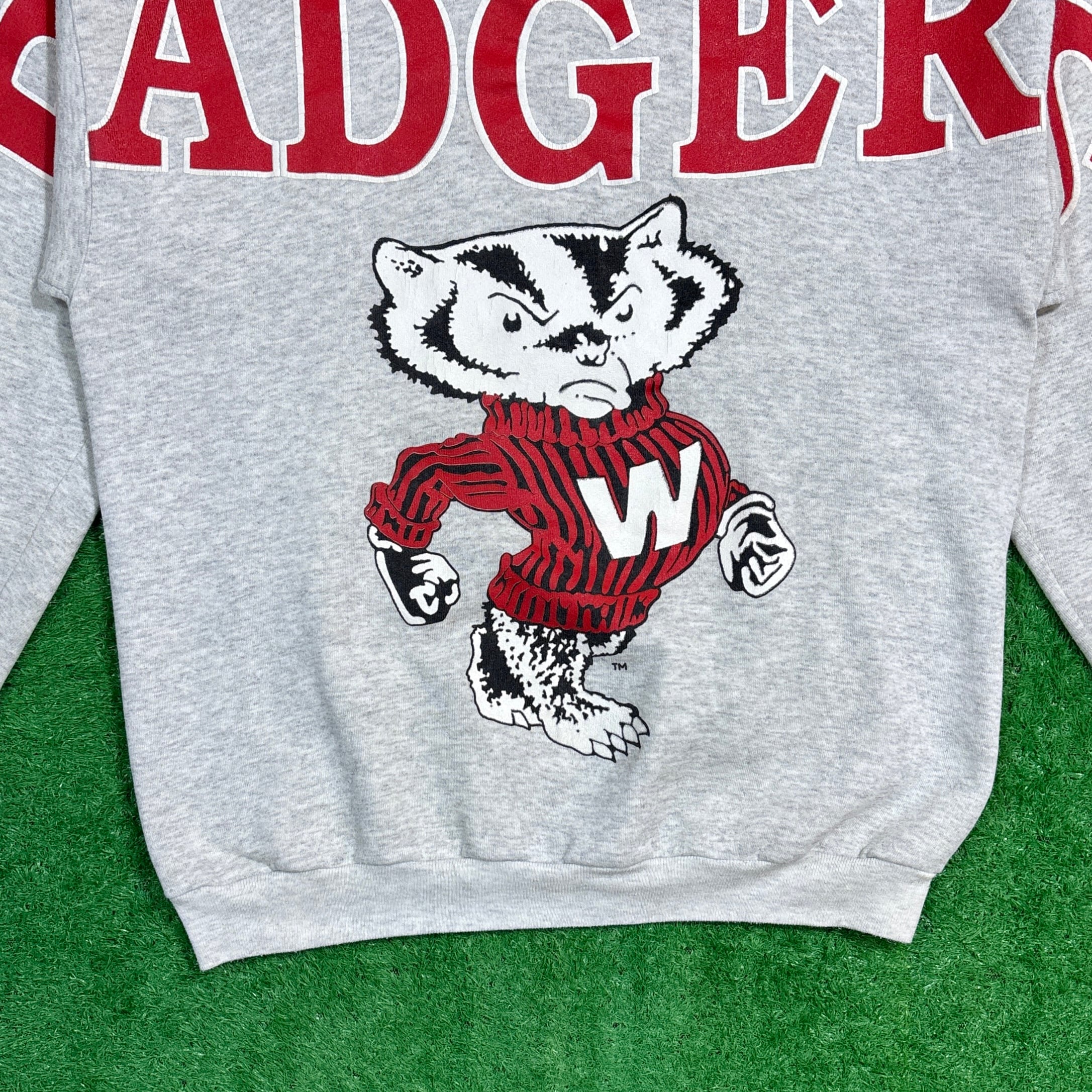 1990年代のアメリカ製、ウィスコンシン大学「BADGERS(バッジャーズ)」チームロゴスウェットシャツです。フロントにはマスコット「Bucky Badger(バッキー・バッジャー)」と、両袖まで大きく入った“BADGERS”ロゴがインパクト抜群。大学スポーツチーム(アメリカンフットボールをはじめバスケットボール、アイスホッケーなど)を象徴するデザインで、カレッジアイテムらしい雰囲気が楽しめます。