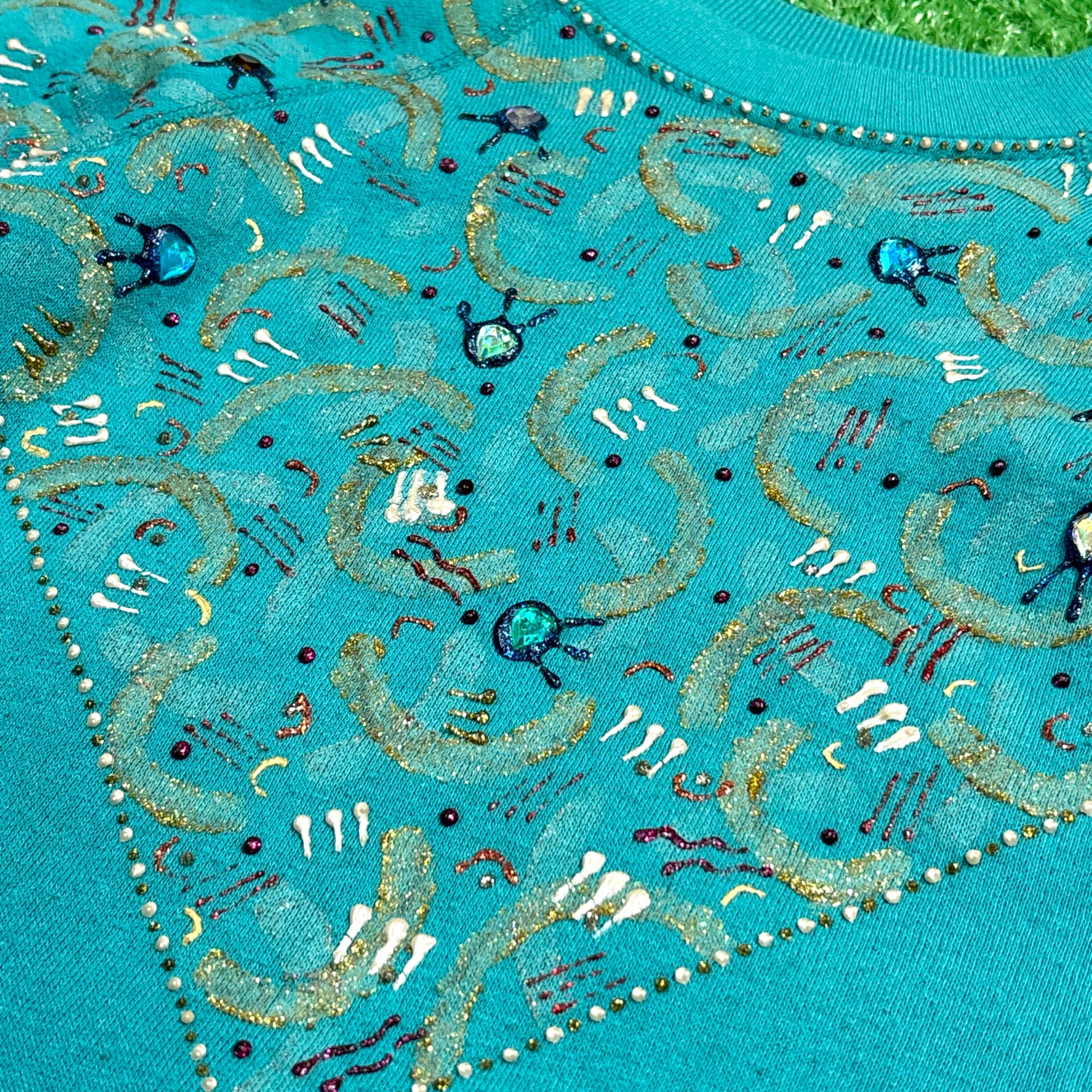 ターコイズブルーのボディに、胸元から肩にかけて施されたビジューのデザインが華やかで、80sらしいゴージャスな印象。細部までこだわりを感じさせる一枚です。存在感のあるデザインながらデイリーに取り入れやすいアイテムです。