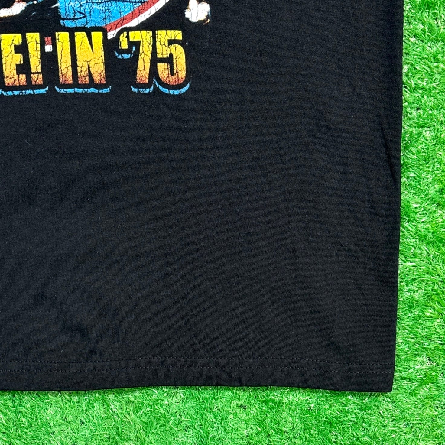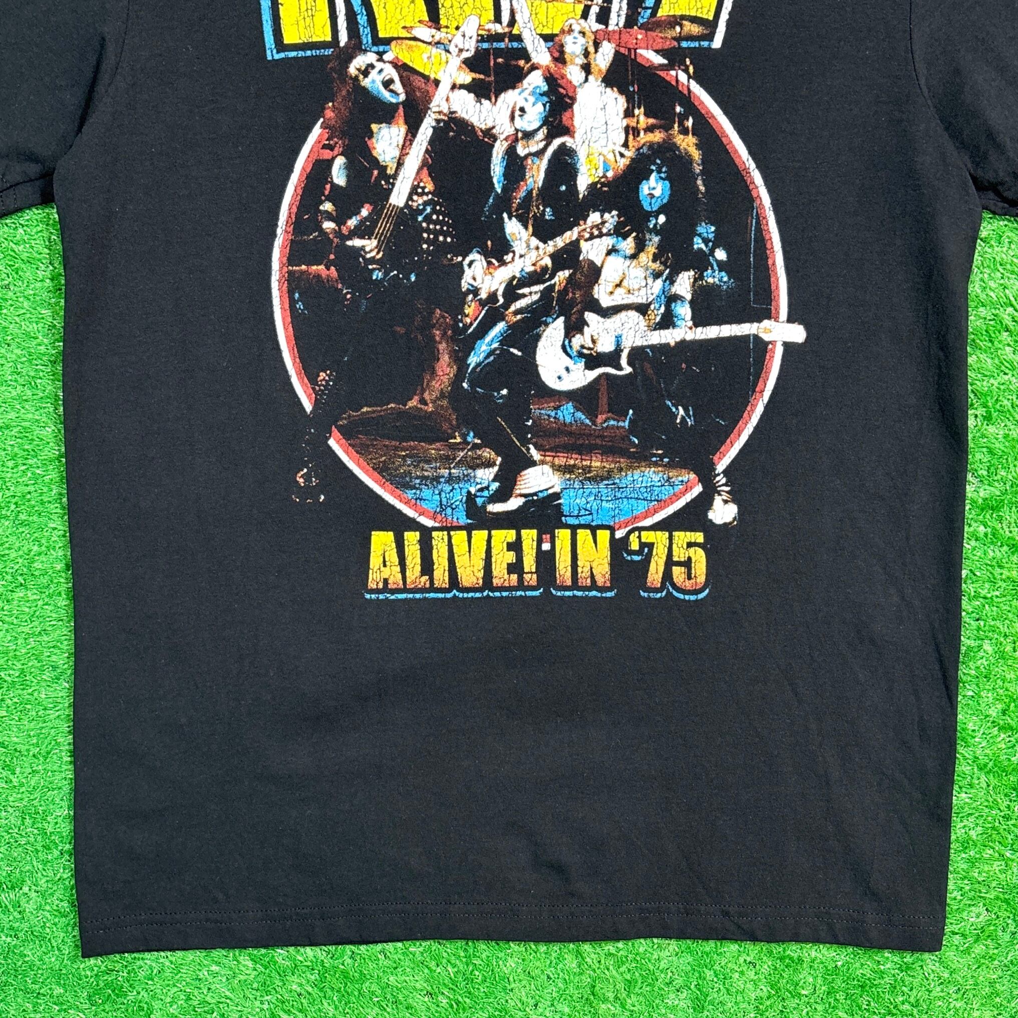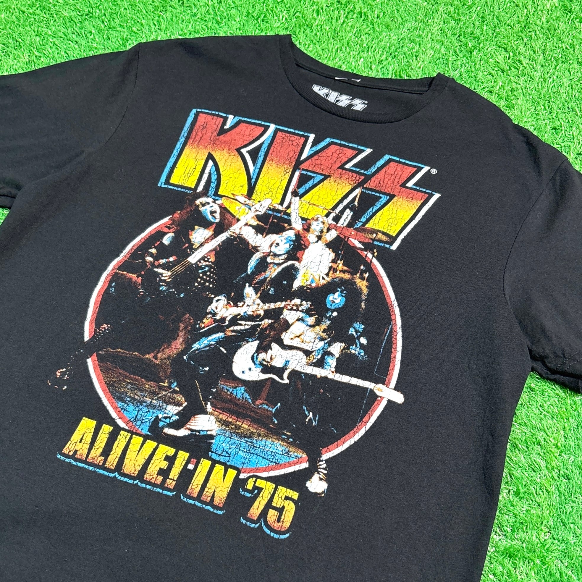 フロントには代表的なロゴと、1975年に行われた伝説的なライブツアー「ALIVE!」期の迫力あるステージフォトが大きくプリントされた一枚。バンドのエネルギッシュなパフォーマンスを感じさせるデザインで、ロックファン必見のアイテムです。