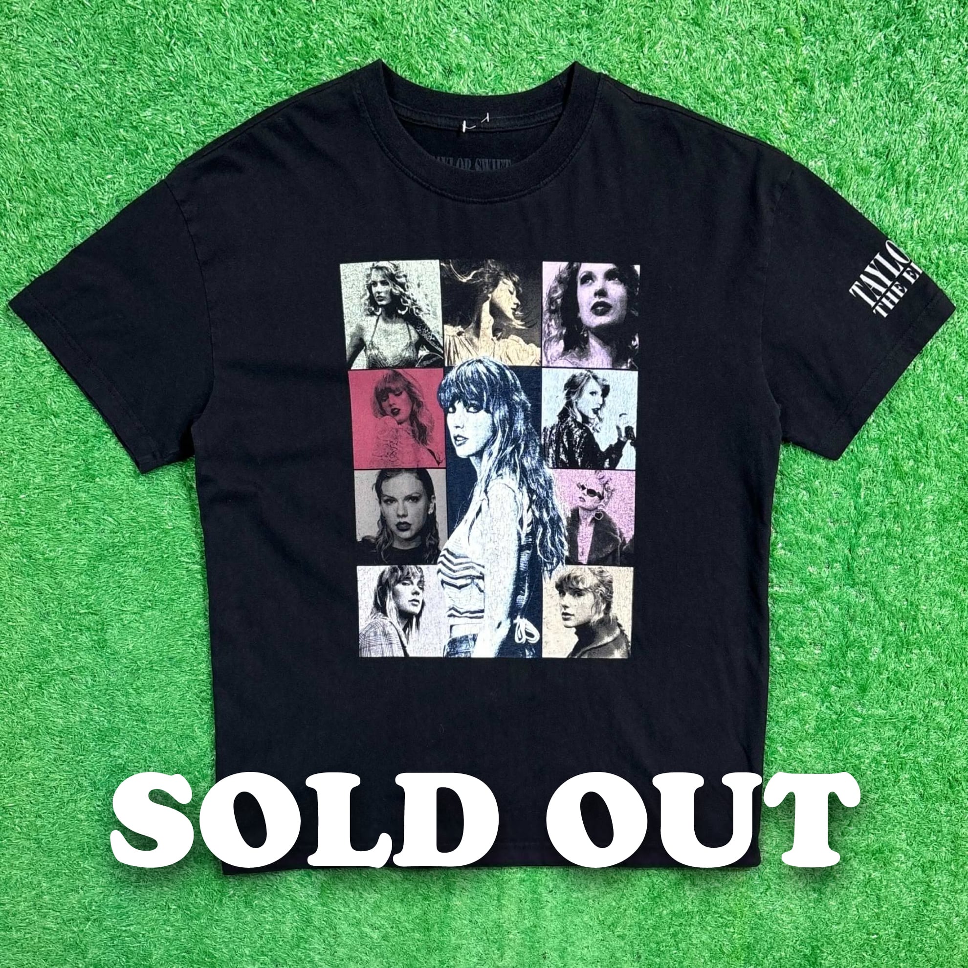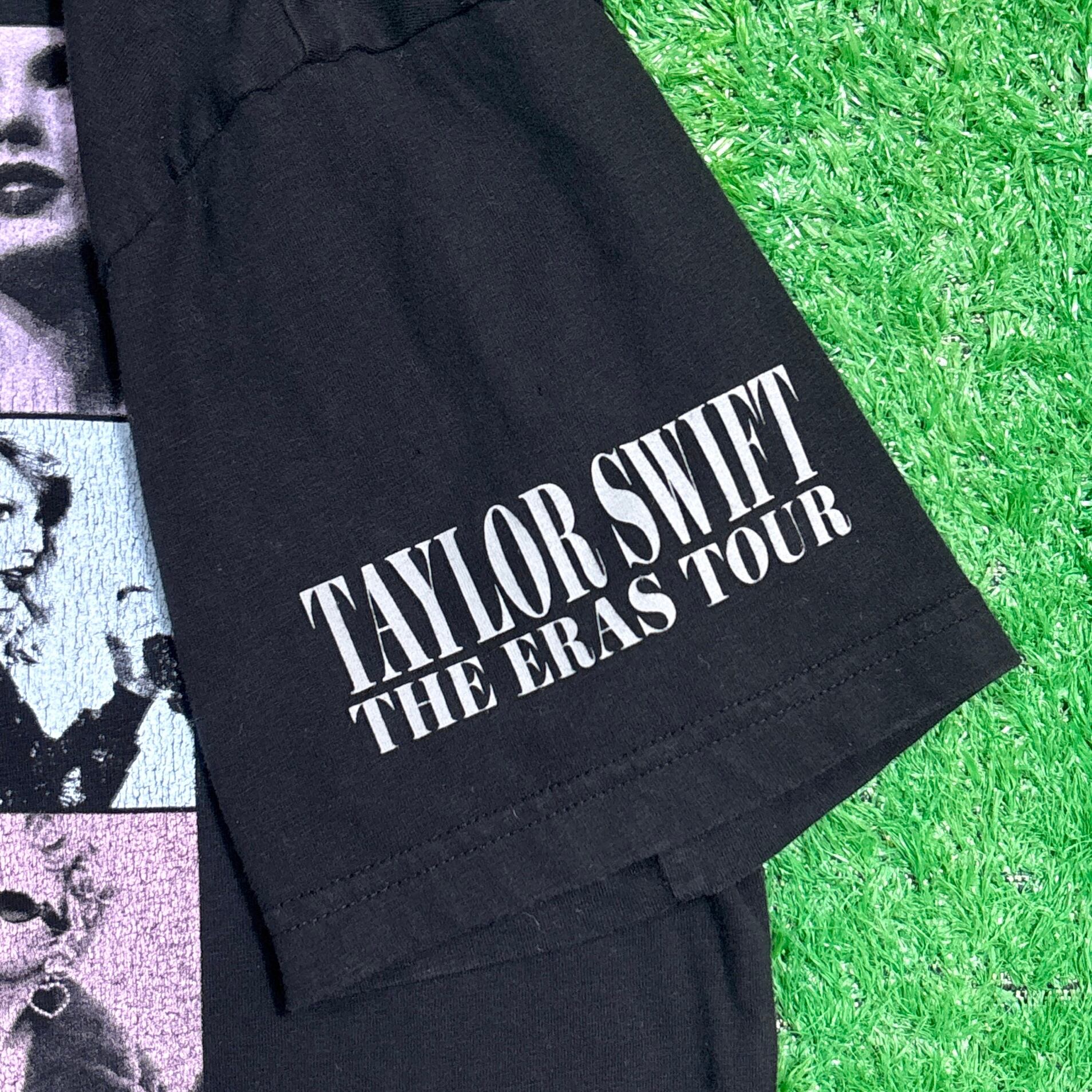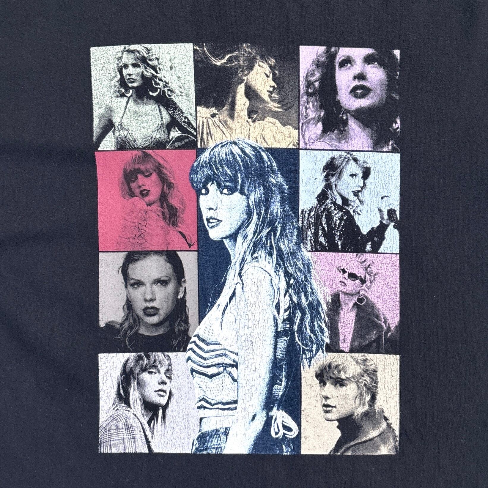 2023年に開催されたテイラー・スウィフトの世界ツアー「The Eras Tour」公式グッズTシャツです。フロントにはこれまでのアルバムごとのビジュアルをコラージュしたデザイン、左袖にはツアーロゴ、バックにはツアー日程と歴代アルバム名がプリントされた存在感抜群の一枚。ファン必見のメモリアルアイテムです。