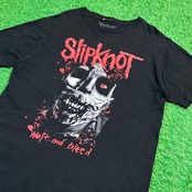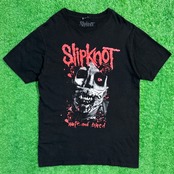 アメリカ発のヘヴィメタルバンド「Slipknot(スリップノット)」のオフィシャルライセンスTシャツです。フロントには代表曲「Wait and Bleed」をモチーフにしたホラーテイストのプリントデザイン、バックにはアイコニックな「Sロゴ」が施された存在感抜群の1枚。ブラックボディに赤と白のプリントが映える、バンドTらしいインパクトのあるデザインです。