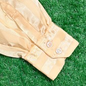 同系色のストライプ織りがさりげないアクセントになり、ボウタイ付きのデザインがクラシックで上品な印象を演出します。