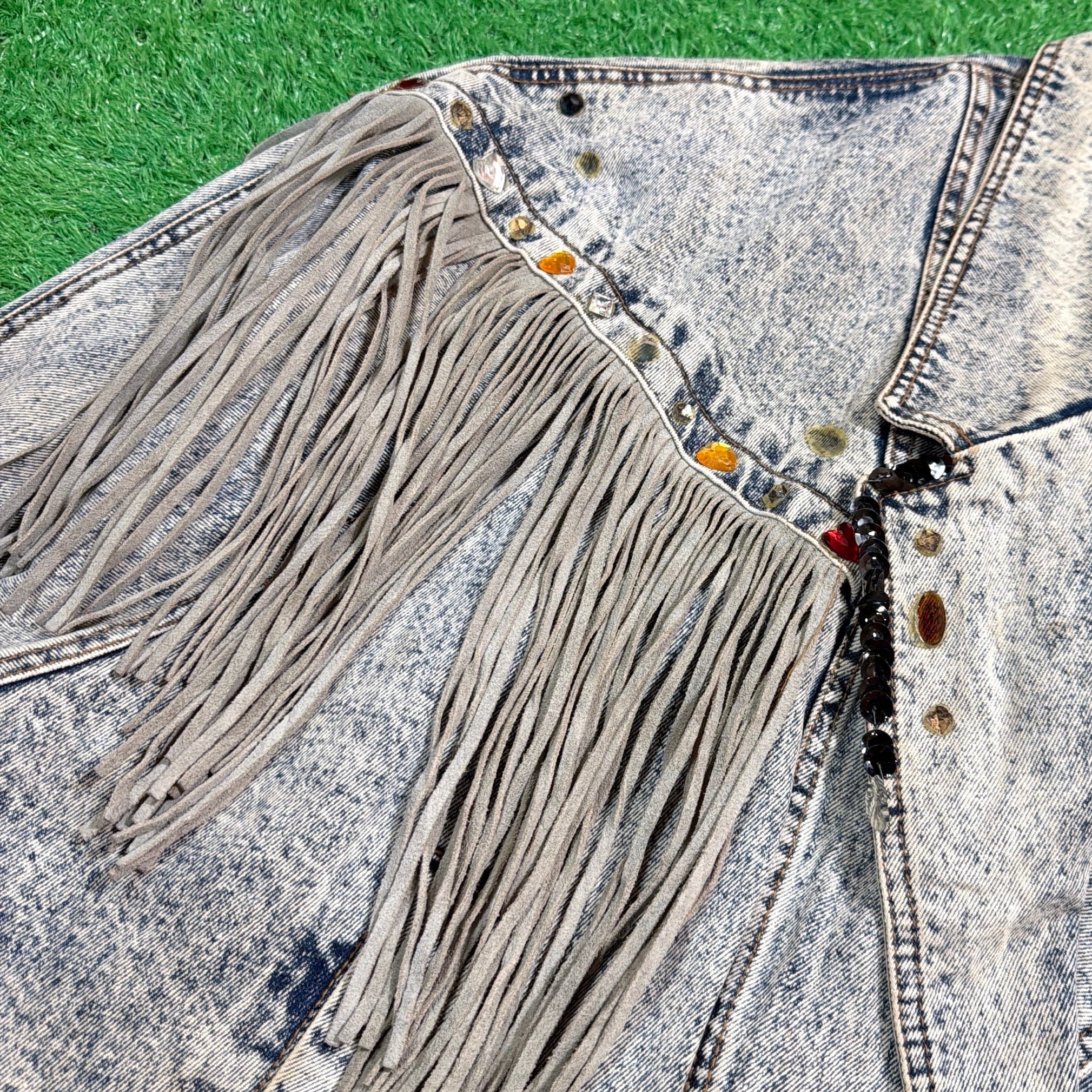 肩から背中にかけて贅沢にあしらわれたフリンジと、80sらしいケミカルウォッシュのデニム地が存在感抜群。ドルマンスリーブ仕様で、ウエスタンとロックテイストをミックスしたインパクトある一着です。ビーズ飾りやスタッズ風デザインがアクセントになり、ヴィンテージならではの個性的な雰囲気を放ちます。
