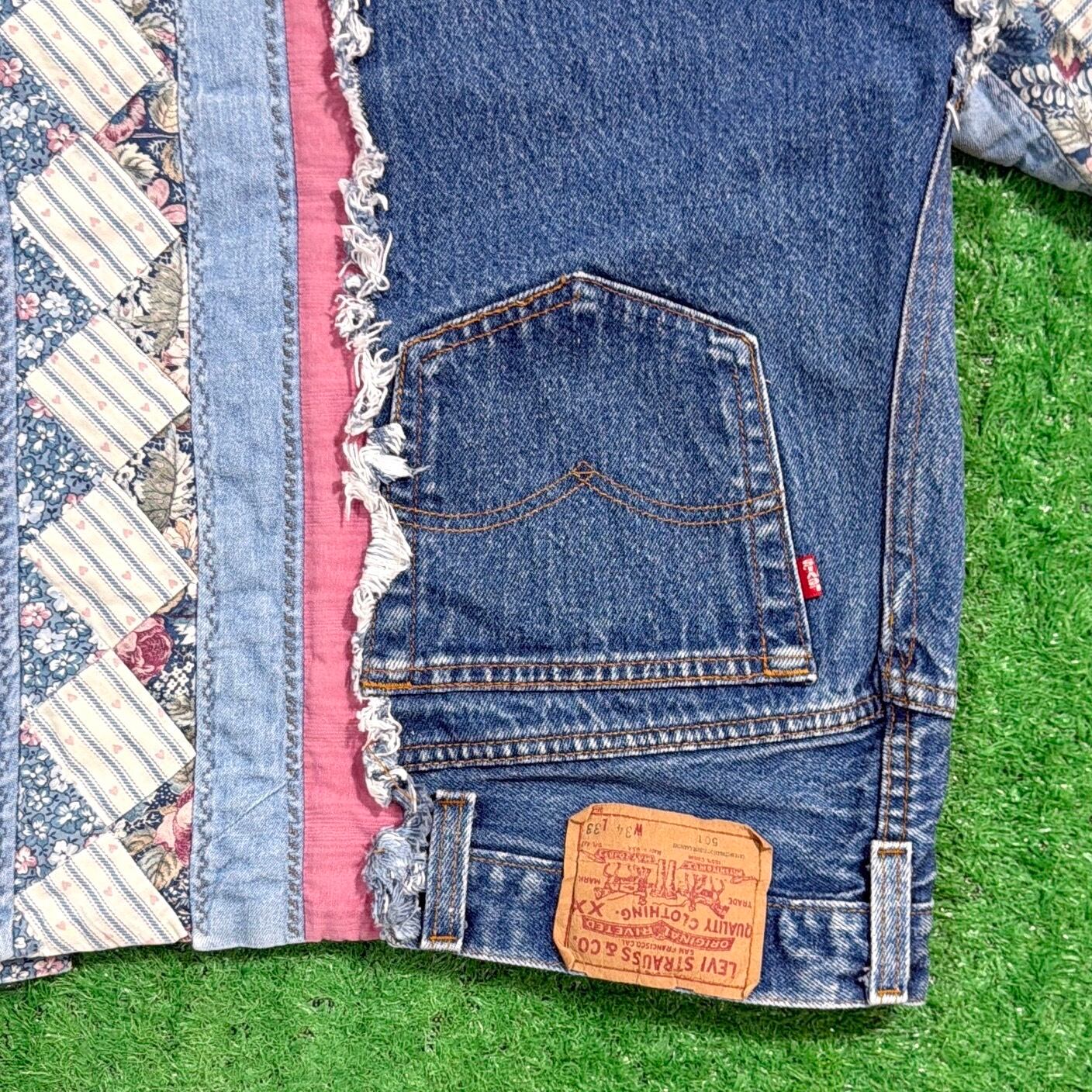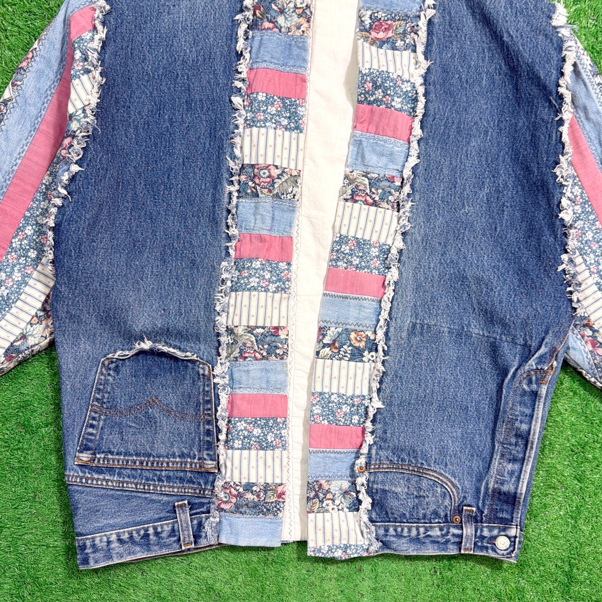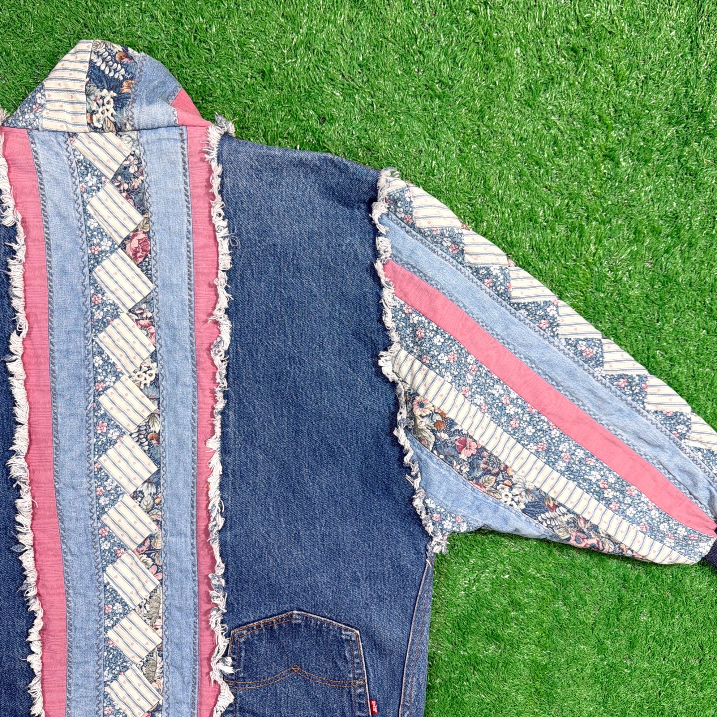 Levi’sのデニムパンツを解体し、ヴィンテージファブリックを組み合わせてリメイクされたデニムジャケットです。フロントから背中にかけてカラフルな幾何学模様のファブリックをパッチワーク風に配置。