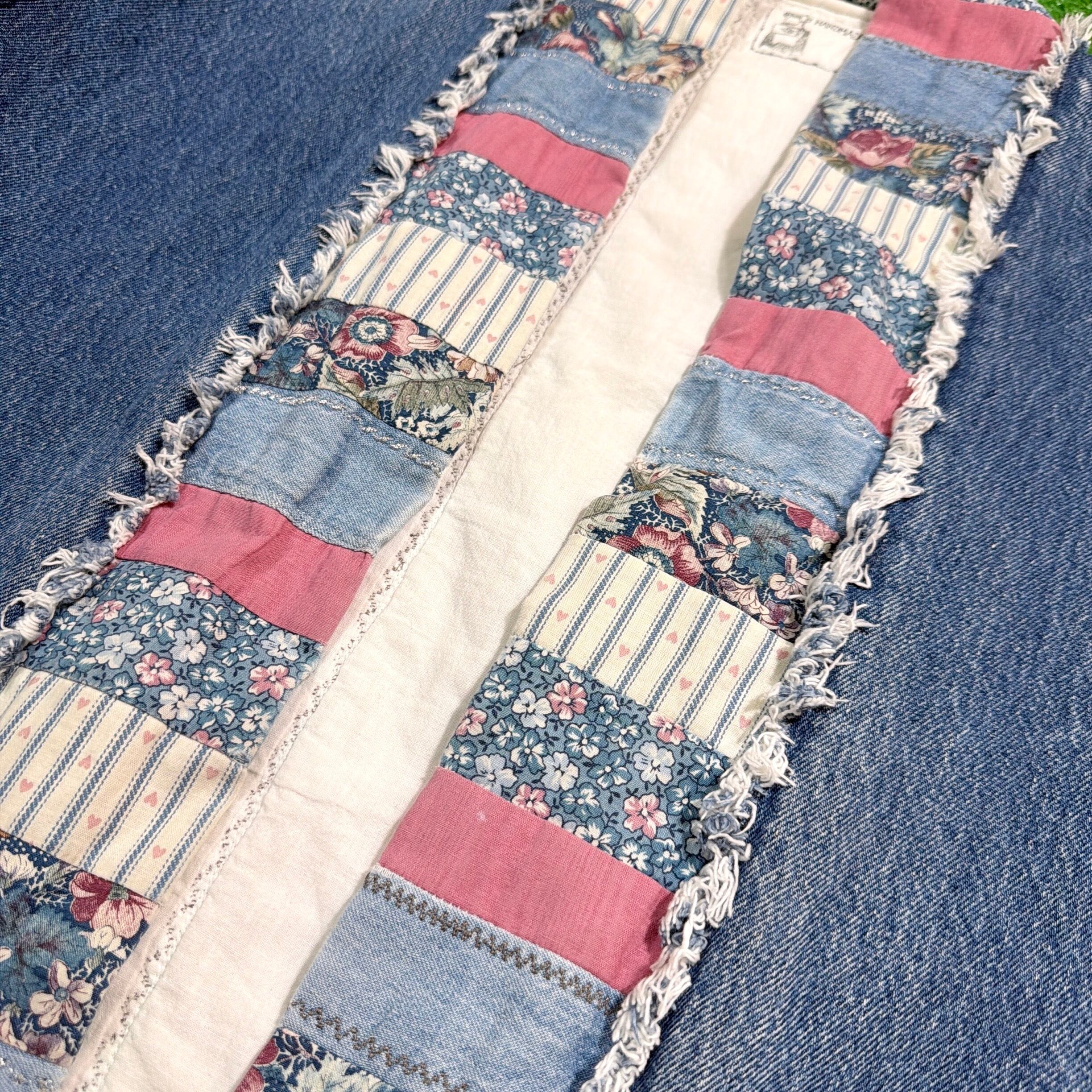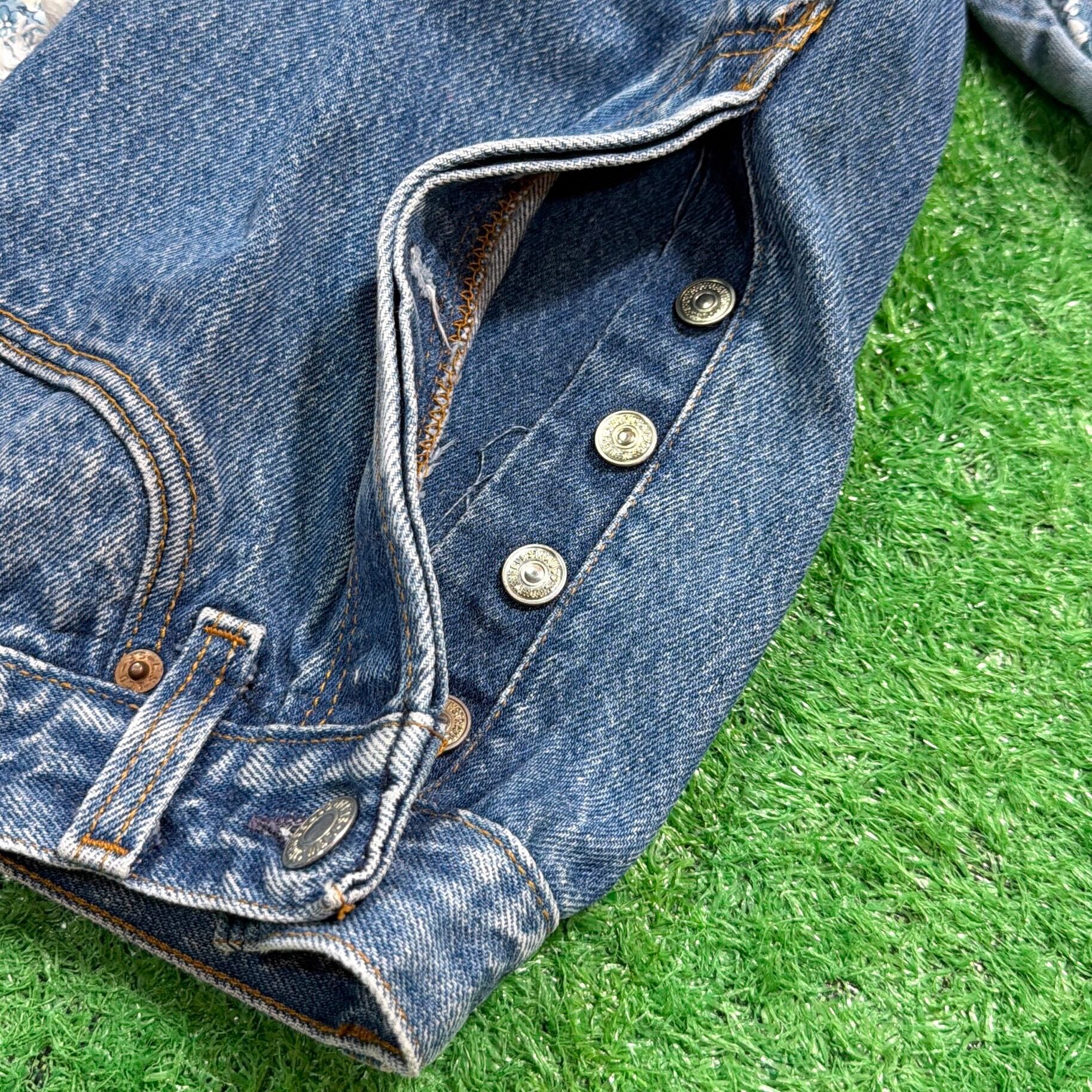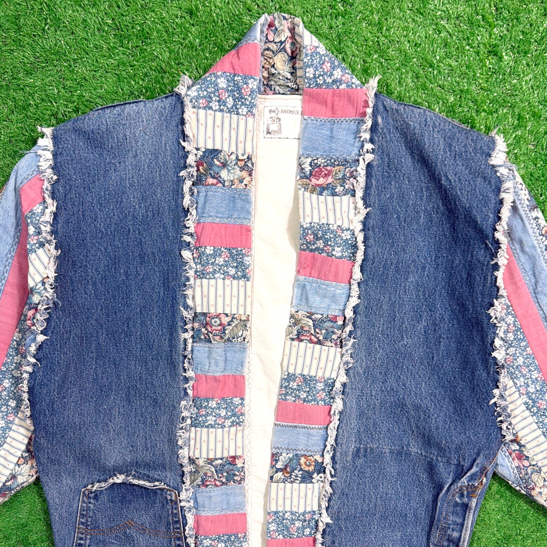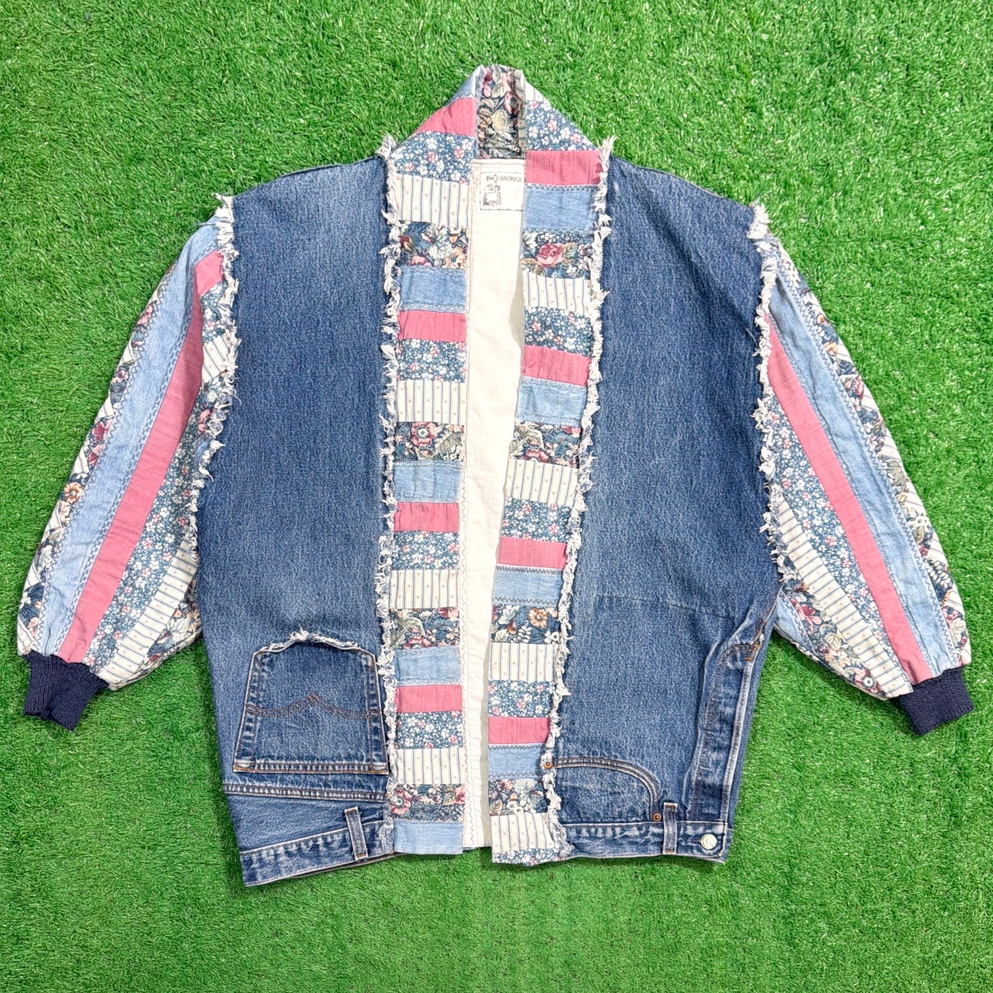 Levi’sのデニムパンツを解体し、ヴィンテージファブリックを組み合わせてリメイクされたデニムジャケットです。フロントから背中にかけてカラフルな幾何学模様のファブリックをパッチワーク風に配置。