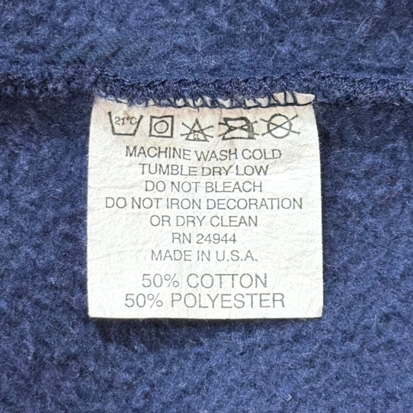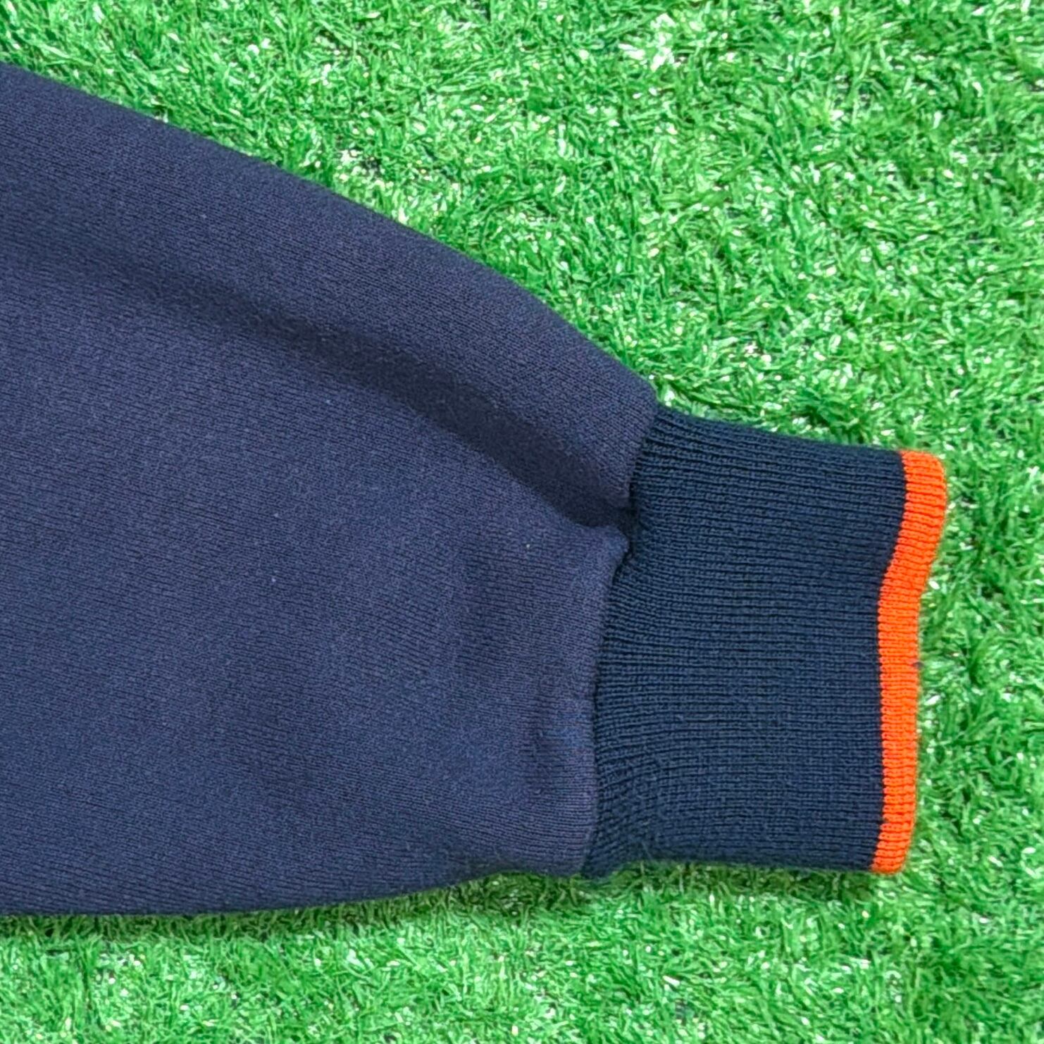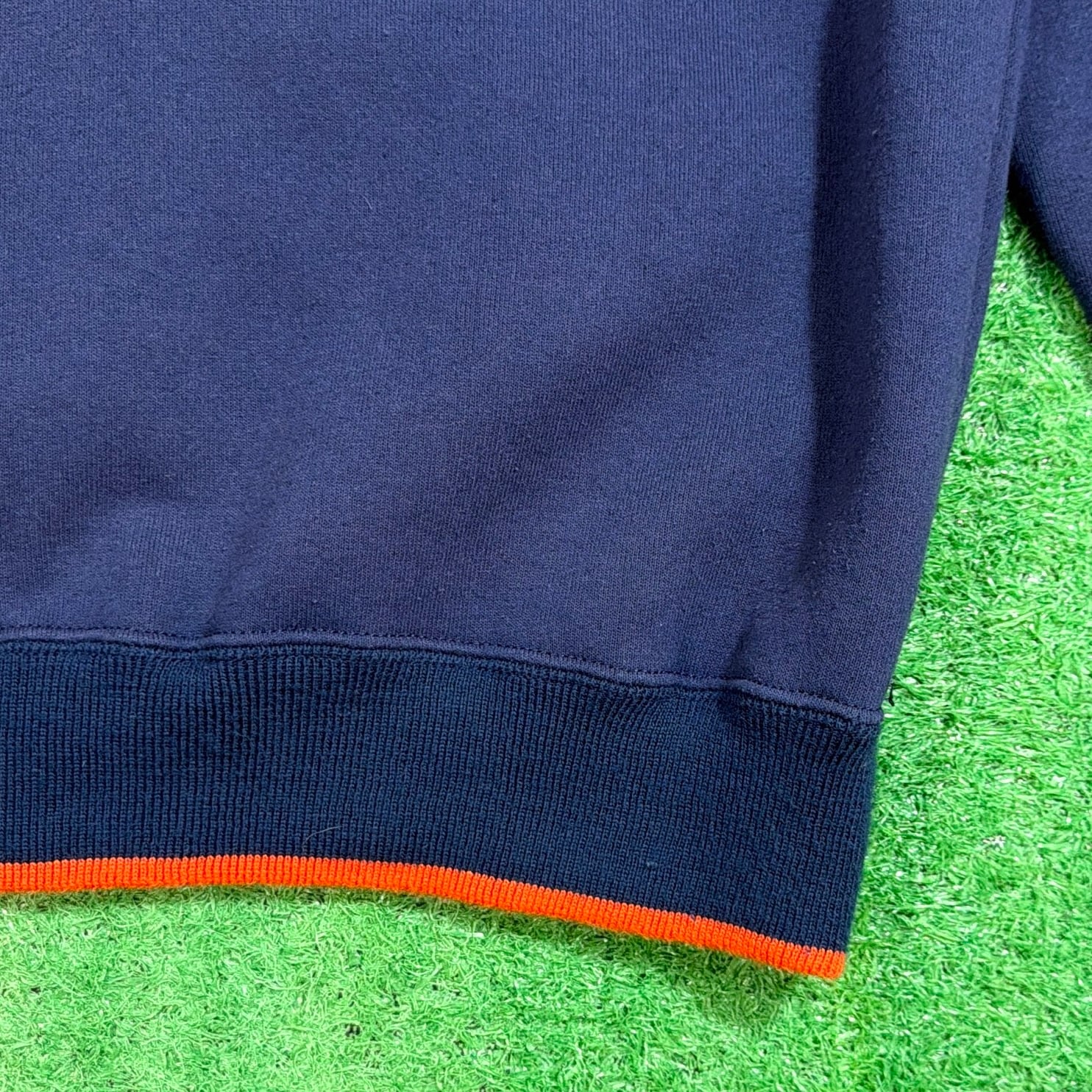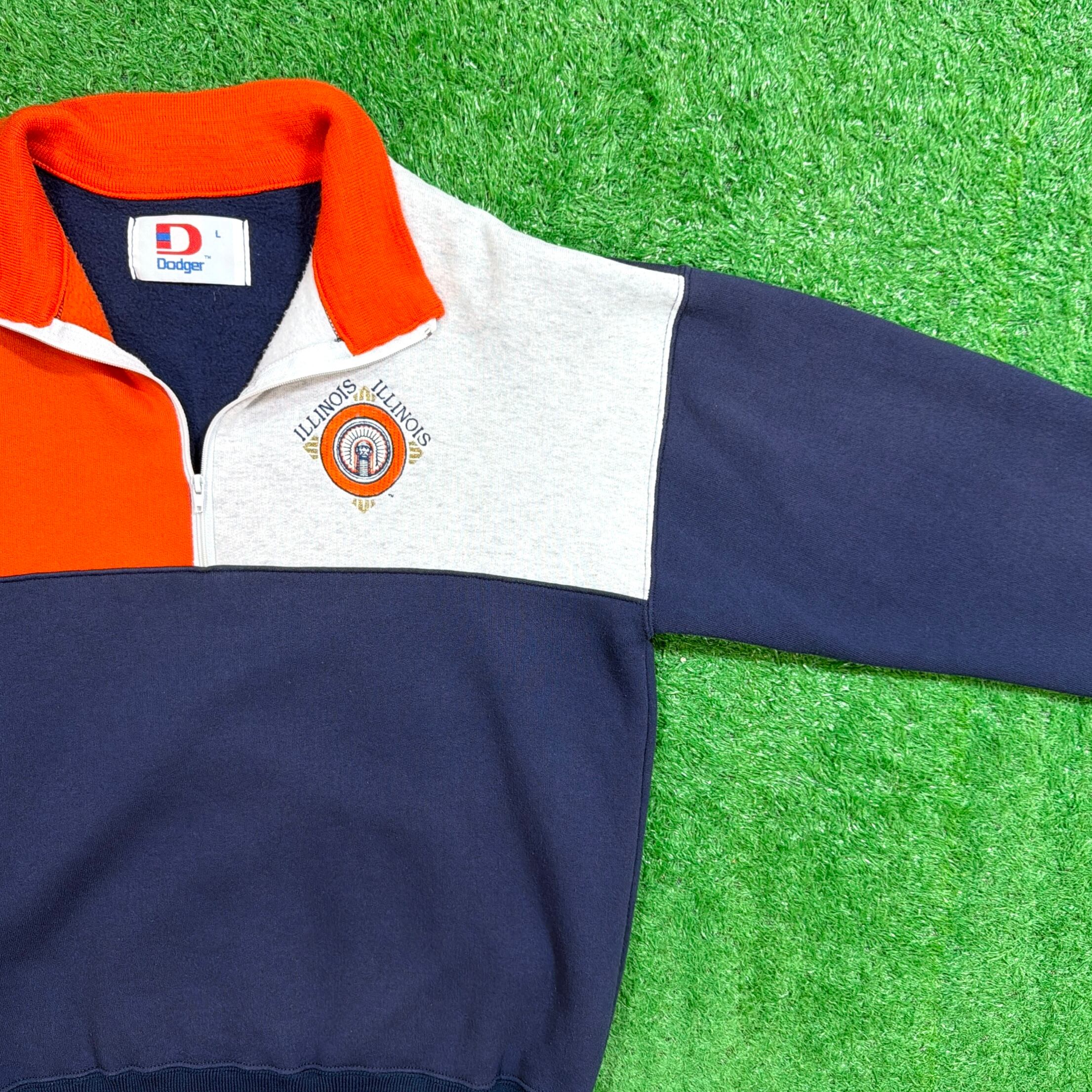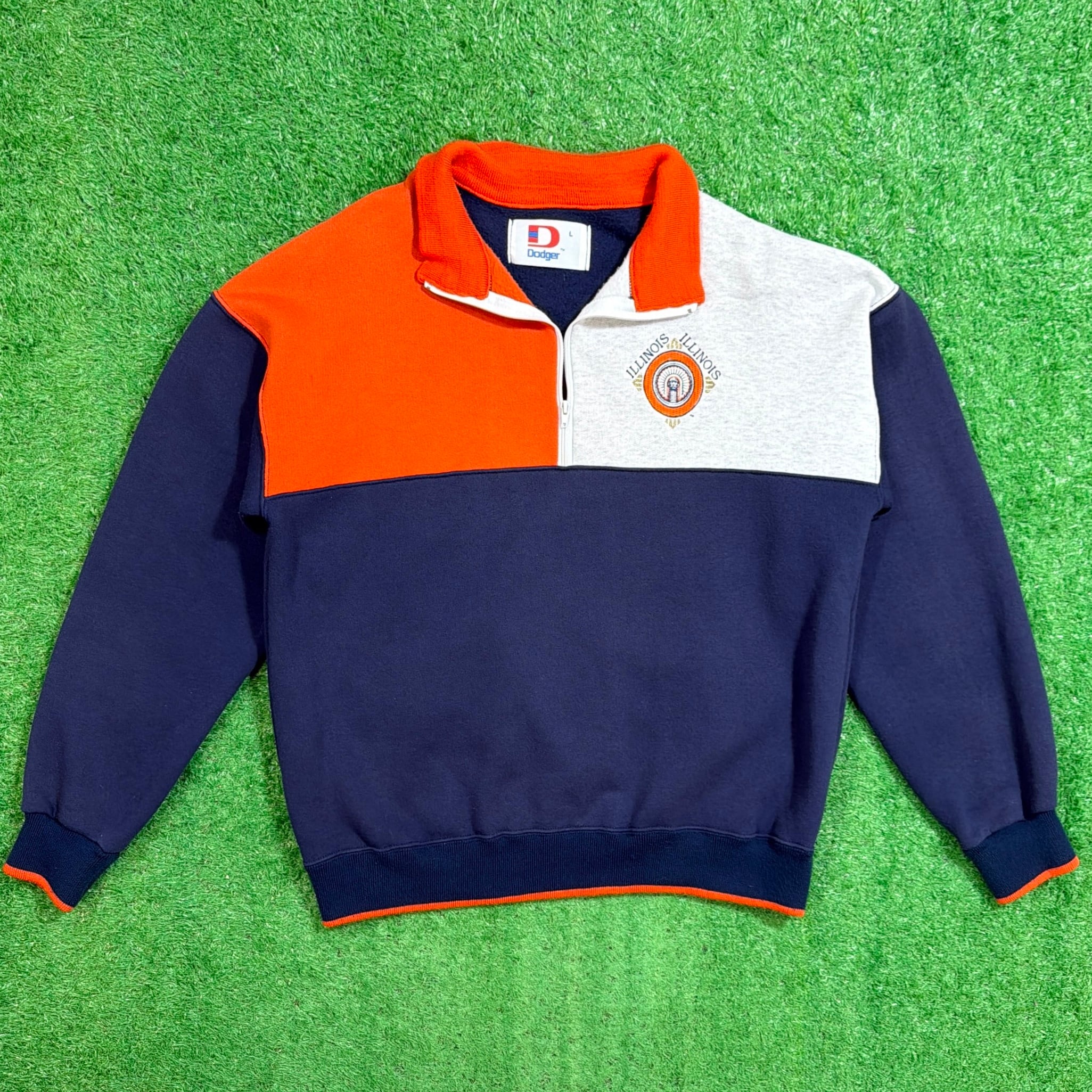 1990年代、アメリカ・イリノイ州の大学ロゴ「ILLINOIS」刺繍がワンポイントで入ったハーフジップスウェットです。オレンジ×ネイビー×ホワイトの切り替え配色が印象的で、カレッジテイストあふれる一枚。しっかりとした裏起毛スウェット生地で、秋冬シーズンにも活躍します。