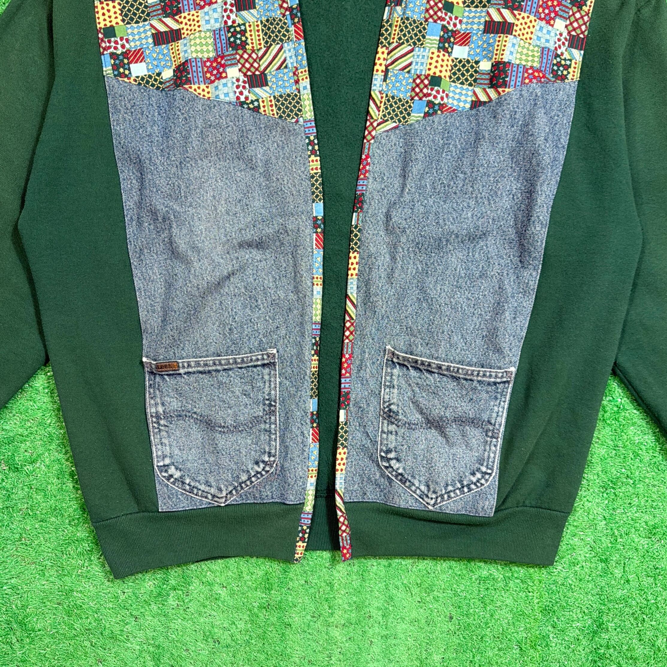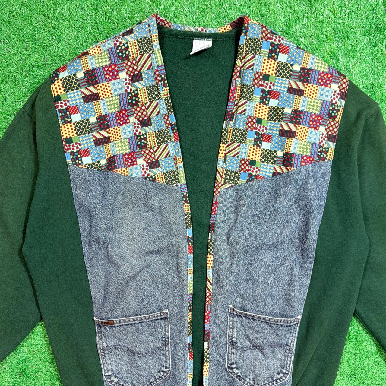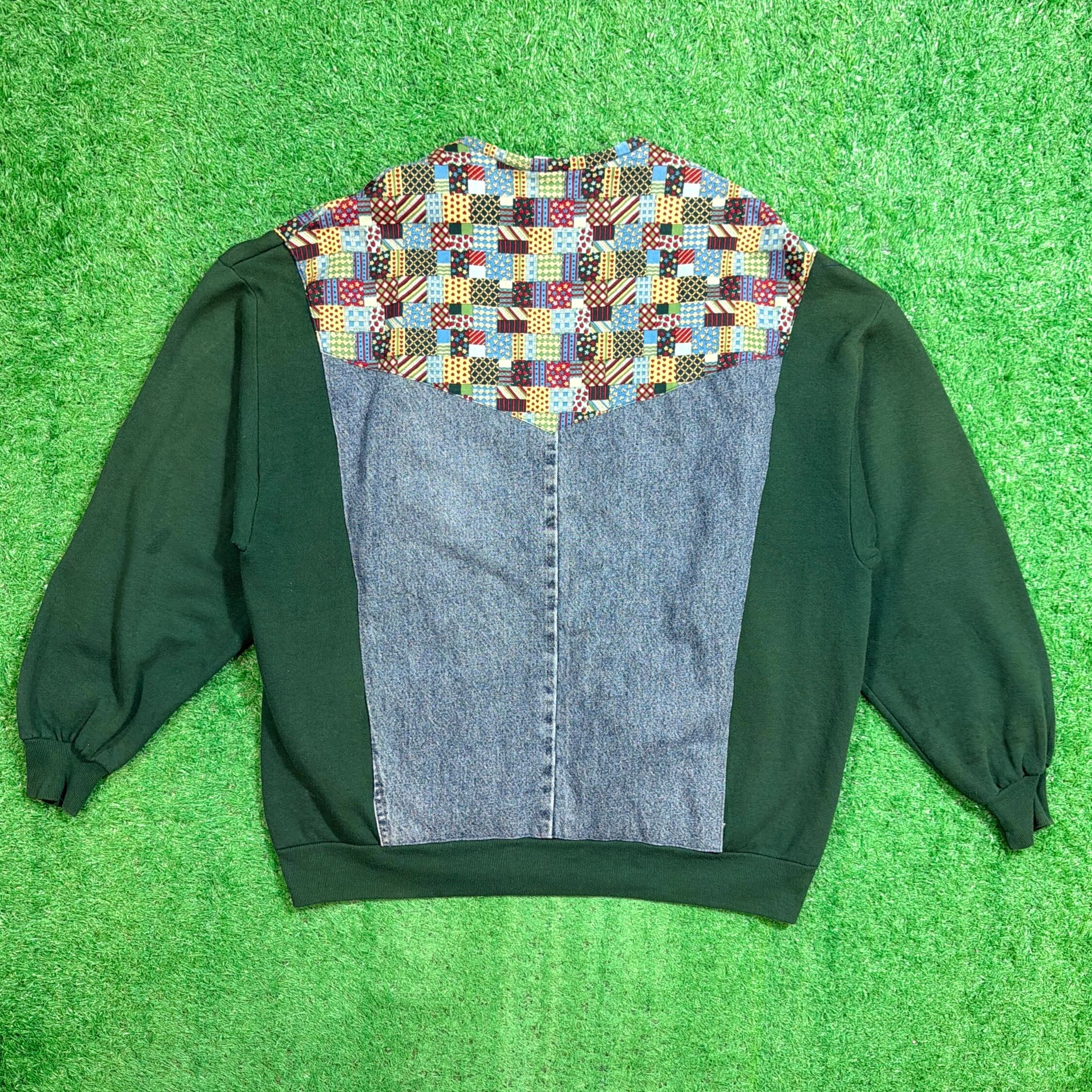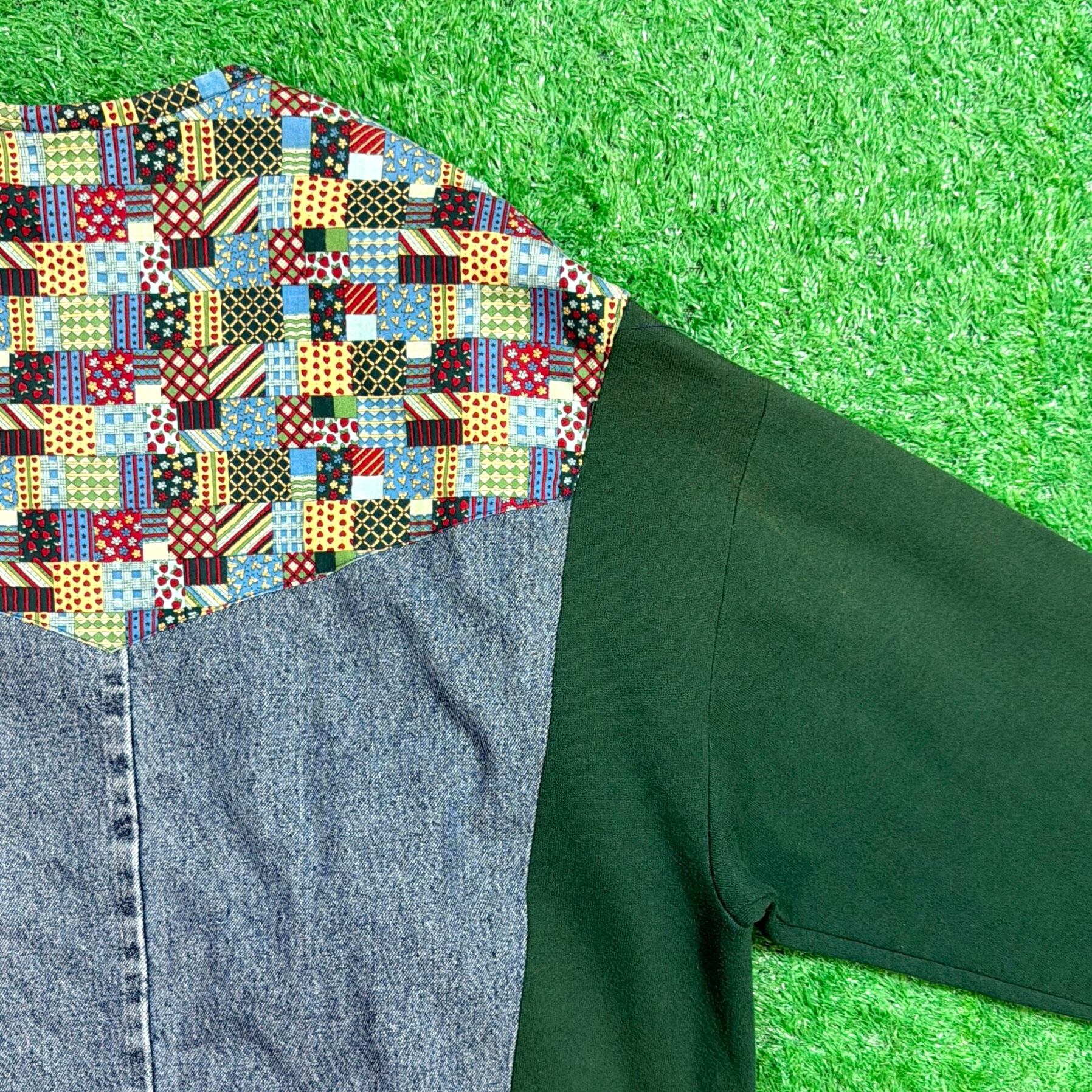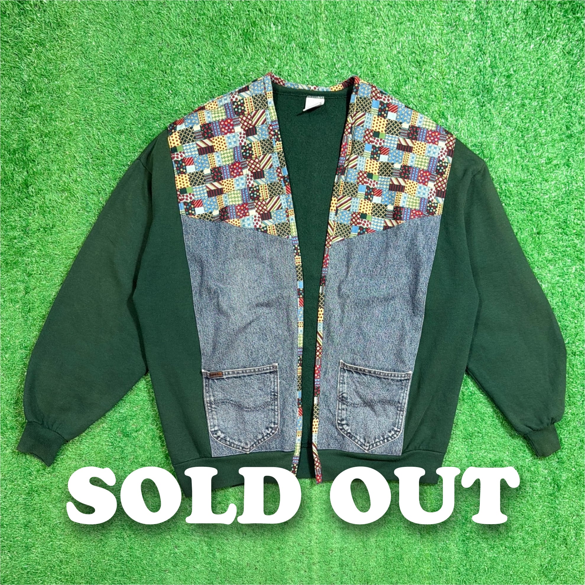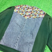 深いグリーンのスウェットボディに、LEEデニムシャツ生地とマルチカラーのパッチワークファブリックを組み合わせた一点物。フカジュアルながらも存在感のあるデザインに仕上がっています。