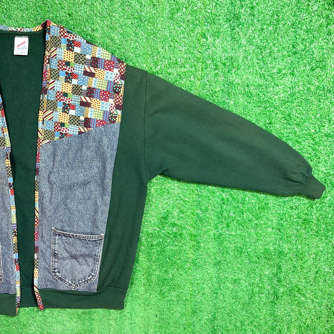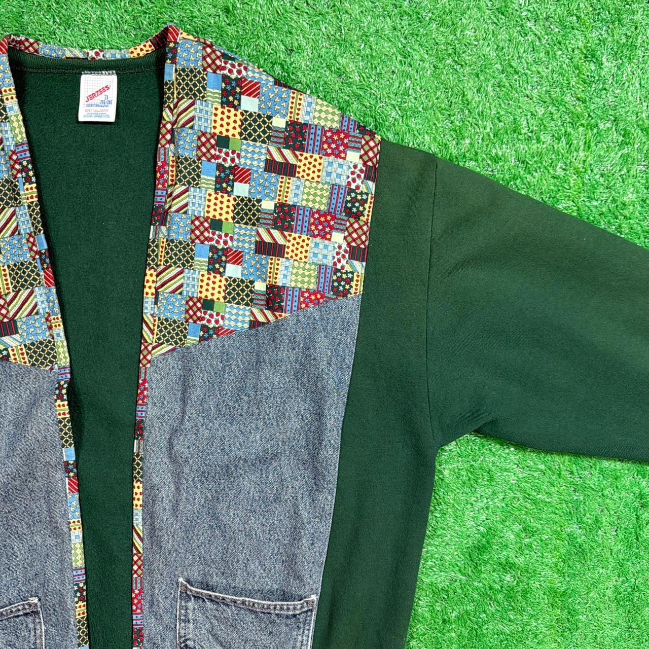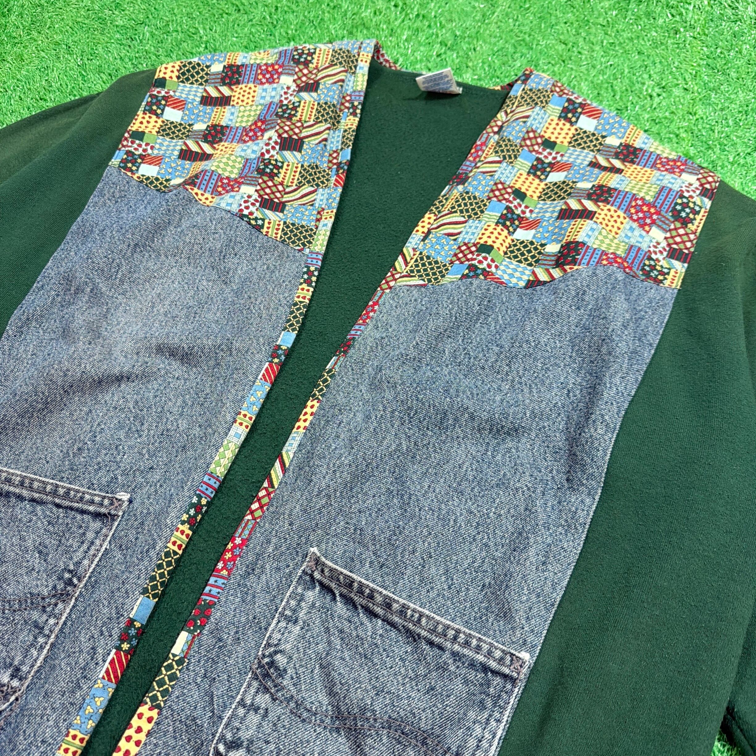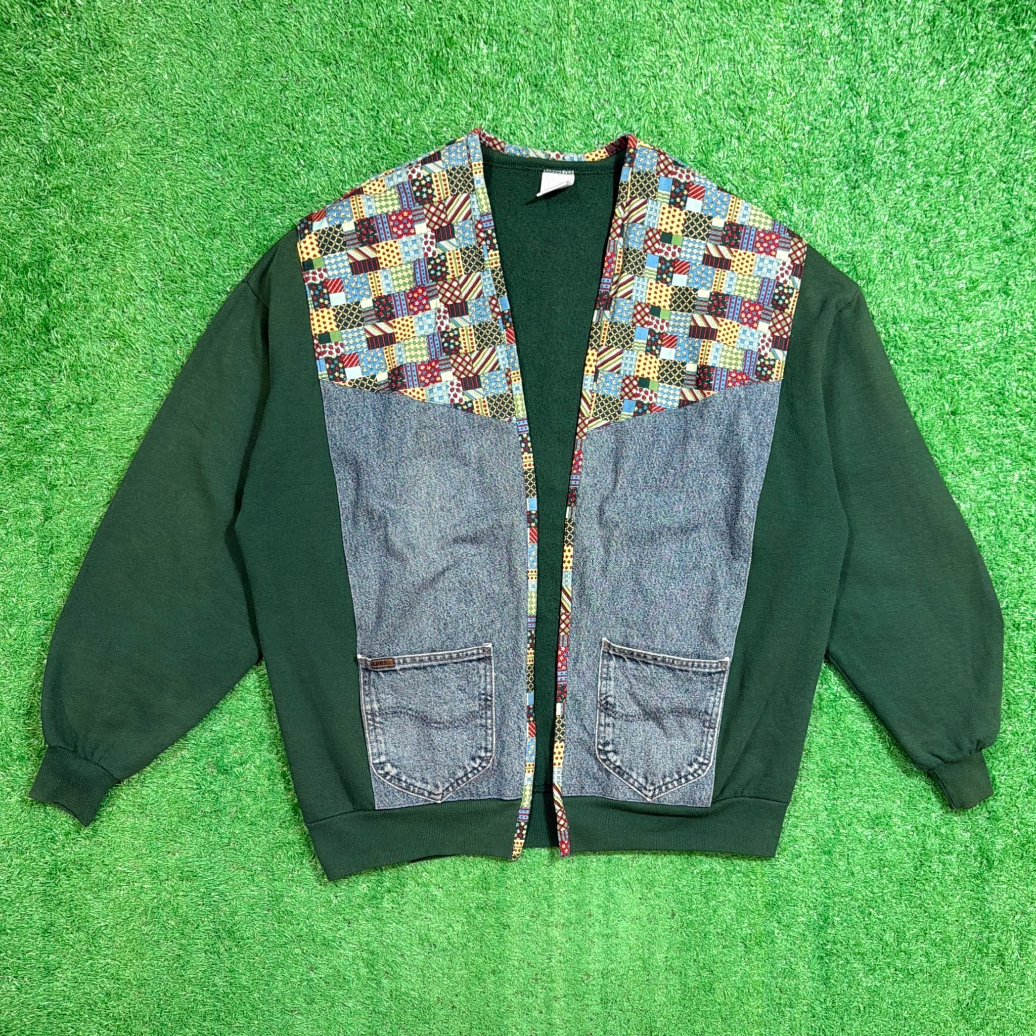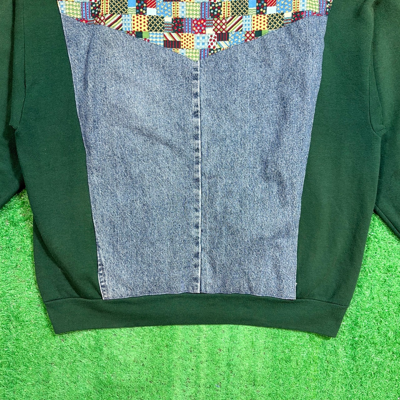 深いグリーンのスウェットボディに、LEEデニムシャツ生地とマルチカラーのパッチワークファブリックを組み合わせた一点物。フカジュアルながらも存在感のあるデザインに仕上がっています。