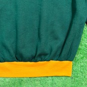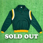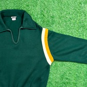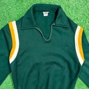 深みのあるグリーンに、肩から袖にかけて入ったイエロー×ホワイトのラインがレトロなアクセント。ハーフジップではなくVネック仕様で、襟付きの珍しいデザイン。スウェットとニットの中間のようなしっかりとした厚みのある生地感で、70s〜80sらしいスポーティーかつカジュアルな雰囲気が楽しめます。