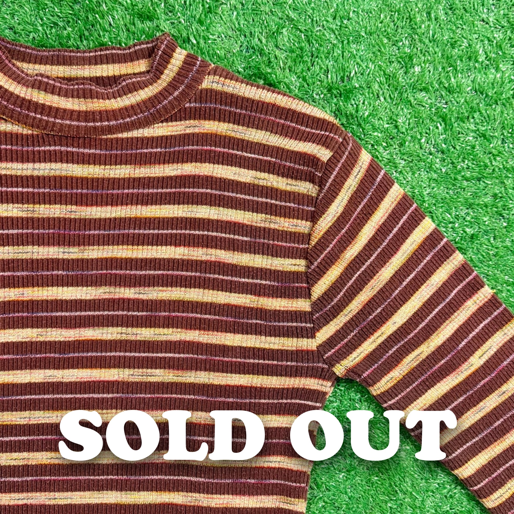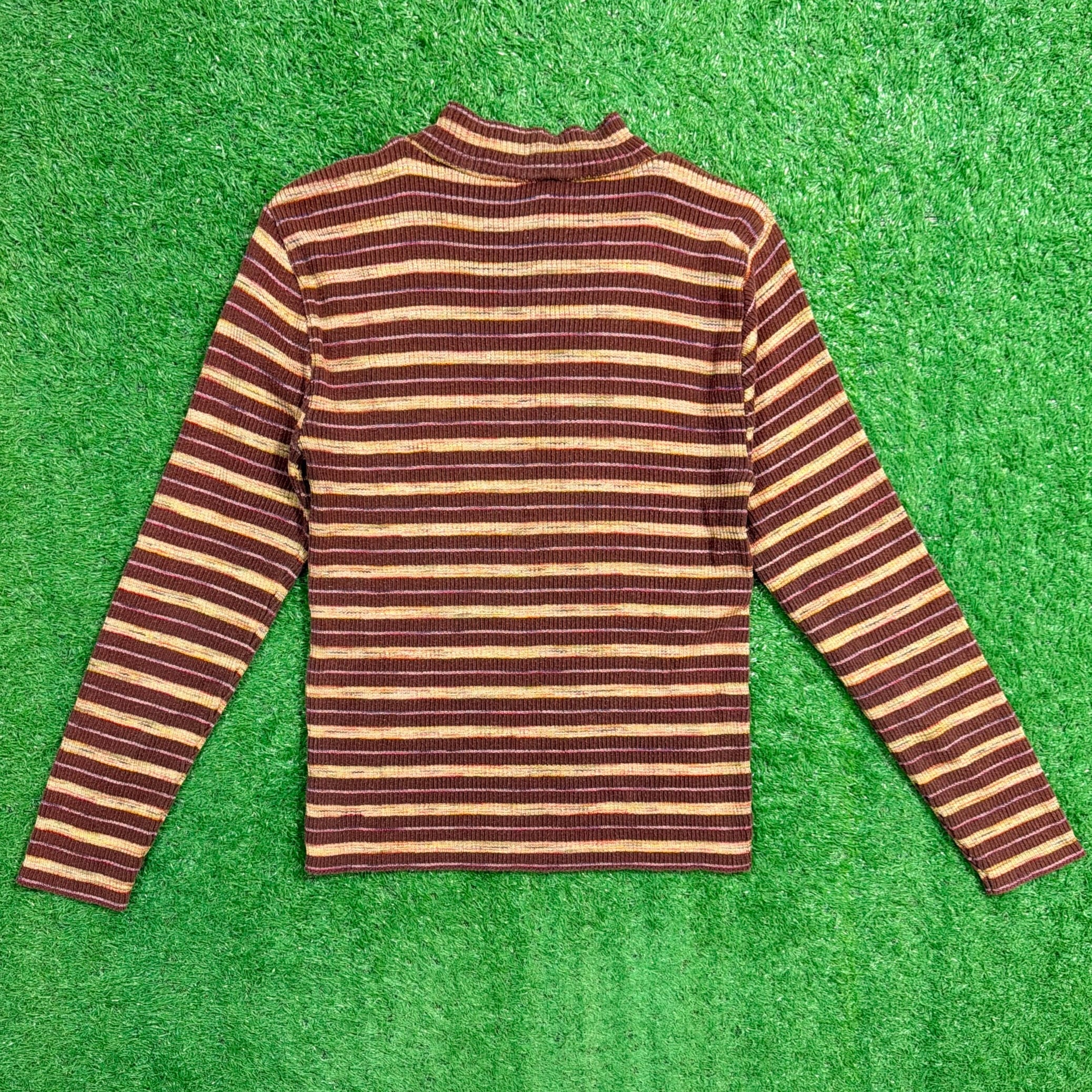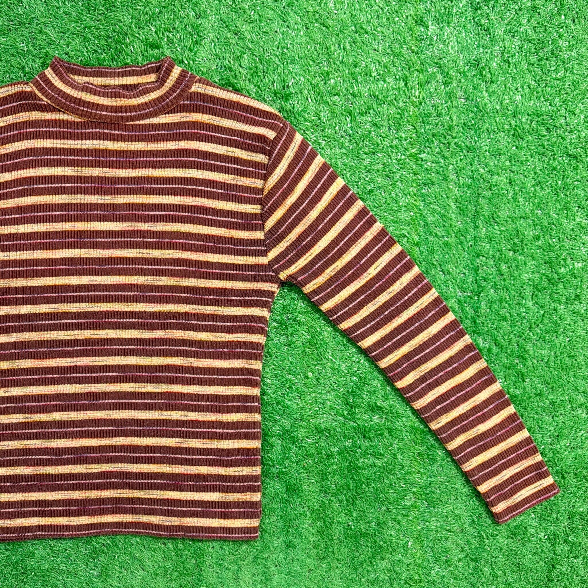ブラウンをベースに、イエロー系のラインが映えるストライプ柄。薄手で凹凸感のあるリブ編みで伸縮性があり、程よく体にフィットするシルエットが魅力です。モックネックのデザインが首元にさりげないアクセントをプラス。