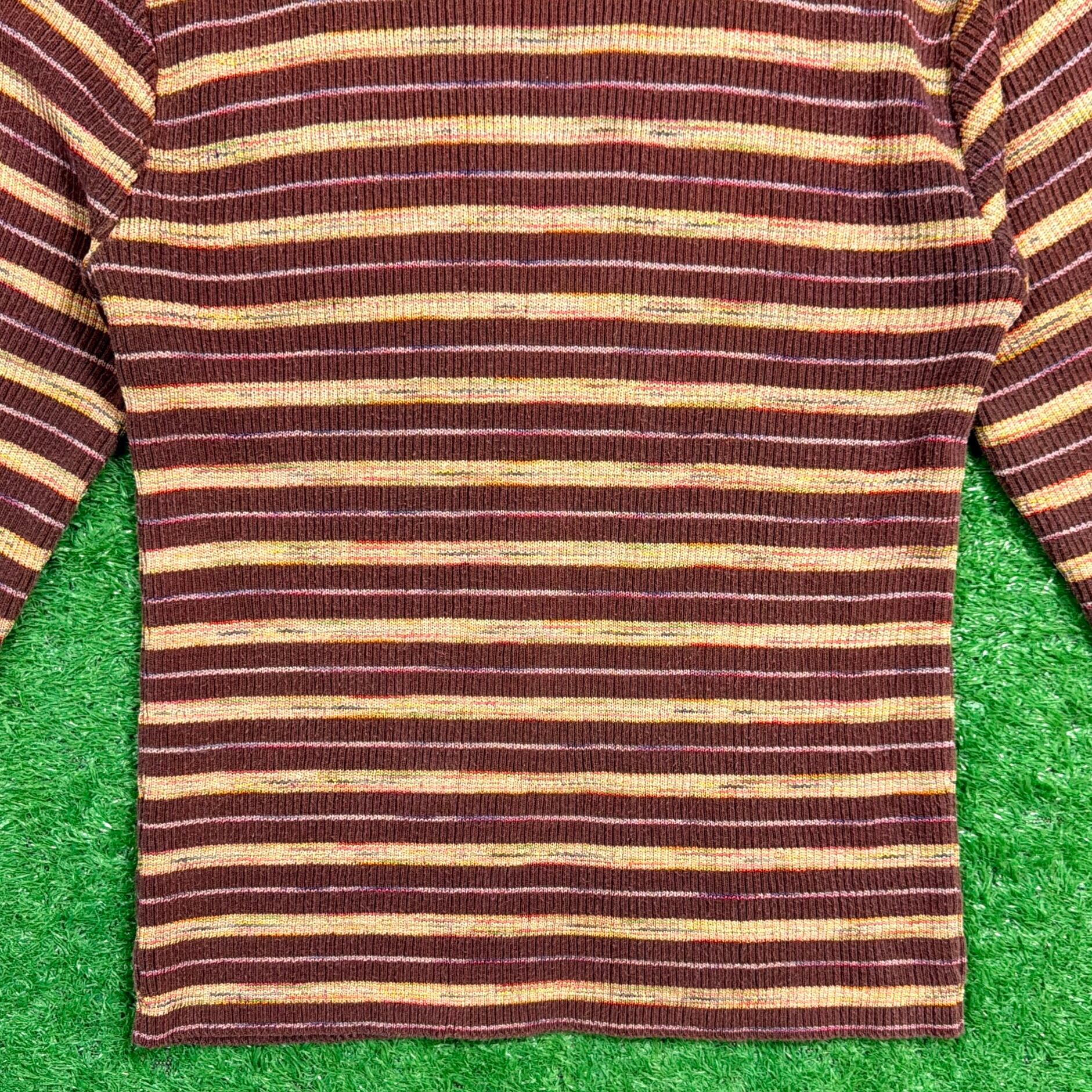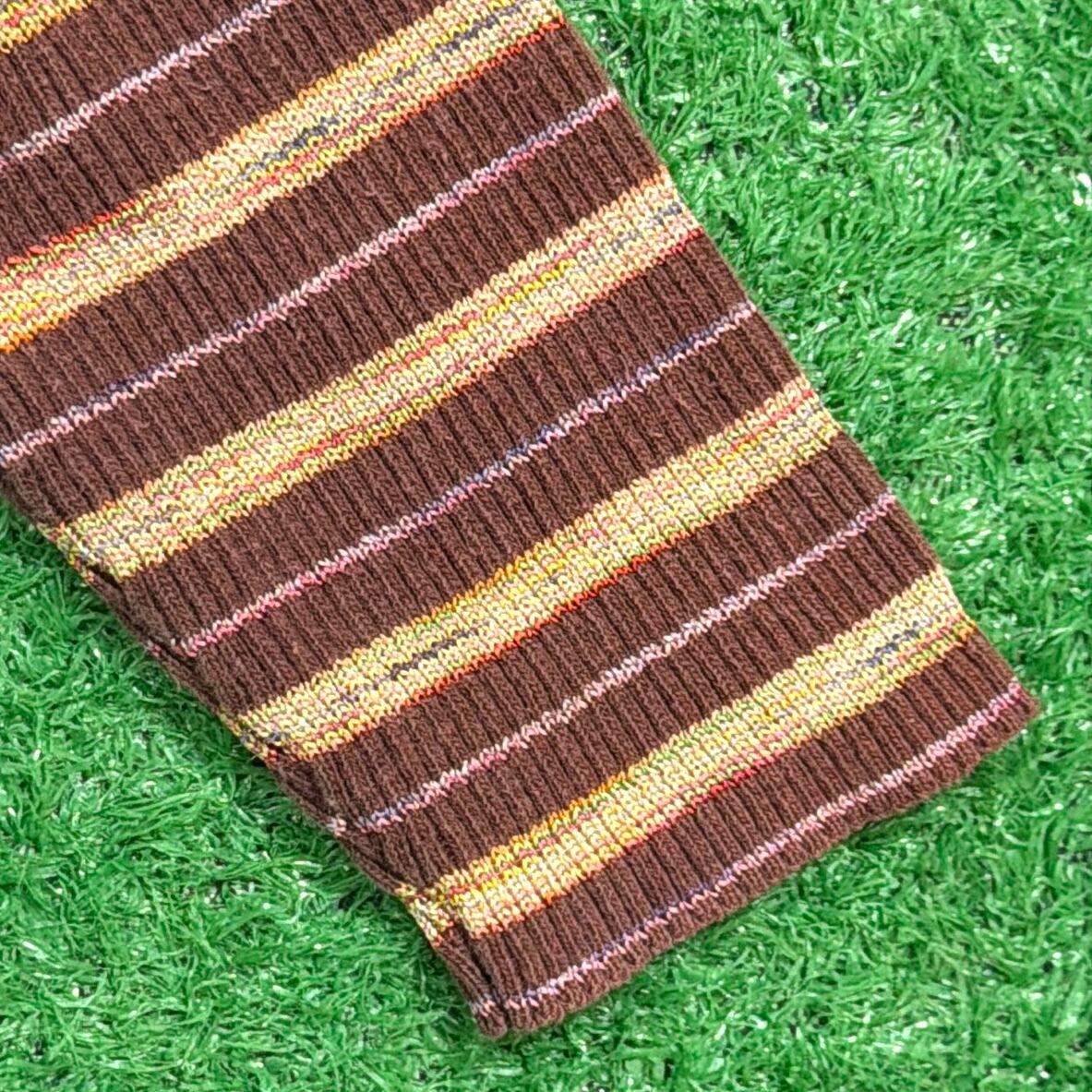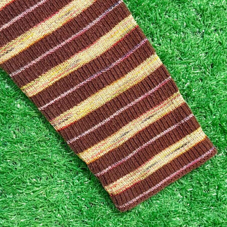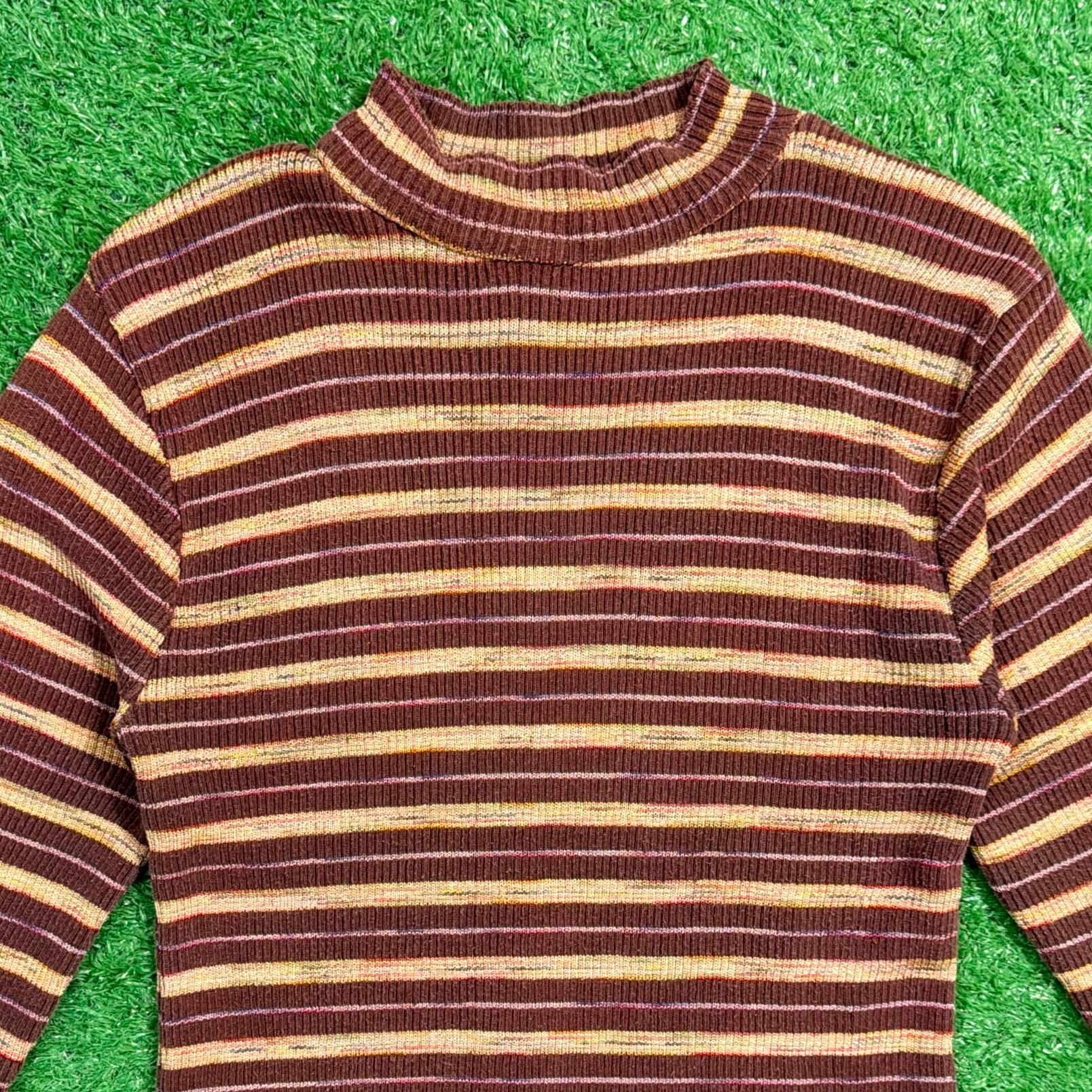 ブラウンをベースに、イエロー系のラインが映えるストライプ柄。薄手で凹凸感のあるリブ編みで伸縮性があり、程よく体にフィットするシルエットが魅力です。モックネックのデザインが首元にさりげないアクセントをプラス。