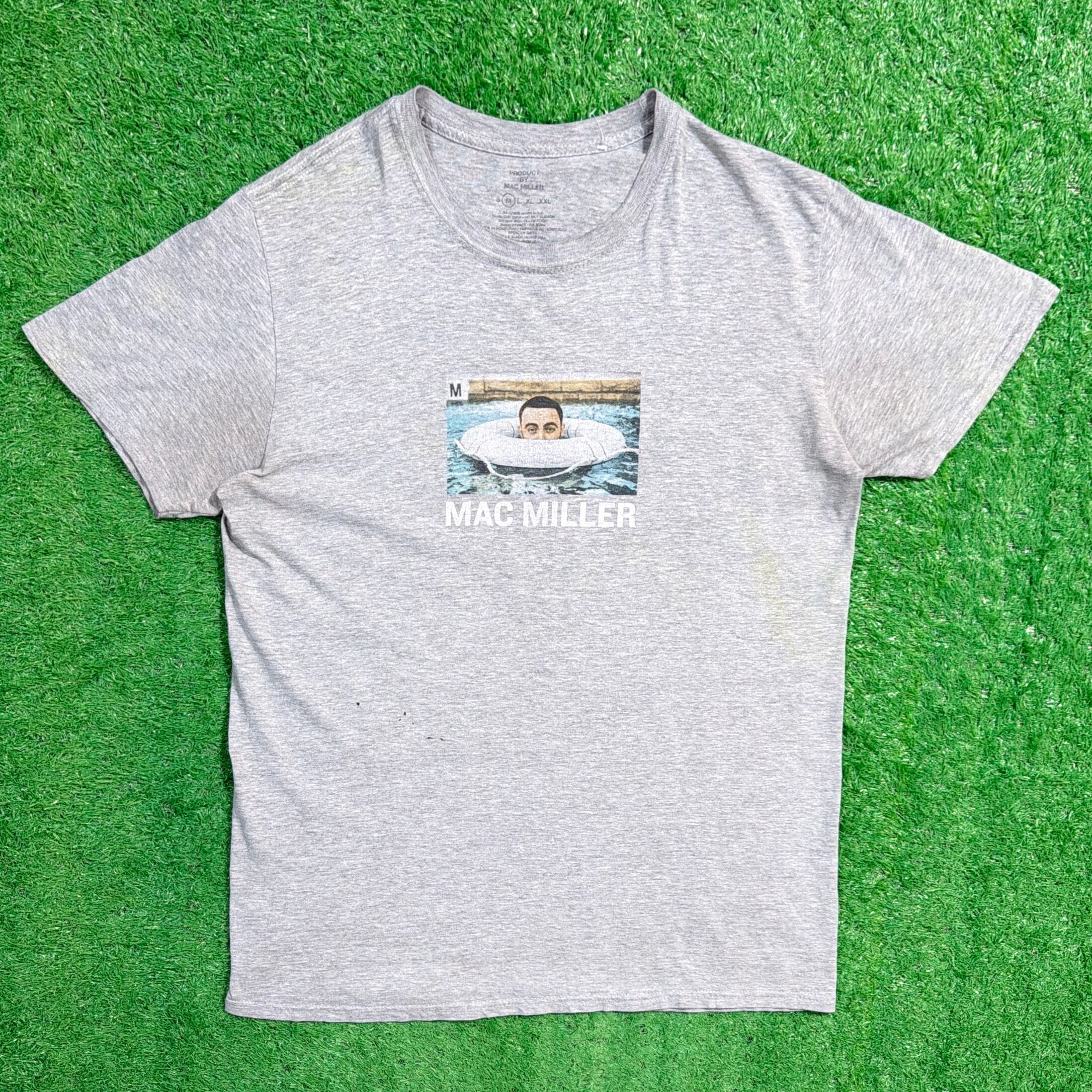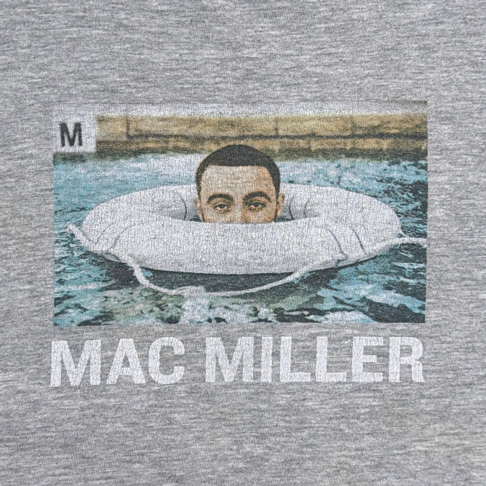 アメリカのラッパー、**Mac Miller(マック・ミラー)**のオフィシャルライセンスTシャツです。フロントにはアルバム『Swimming』を想起させる、プールに浮かぶ浮き輪から顔を覗かせるアートワークを大きくプリント。杢グレーのボディがプリントを引き立てるシンプルながら存在感ある一枚です。2018年に26歳で惜しくも逝去し今もなお絶大な人気を誇るアーティストです。