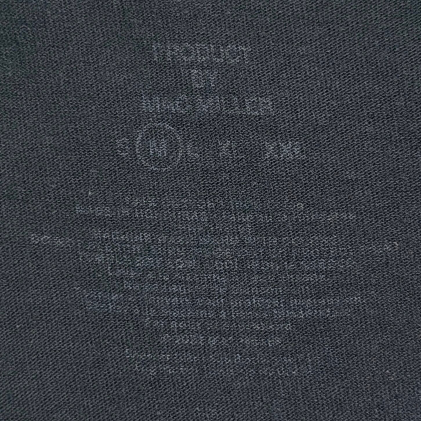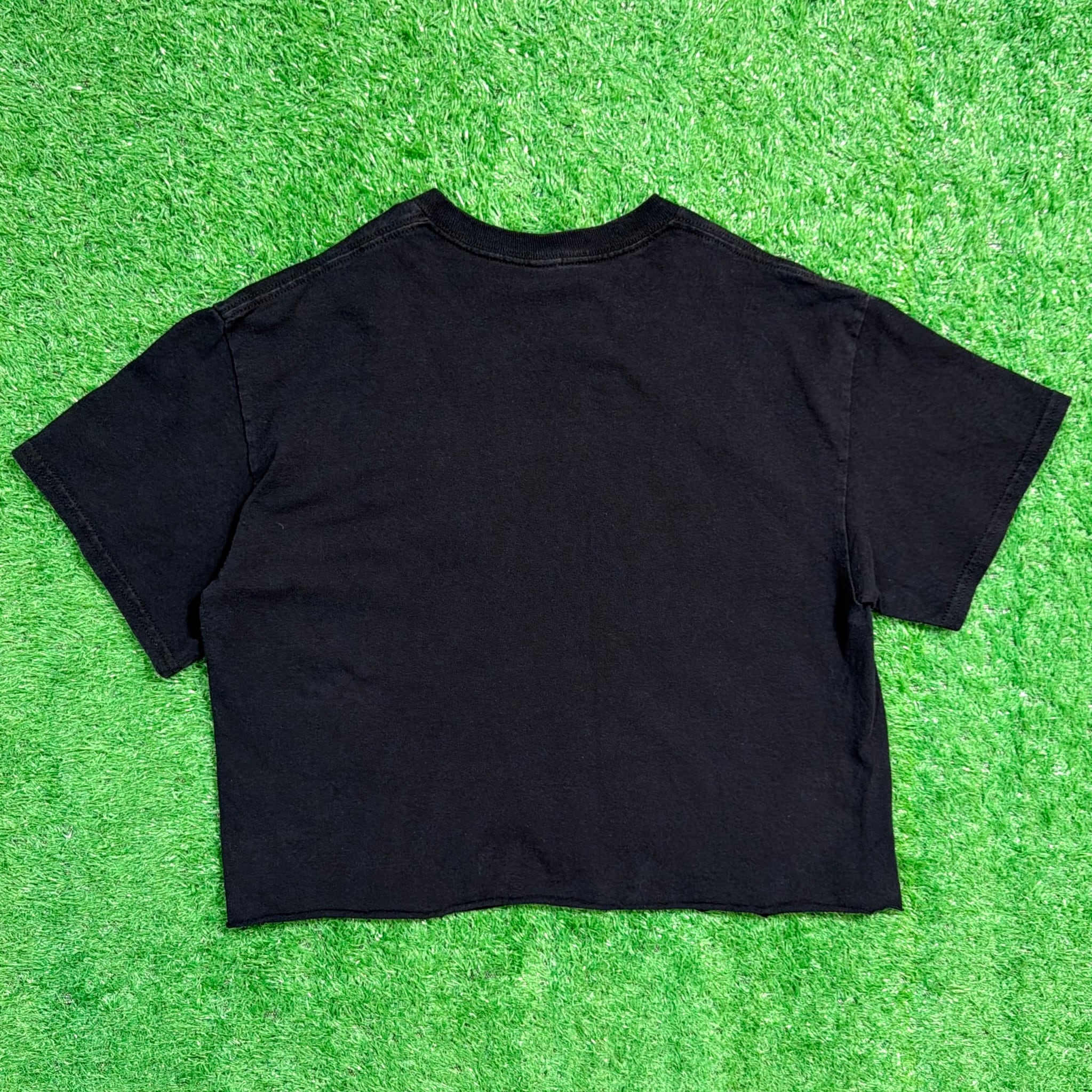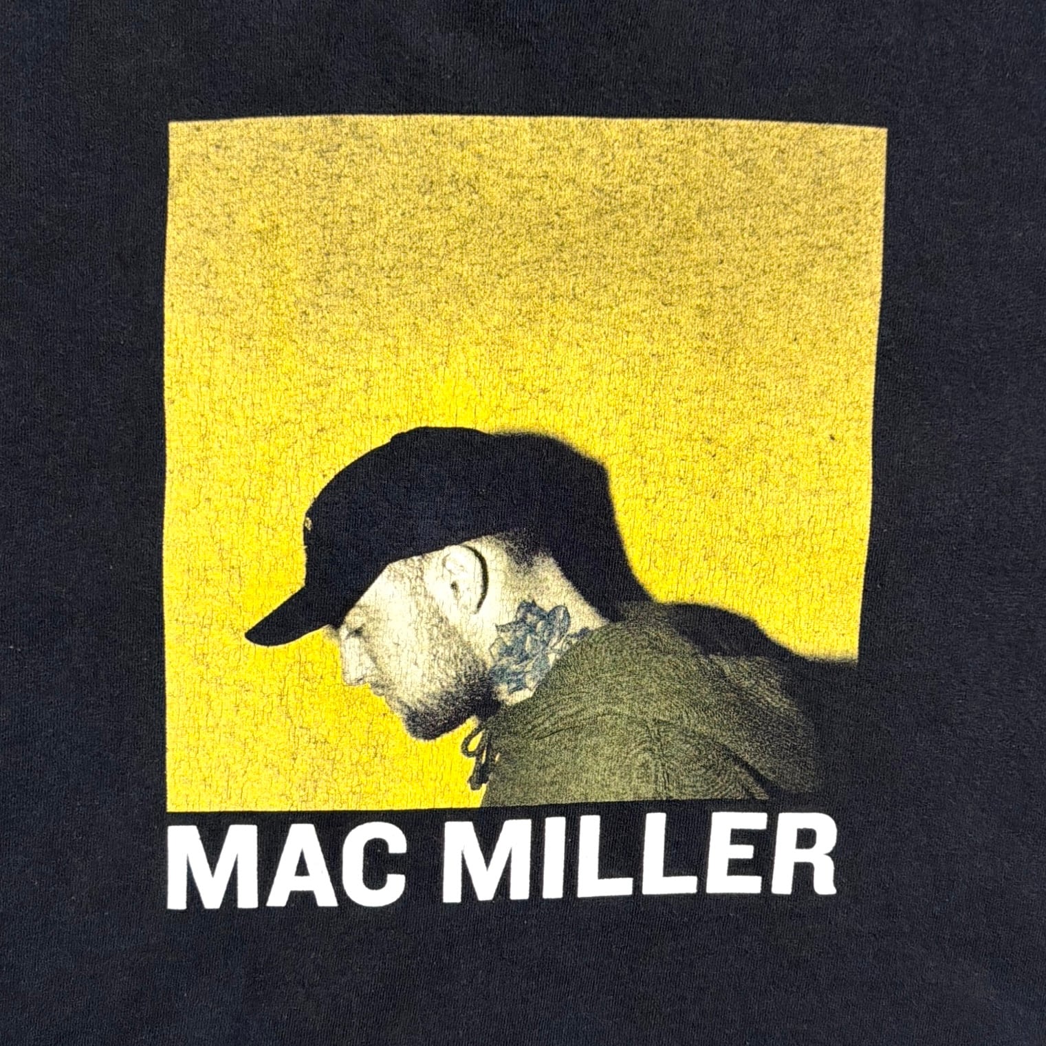 フロントにはキャップをかぶったマック・ミラーの横顔が、鮮やかなイエローベースのスクエアデザインで大きくプリントされた一枚。ボディはブラックで、カットオフ仕様の裾が古着らしいラフな雰囲気を演出します。2018年に26歳で急逝し今もなお絶大な人気を誇るアーティストです。