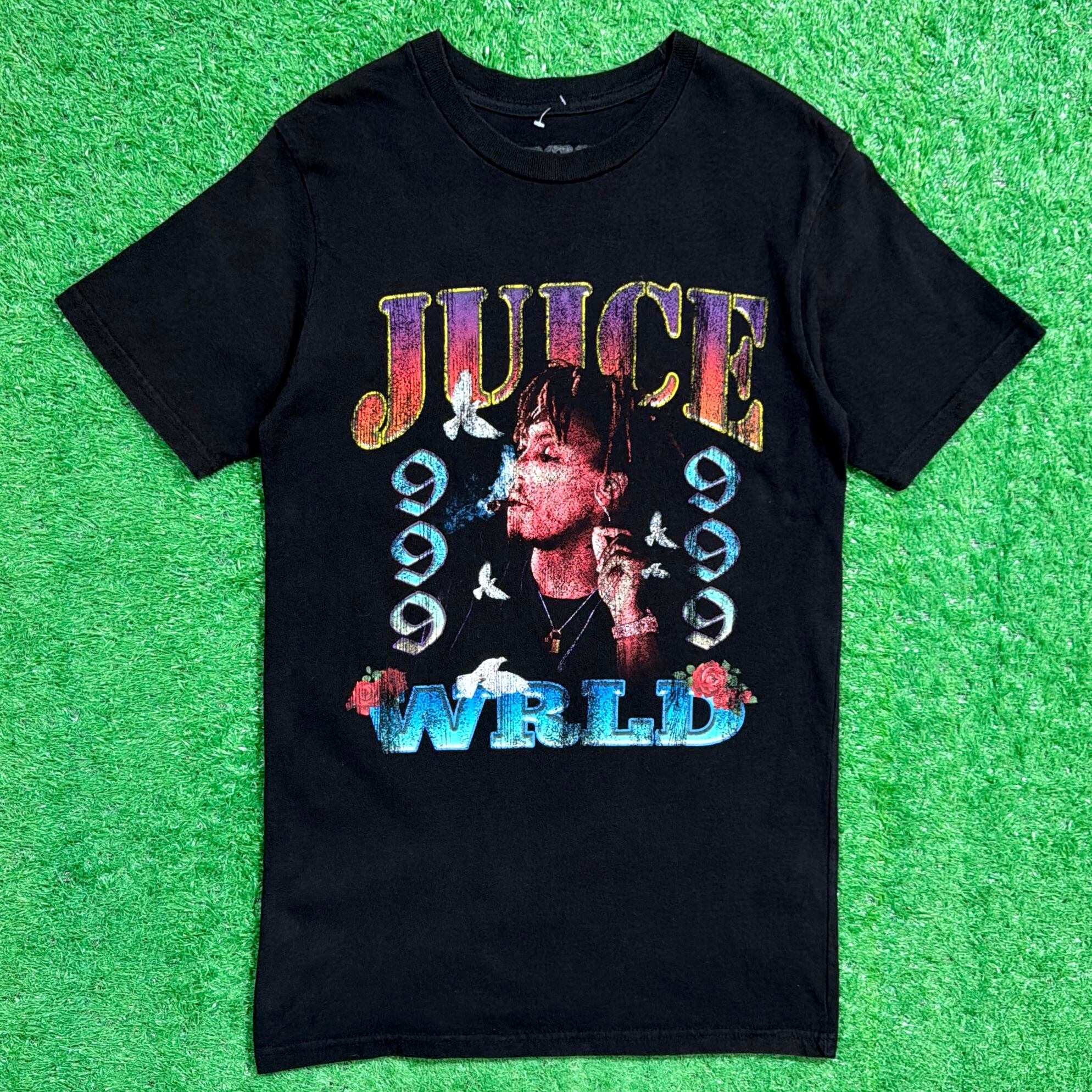 フロントにはポートレートと代表的な「999」モチーフ、白い鳩やバラなどを大胆にプリントした印象的なデザイン。Juice WRLDは「Lucid Dreams」などのヒットで知られ、2019年に21歳で急逝したアーティストとしても知られています。グラフィックと鮮やかなカラーリングが存在感抜群の一枚です。