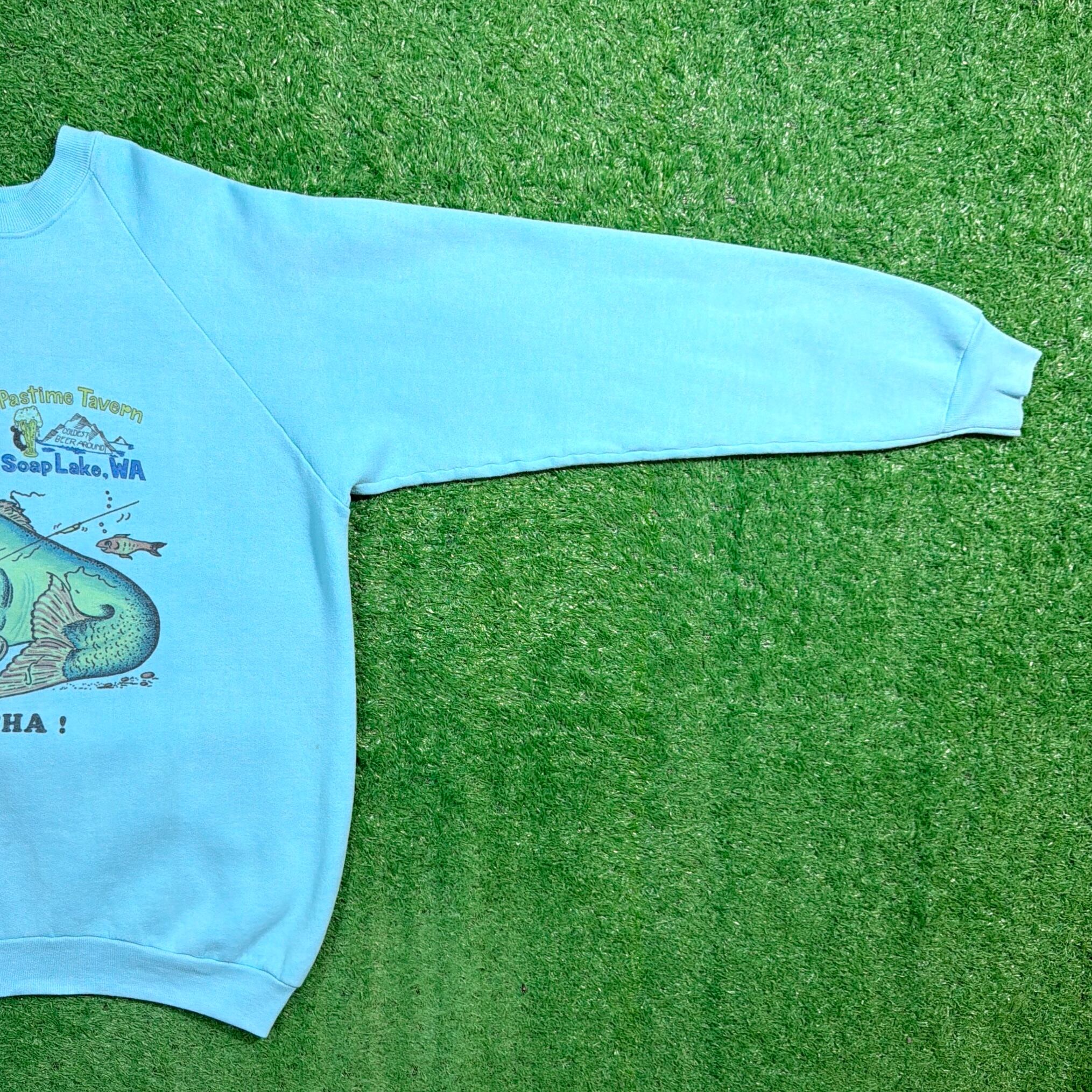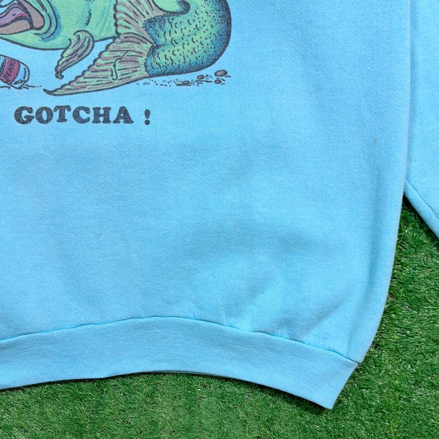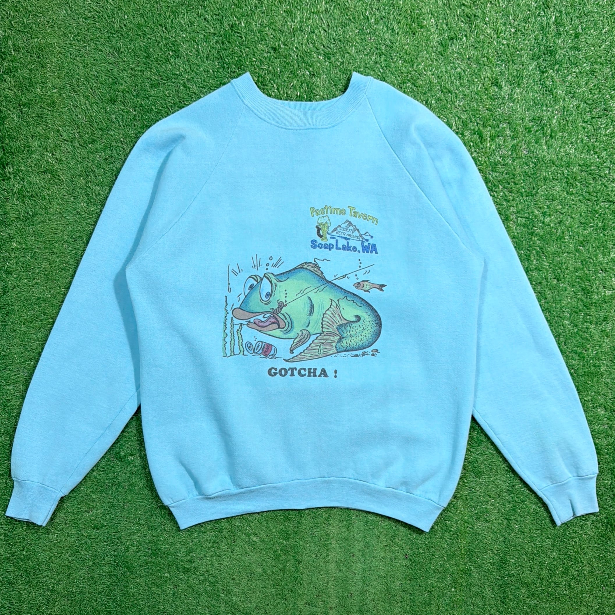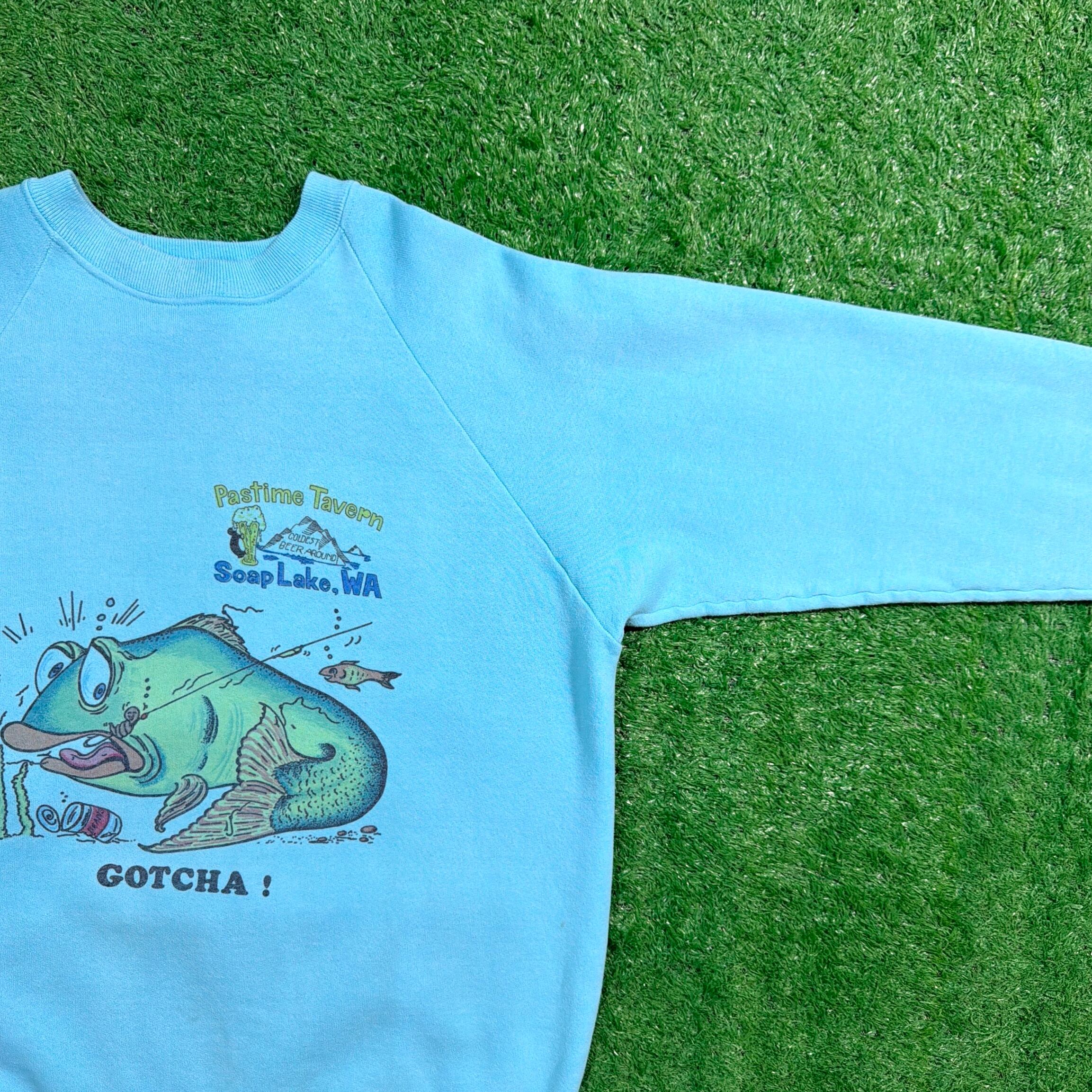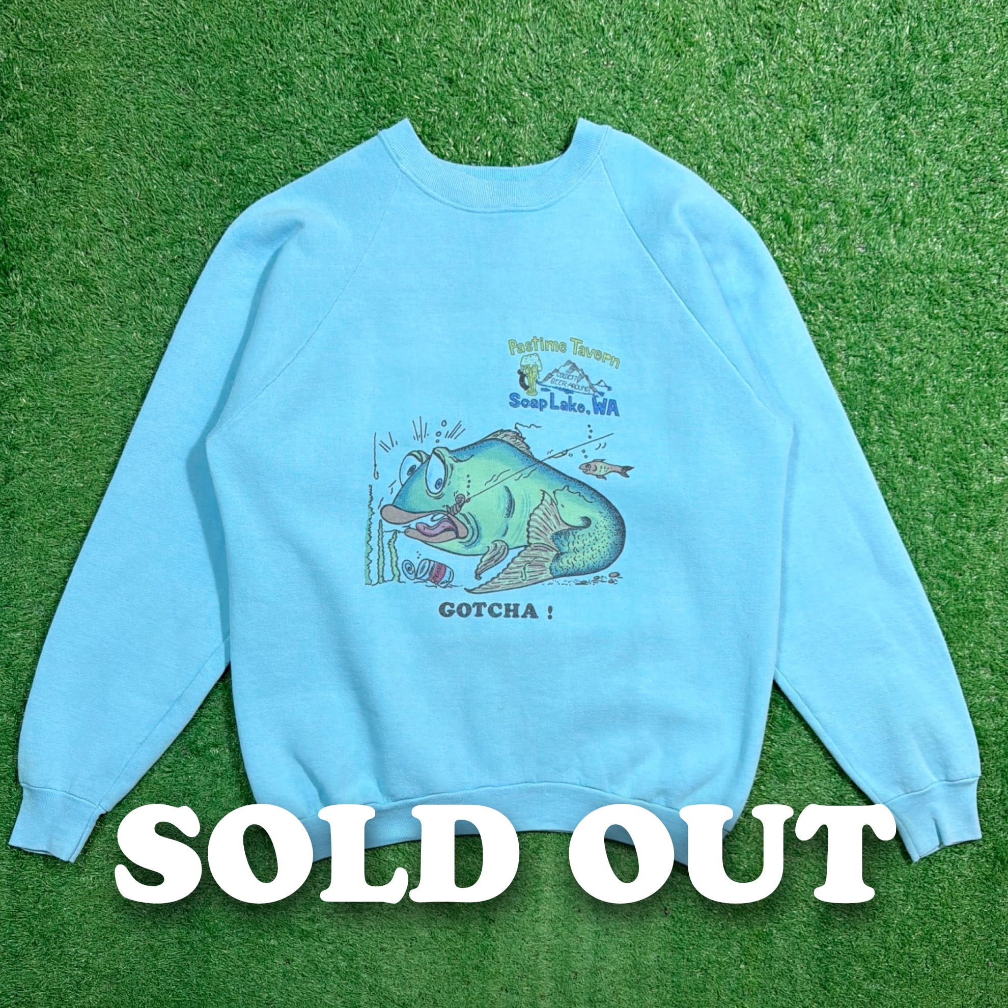 フロントには「PerTime Tavern Soap Lake, WA」と書かれたプリントと、魚が餌にかかって驚くコミカルなお魚イラスト。下部には「GOTCHA!」(=「捕まえた!」)の文字が添えられています。ワシントン州ソープレイクのパブ(PerTime Tavern)のお土産スウェットとして作られた一枚と考えられます。