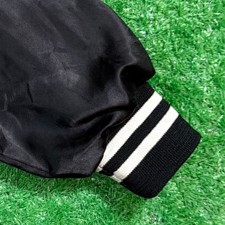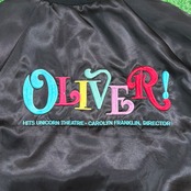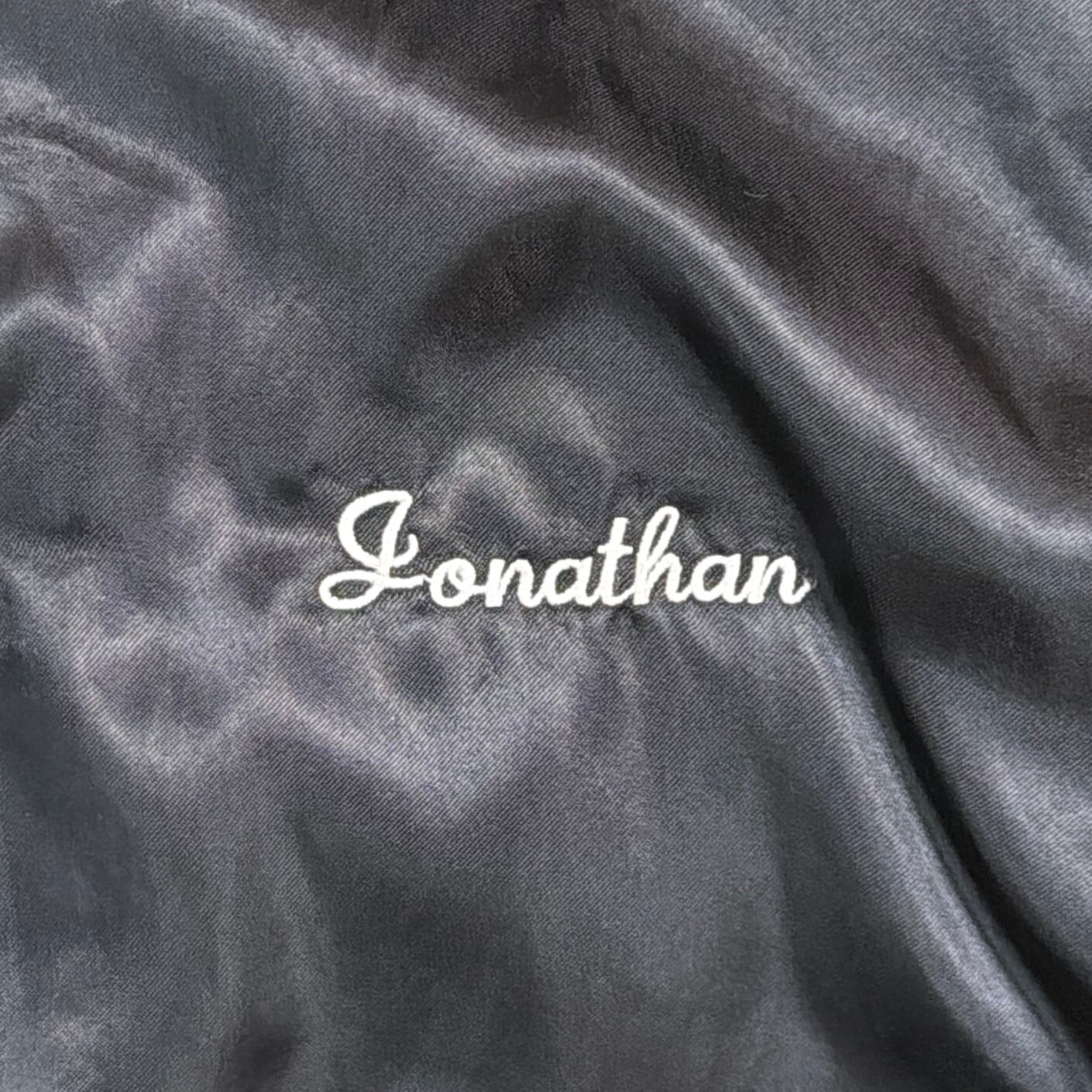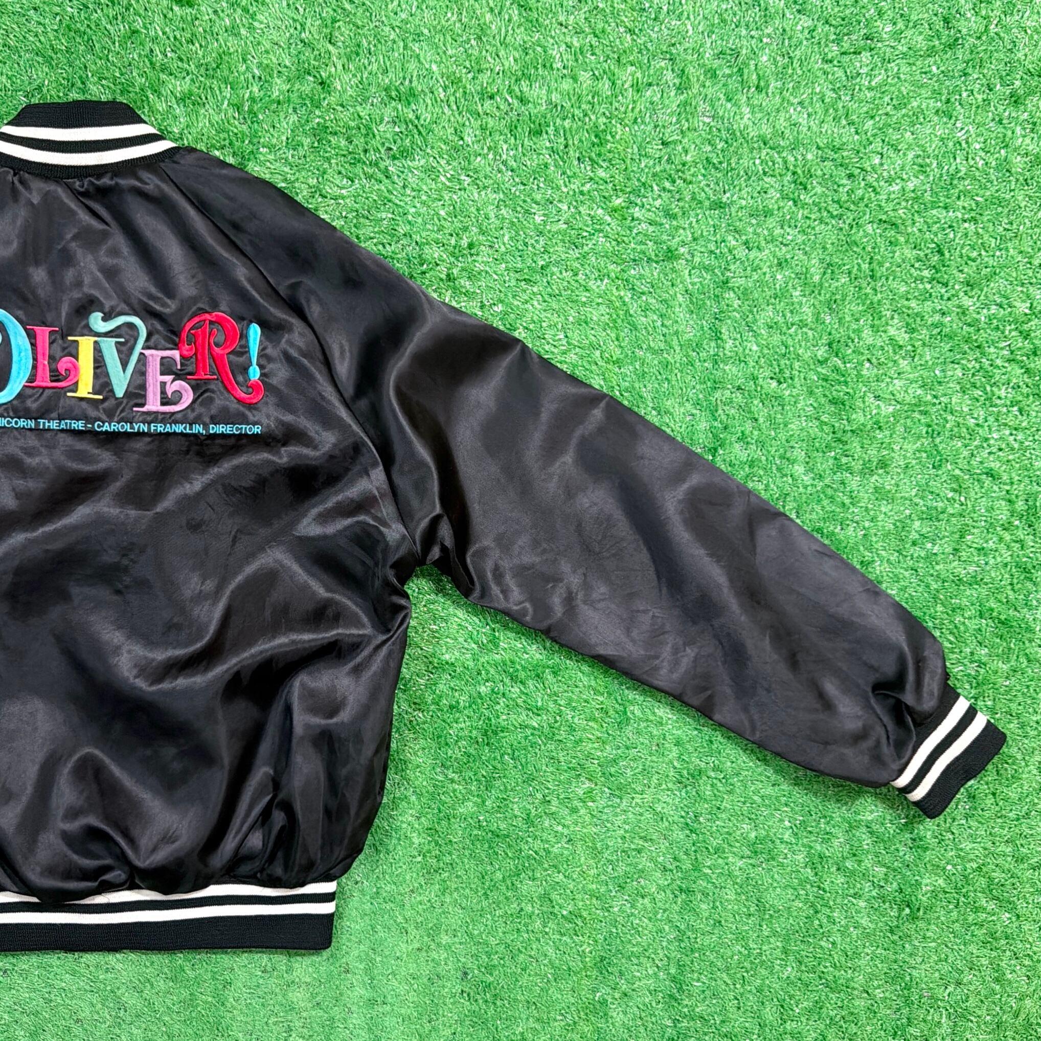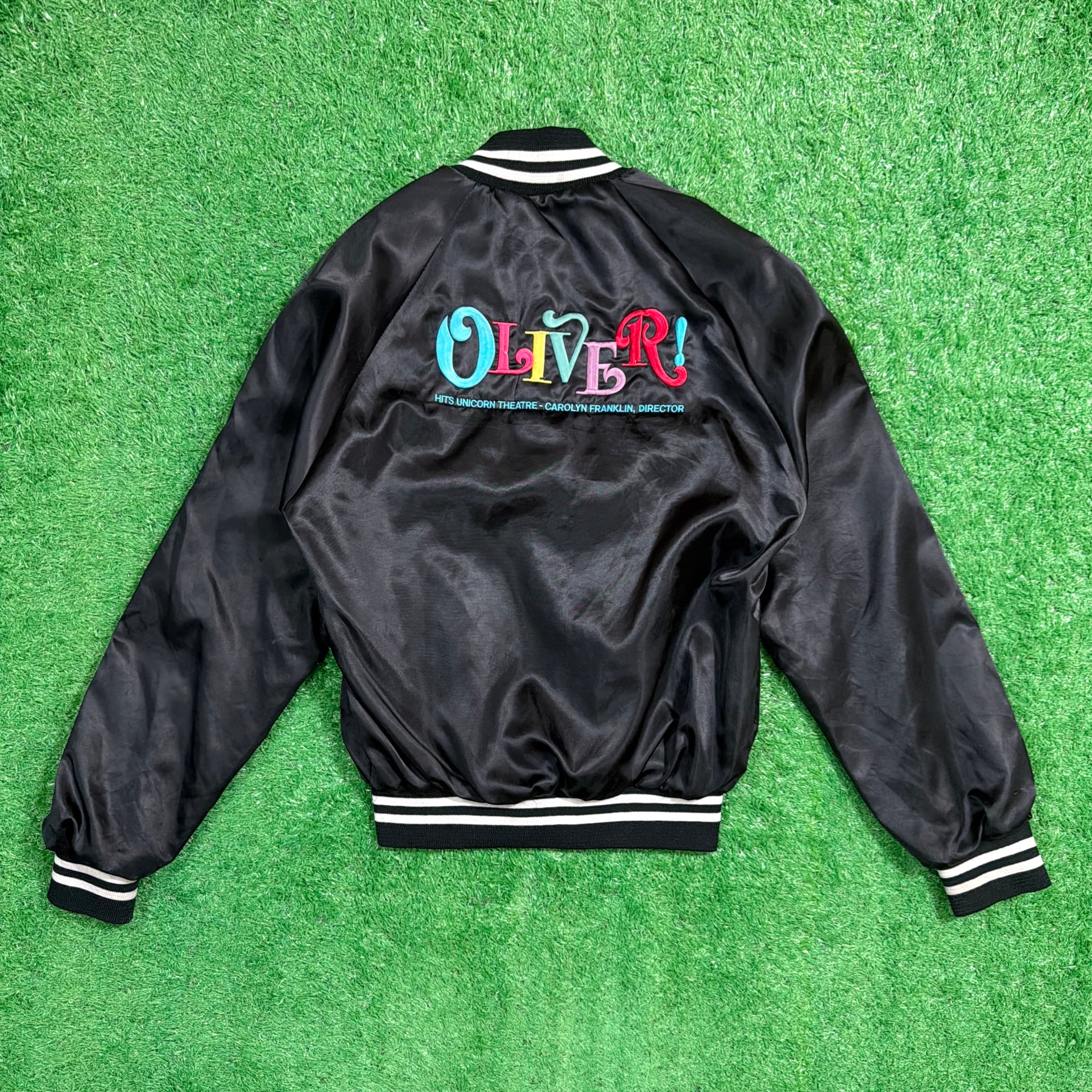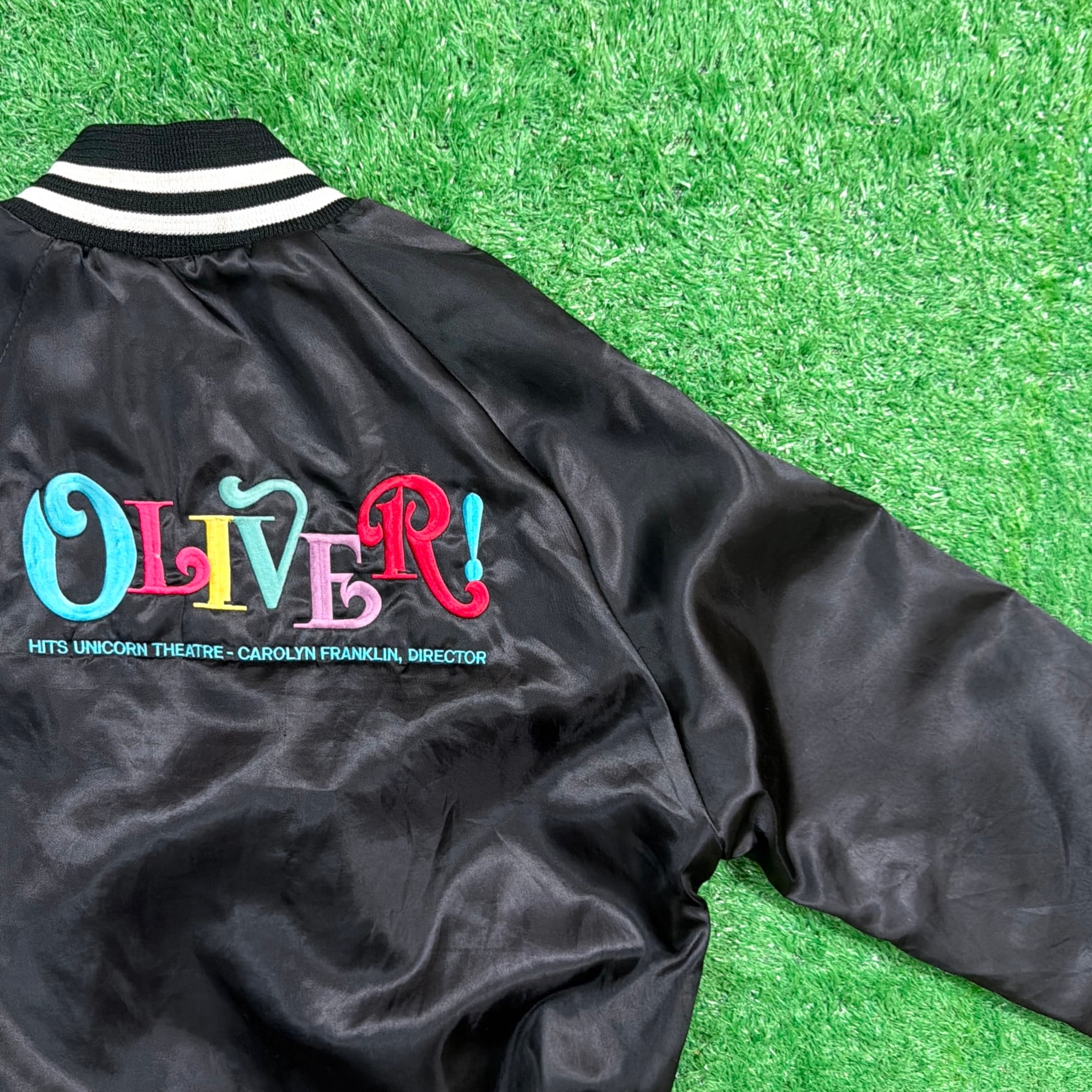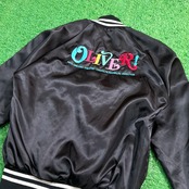 フロント左胸には「Jonathan」のネーム刺繍、背面にはミュージカル「OLIVER!」のカラフルなロゴ刺繍が存在感抜群。ブラックの光沢サテンにビビッドな刺繍が映える1着です。Sサイズ表記で、やや小さめの作りになっています。