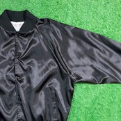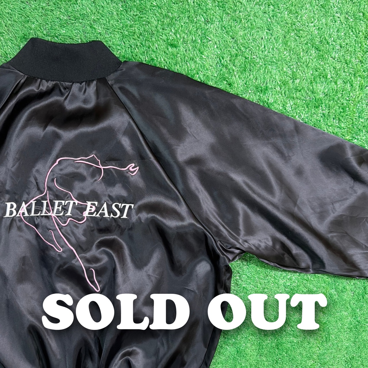 1990年代のアメリカ製、光沢のあるサテン地が目を惹くブラックジャケットです。背面には「BALLET EAST」の文字と、バレリーナのシルエットをライン刺繍で表現した印象的なデザイン。艶感のある素材と控えめながら存在感のある刺繍が、90sらしい個性を際立たせています。リブ付きでスタジャンのようなシルエットに仕上げられ、軽く羽織るだけでスタイルが決まる一着です。