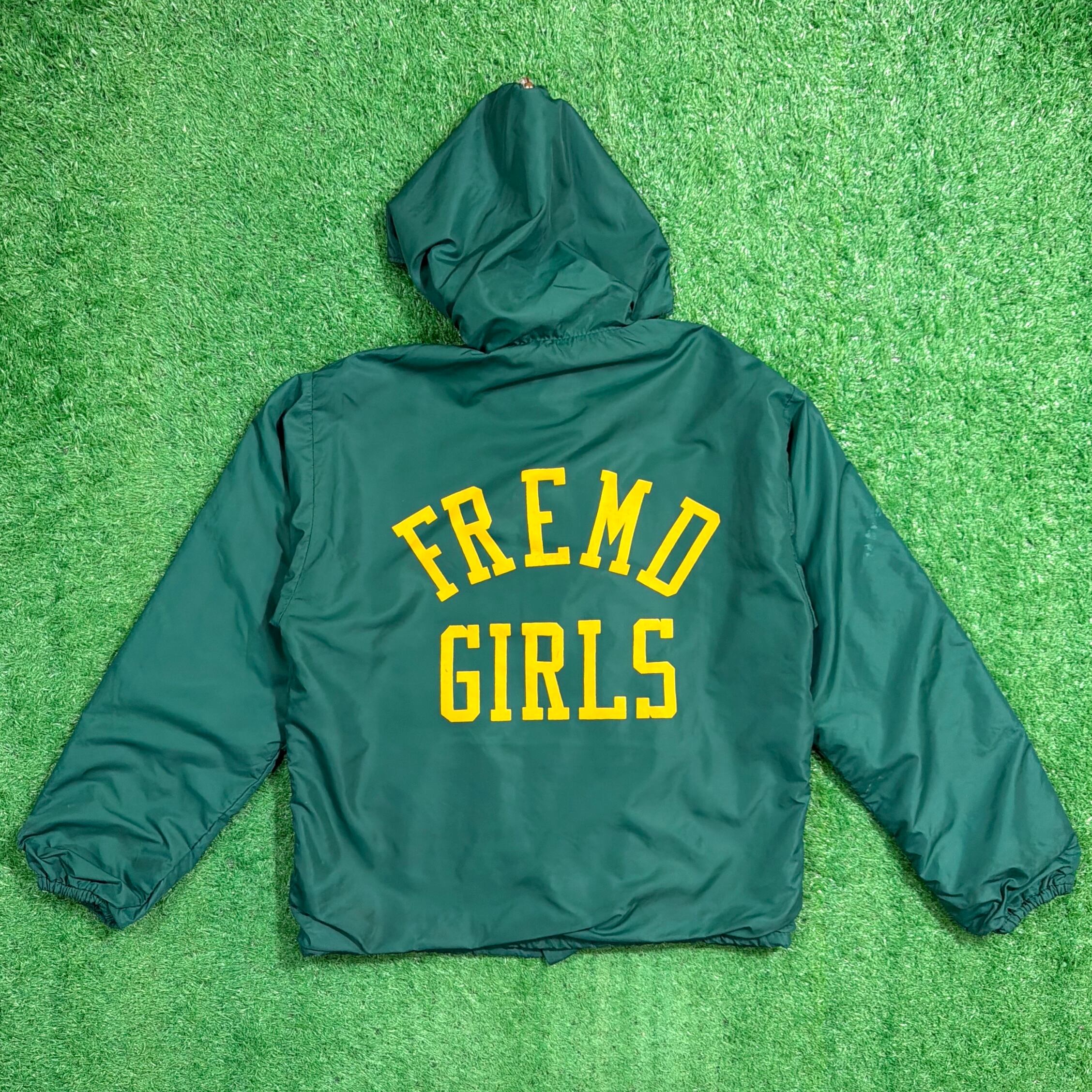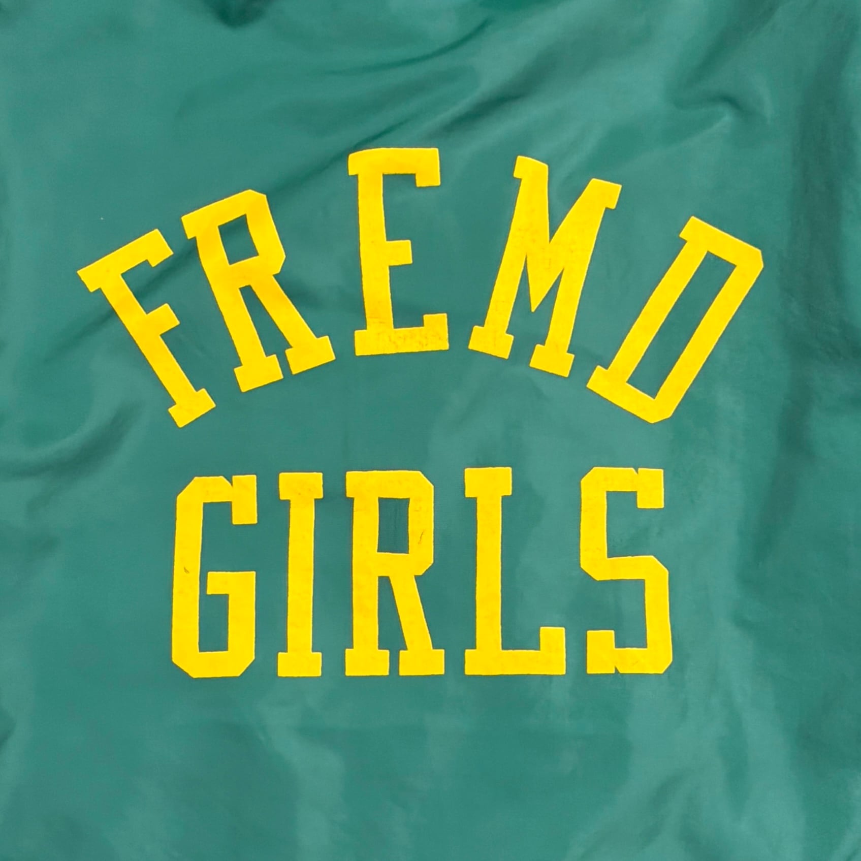 フード部分にジップが付いており、開くことでセーラー襟のデザインとしても楽しめるユニークな仕様。バックには「FREMO GIRLS」のイエロー文字が大きくプリントされ、チアリーダー風のレトロな雰囲気が漂います。薄手のポリエステル生地に裏地付きで、軽やかに羽織れるのも魅力です。