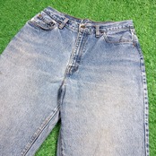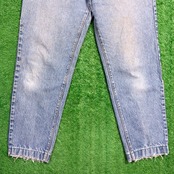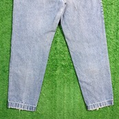 程よく色落ちしたライトブルーのデニムに、裾直し部分の仕上げが特徴で可愛いアイテム。ほつれた裾がヴィンテージらしいラフな雰囲気を演出しています。ハイウエストとゆるめのテーパードシルエットで、80sならではの女性らしいスタイルを楽しめる一本です。