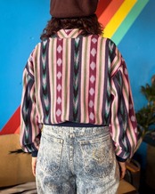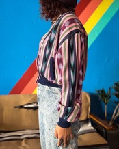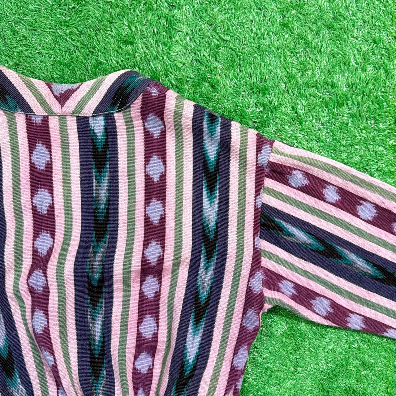 職人による手織りの生地を贅沢に使用し、ネイティブ感のある縦に走る幾何学模様が存在感抜群。独特の色合わせと織り柄が温かみを感じさせつつも、軽やかな着心地の一枚です。