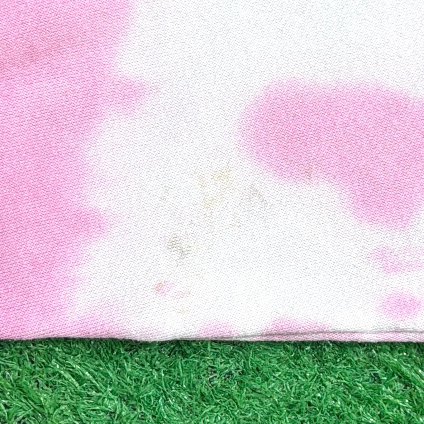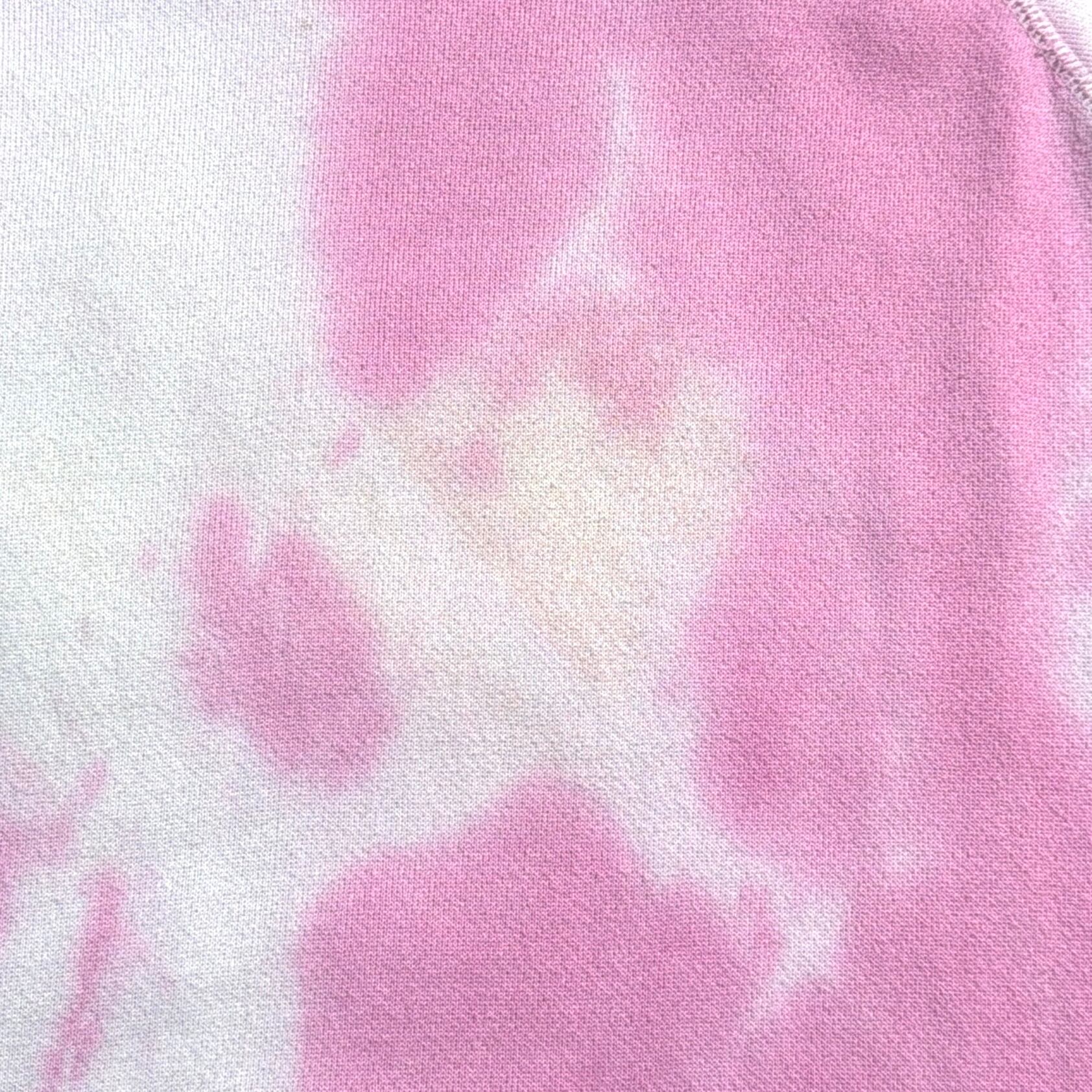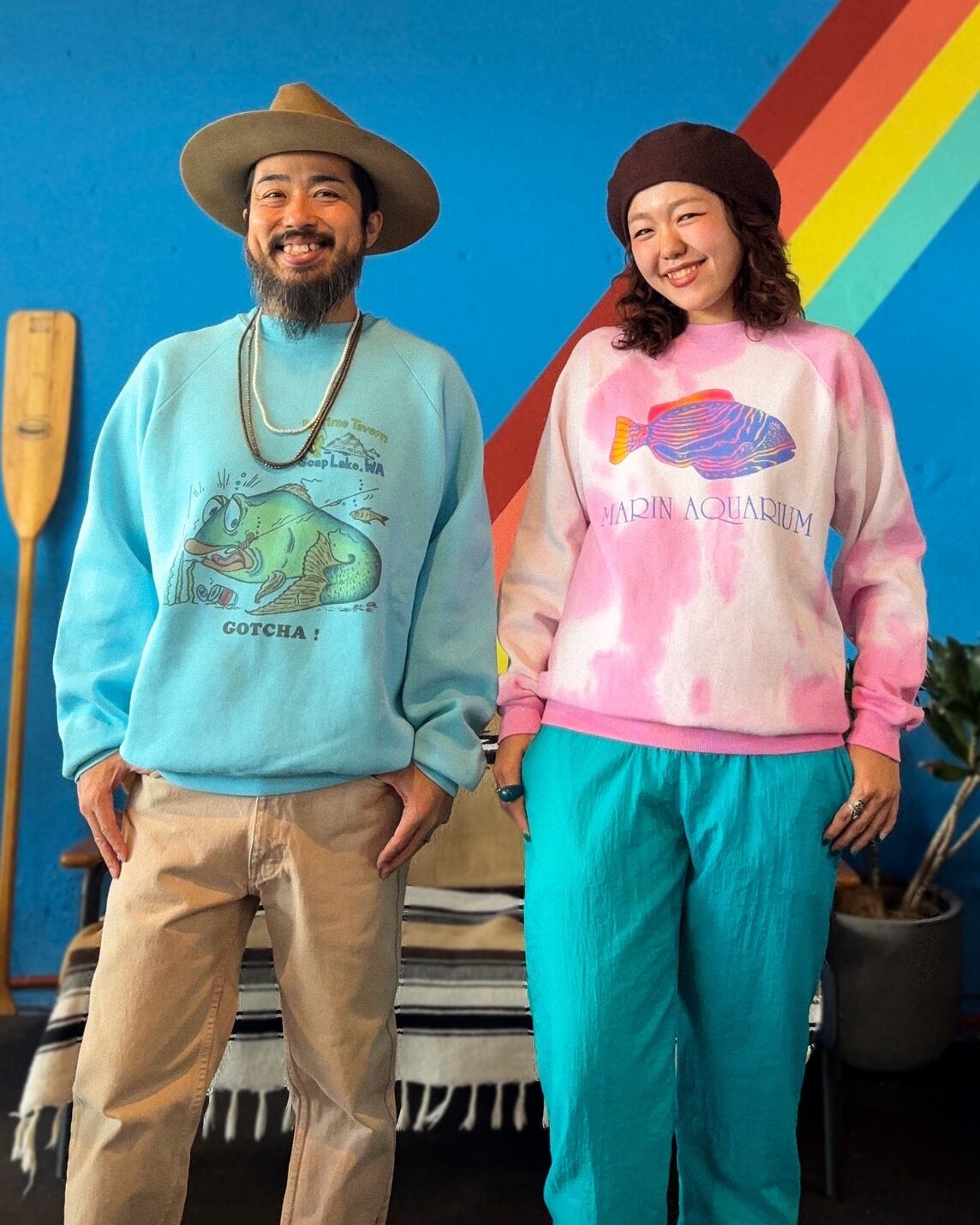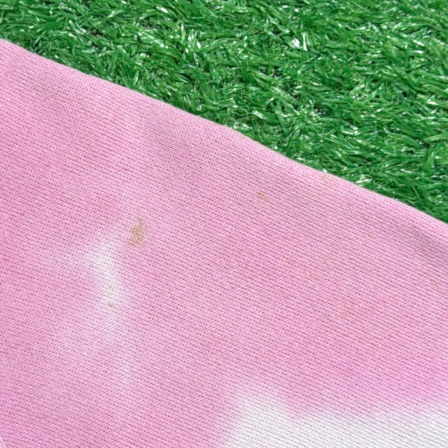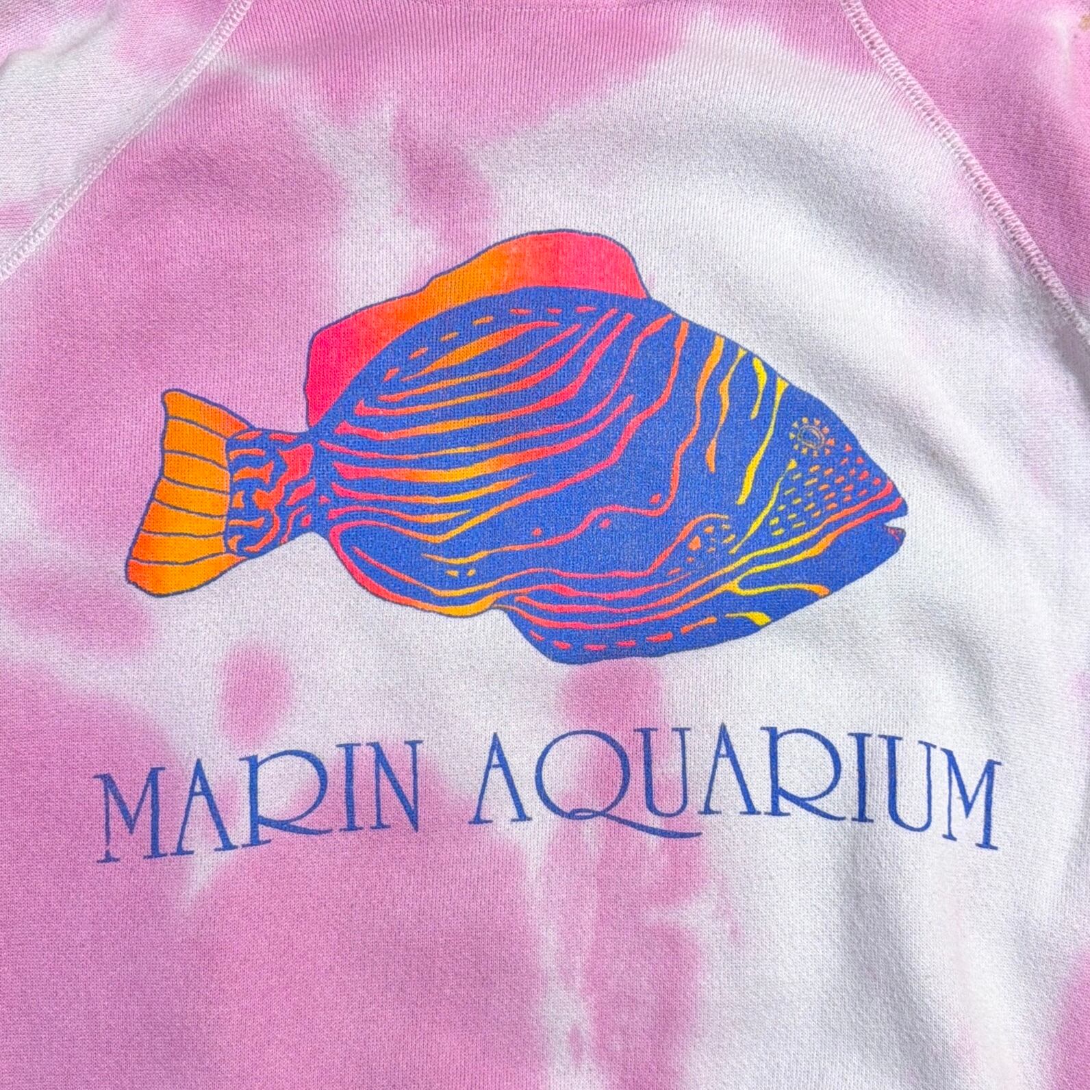 ピンクとホワイトのムラ染めタイダイボディに、鮮やかなブルーとオレンジで描かれた魚のイラストが目を惹く一枚。フロントには「MARIN AQUARIUM」のロゴが入っており、当時の水族館スーベニアらしいレトロでポップな雰囲気を楽しめます。