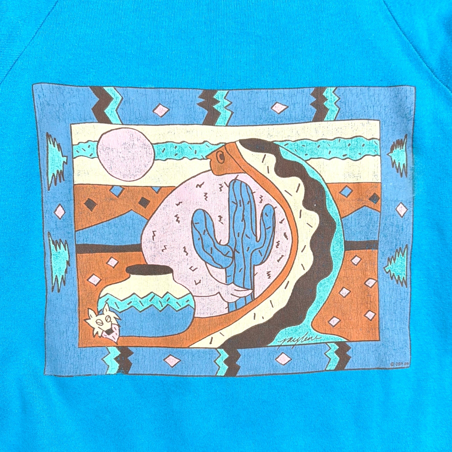 鮮やかなブルーをベースに、中央にはサボテンや月、ネイティブ柄の壺などをポップに描いたイラストがプリントされた一枚。砂漠の風景を思わせるデザインで、80sらしい色使いとユニークなグラフィックが目を惹きます。
