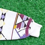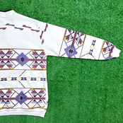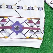 ホワイトボディにパープル・イエロー・レッドなどの幾何学模様が全面に施され、オルテガ風のネイティブパターンが目を惹く一枚。ヘンリーネック仕様で、フロントのボタンデザインがさりげないアクセントになっています。
