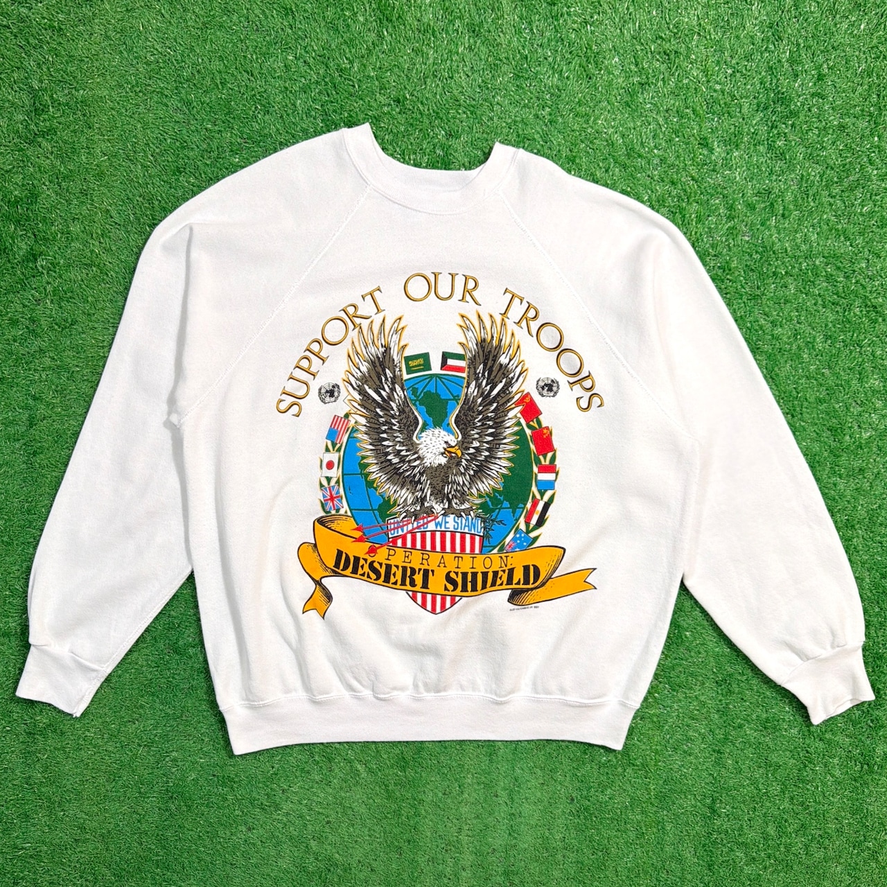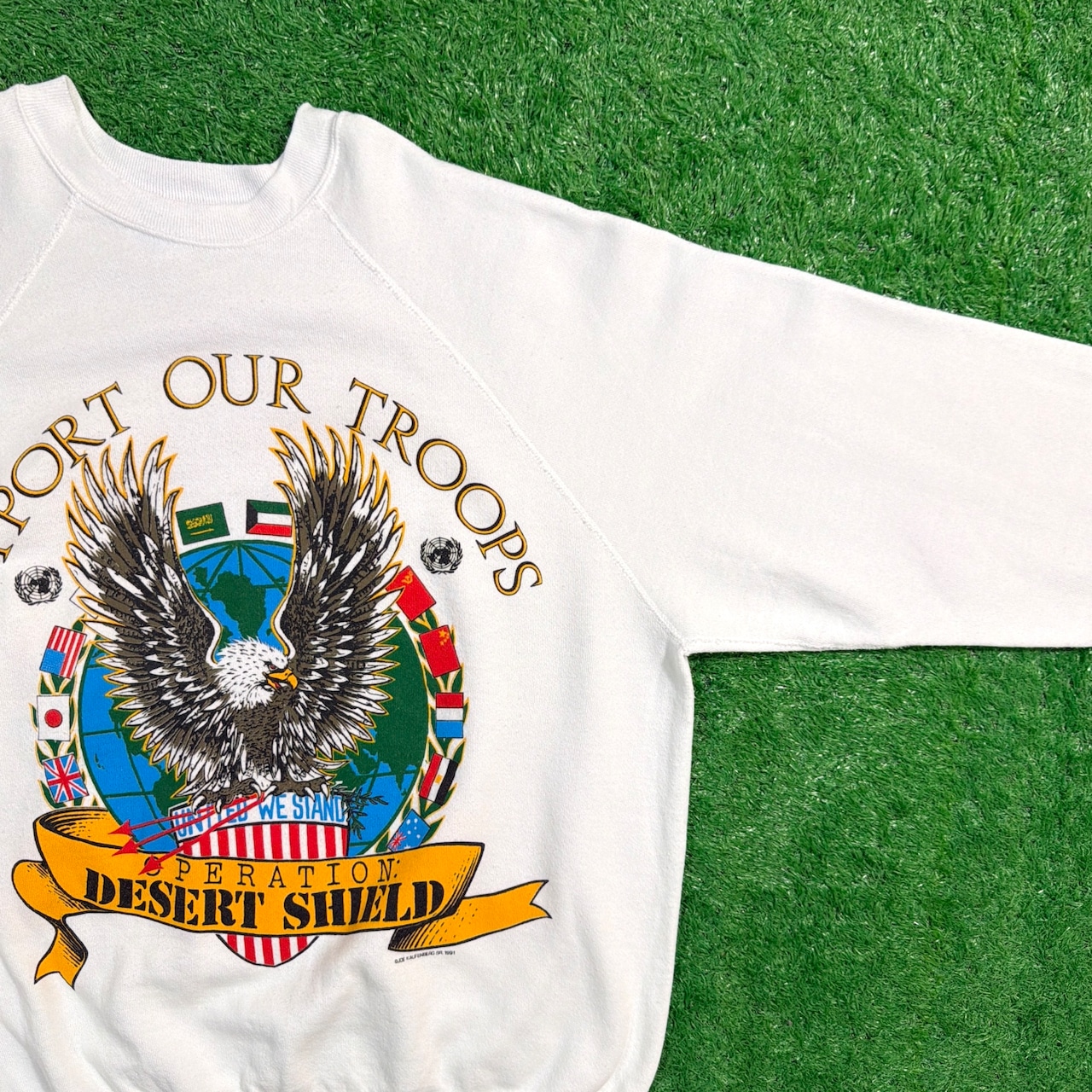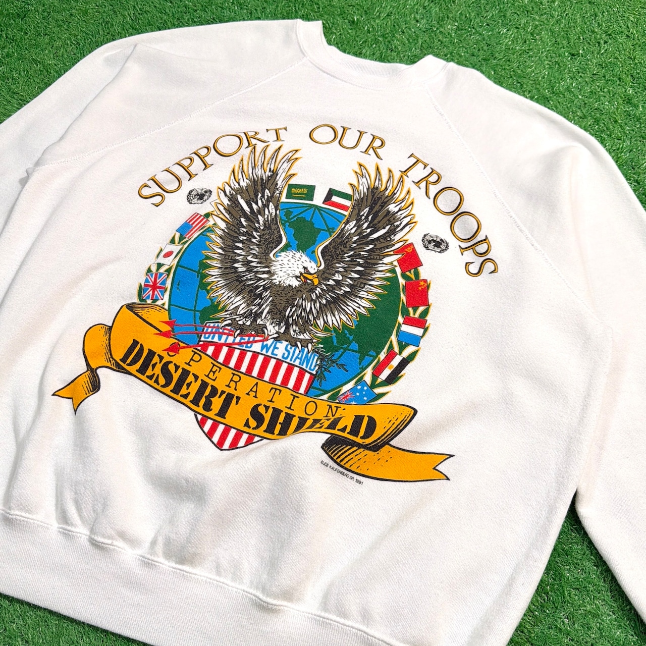 フロントには「SUPPORT OUR TROOPS」の文字と共に、大きなイーグルイラスト、世界各国の国旗、そして「OPERATION DESERT SHIELD」のリボンが描かれた迫力あるデザイン。