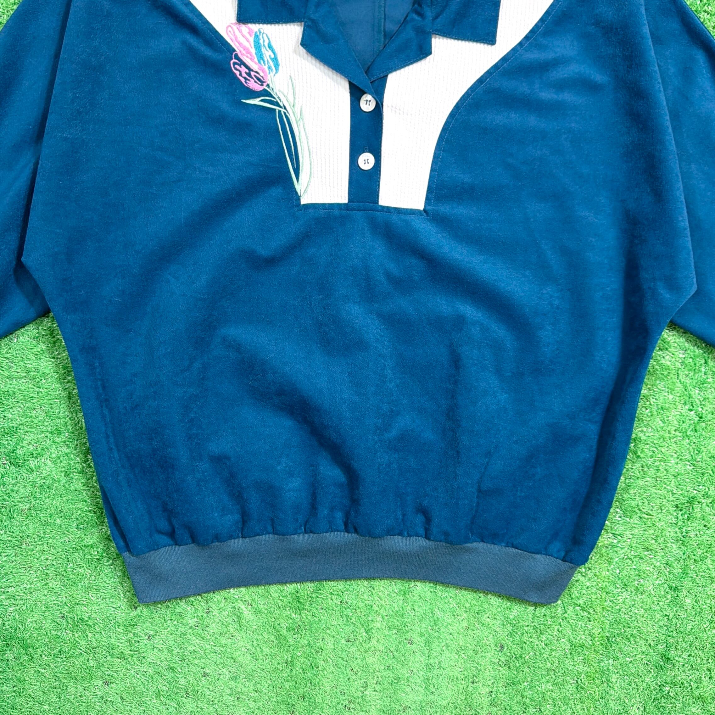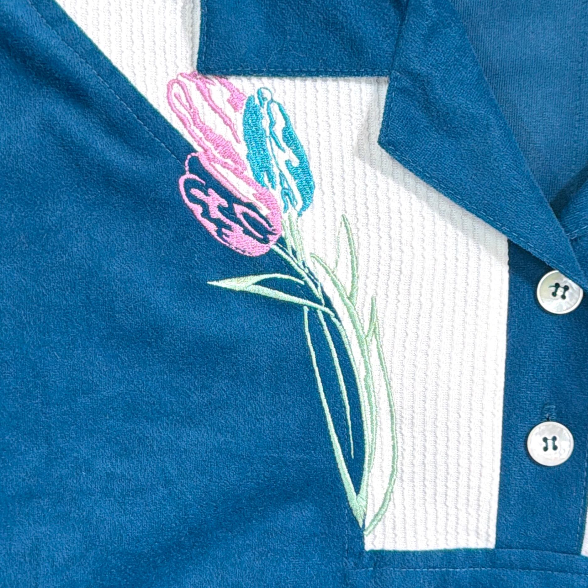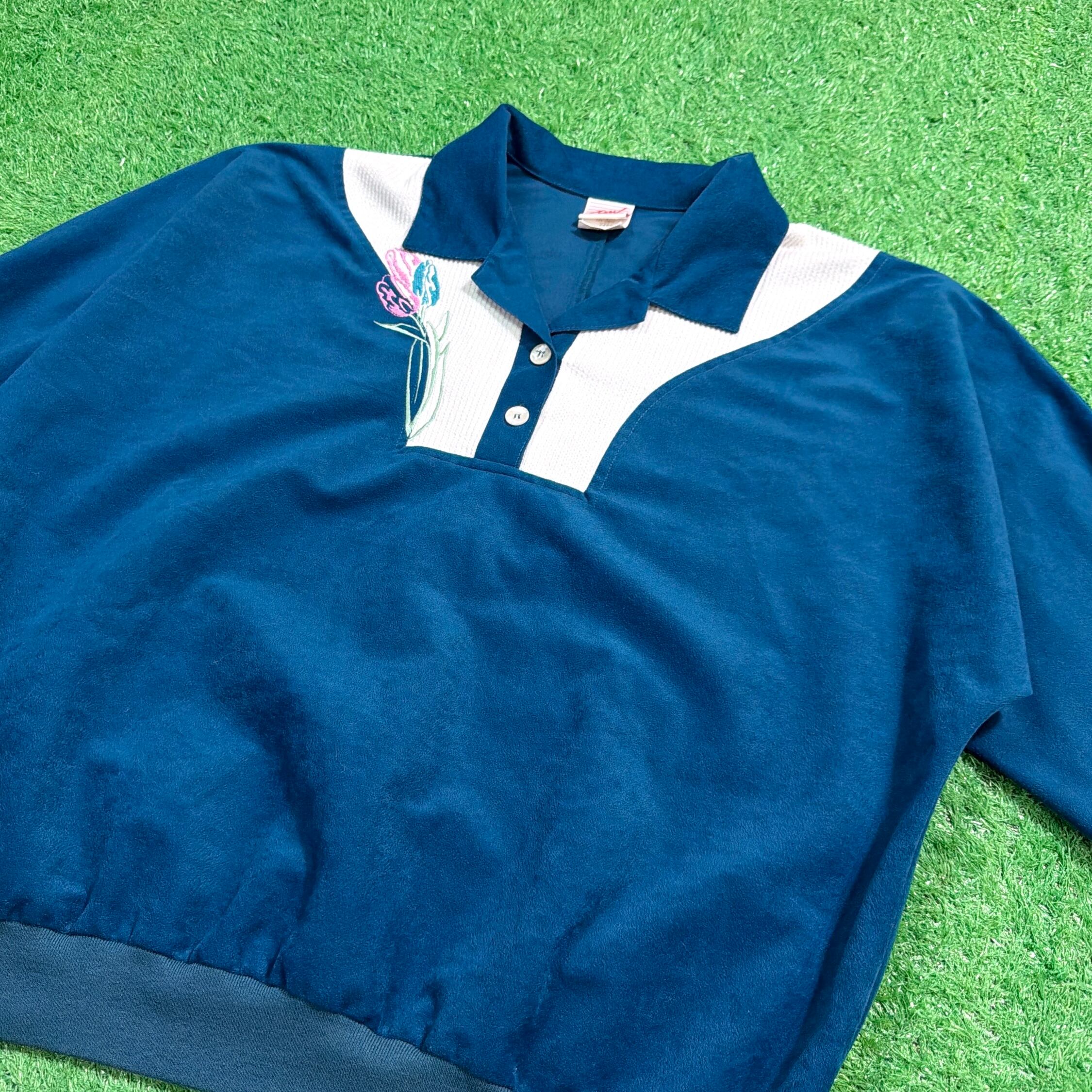鮮やかなブルーの生地はポリエステル素材で、光沢感のあるベロア調の質感が魅力。胸元にはチューリップのような花の刺繍が入り、スポーティーなディテールとフェミニンな雰囲気が絶妙にミックスされたデザインです。リブ仕様の袖口と裾がシルエットをすっきり見せてくれます。