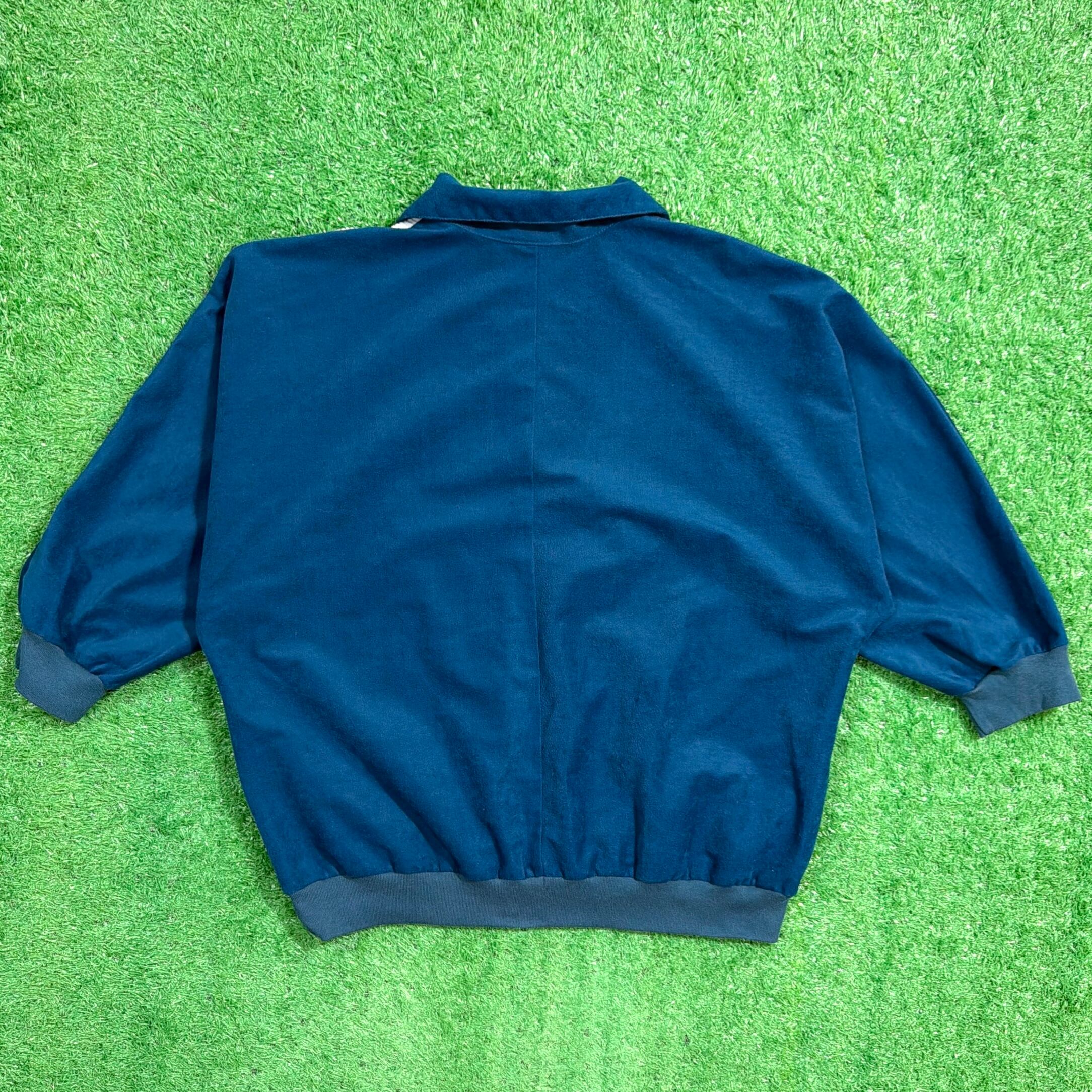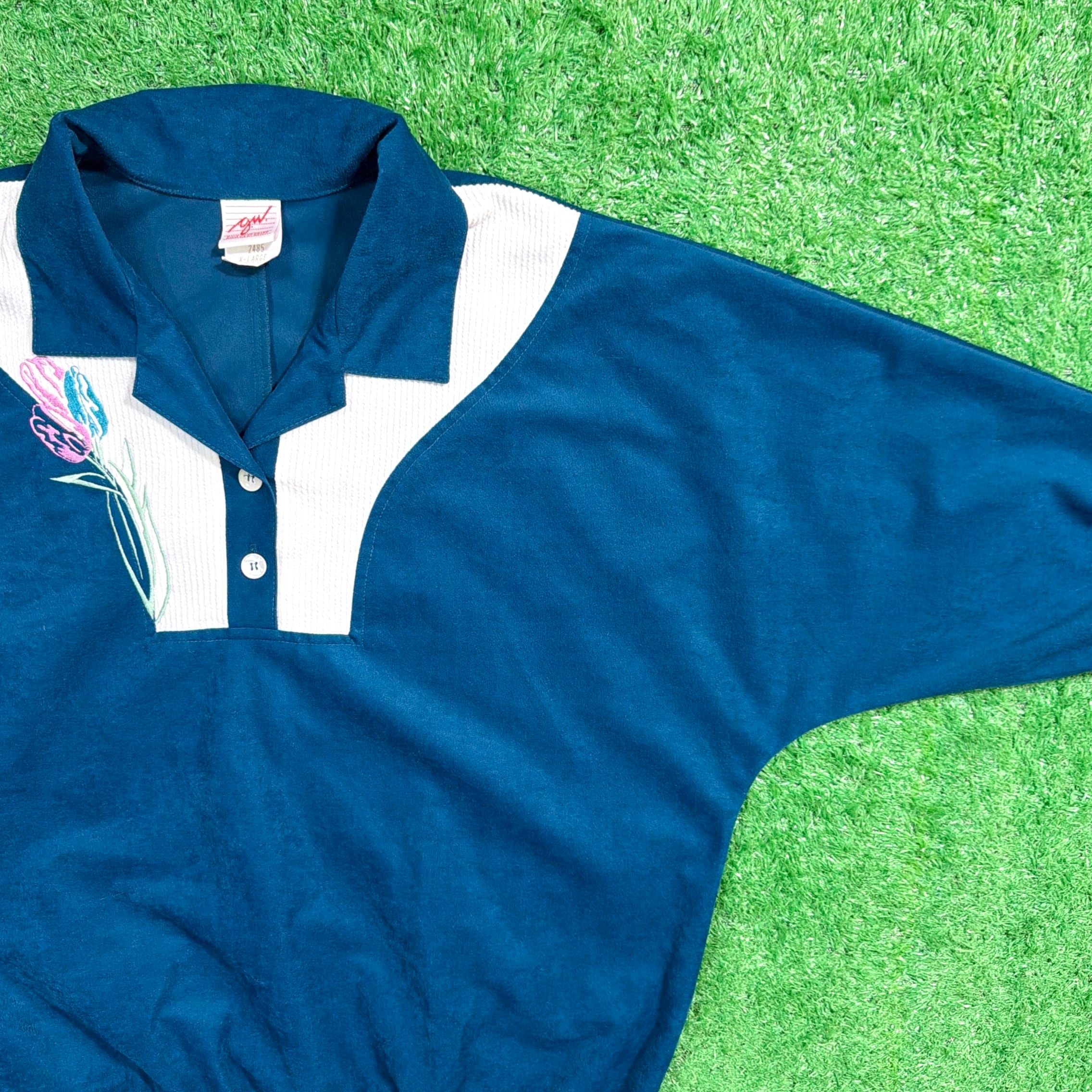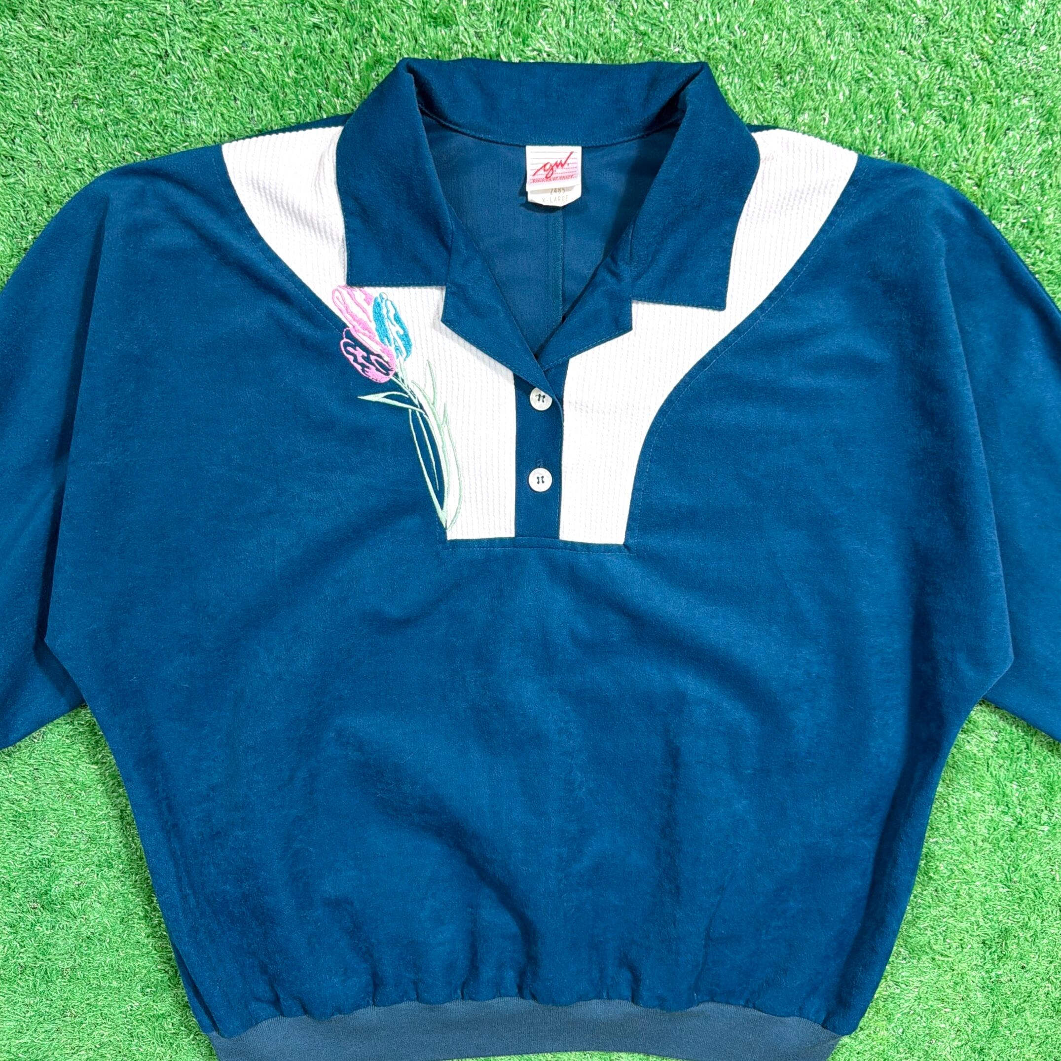 鮮やかなブルーの生地はポリエステル素材で、光沢感のあるベロア調の質感が魅力。胸元にはチューリップのような花の刺繍が入り、スポーティーなディテールとフェミニンな雰囲気が絶妙にミックスされたデザインです。リブ仕様の袖口と裾がシルエットをすっきり見せてくれます。