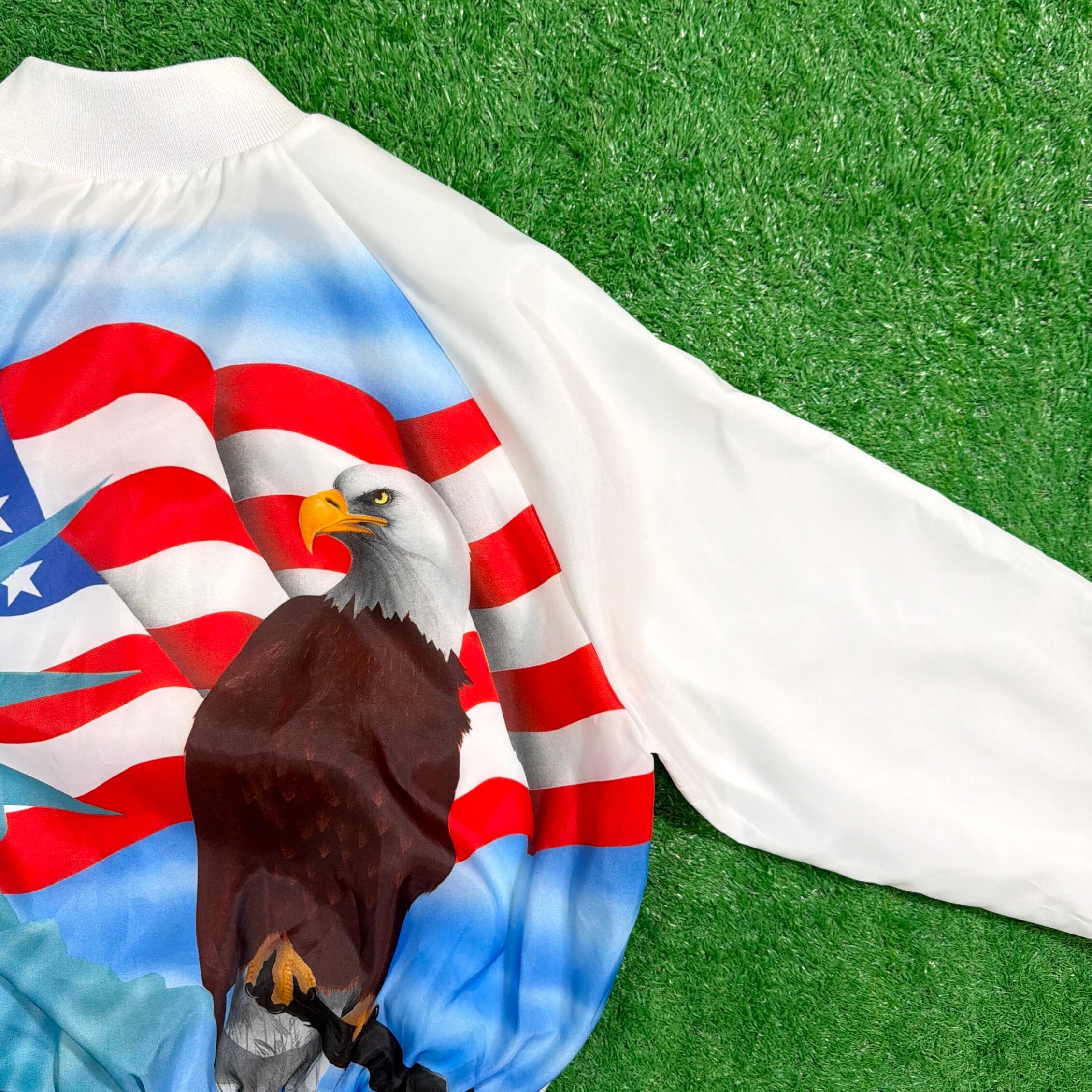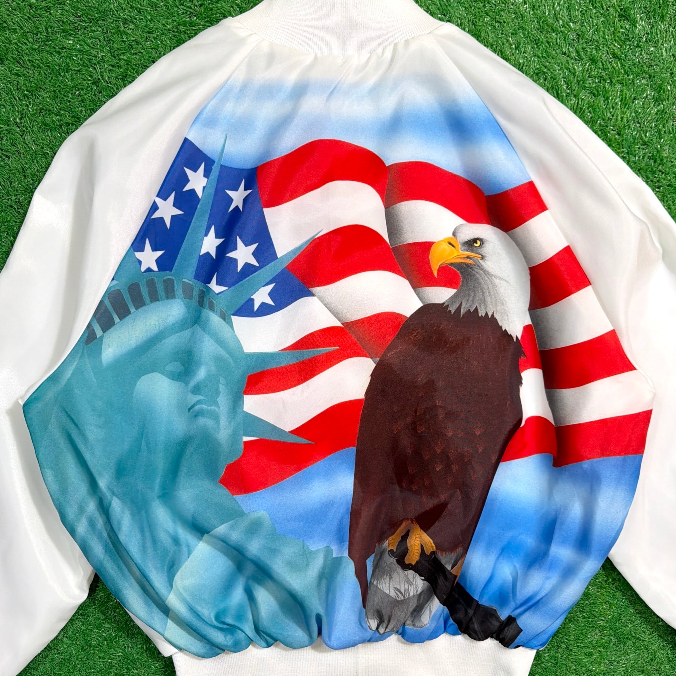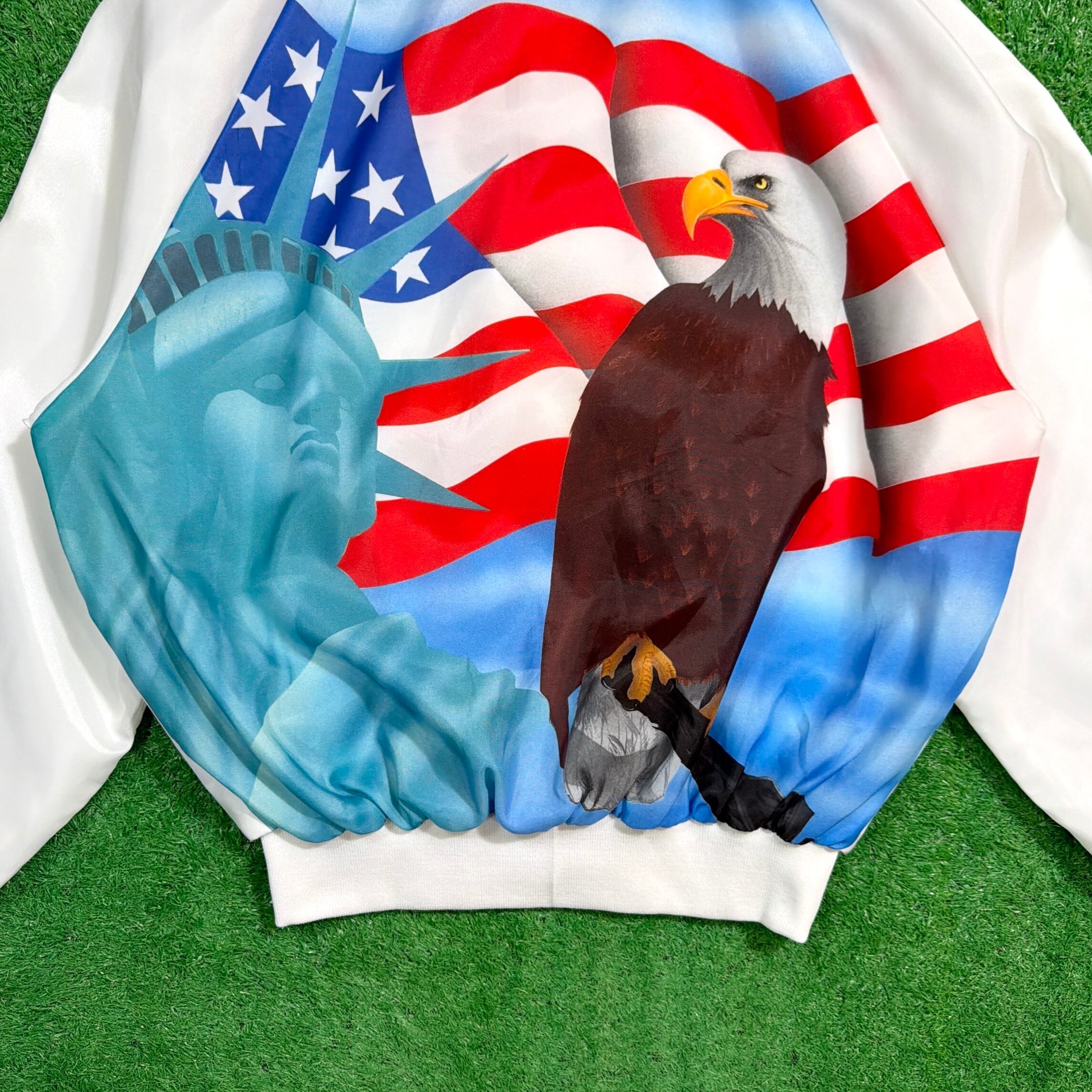 フロントはシンプルに無地ですが、背面にはイーグル、星条旗、自由の女神といったアメリカンカルチャーを象徴する大胆なデザインが描かれたインパクト抜群の一枚。薄手のポリエステル裏地付きで、軽やかに羽織れる仕様になっています。
