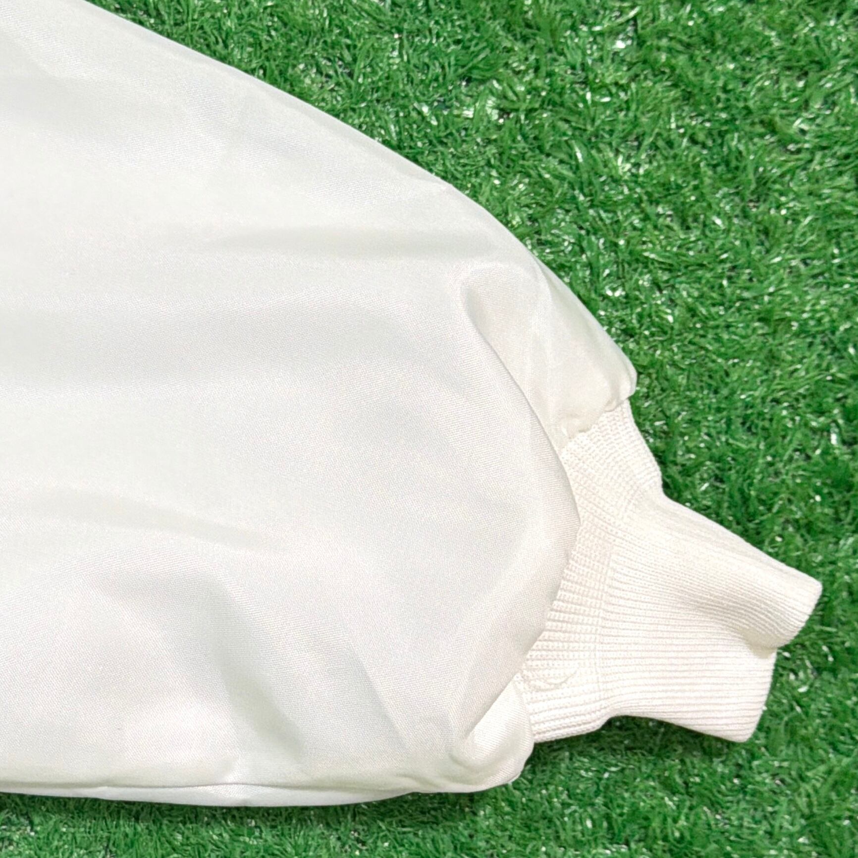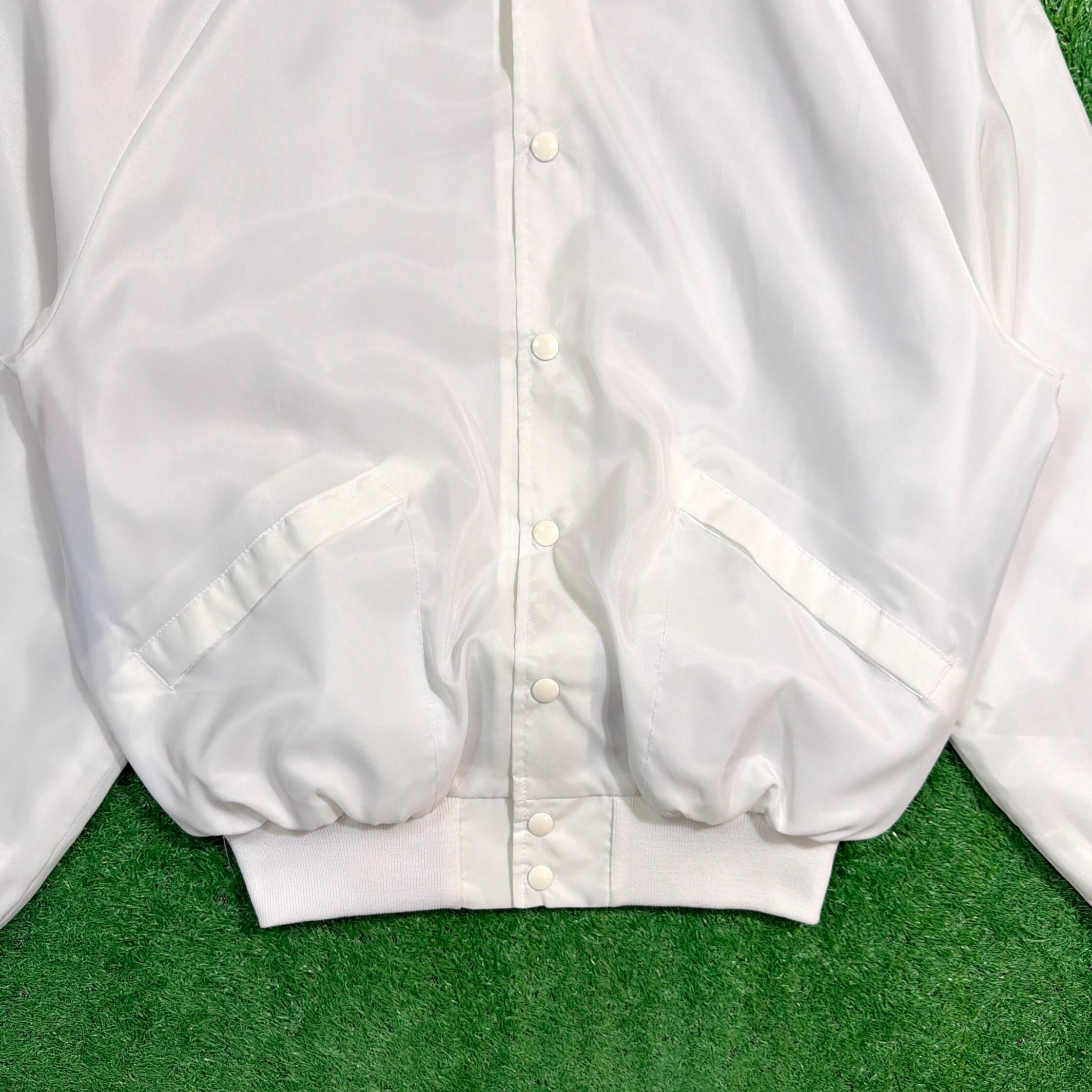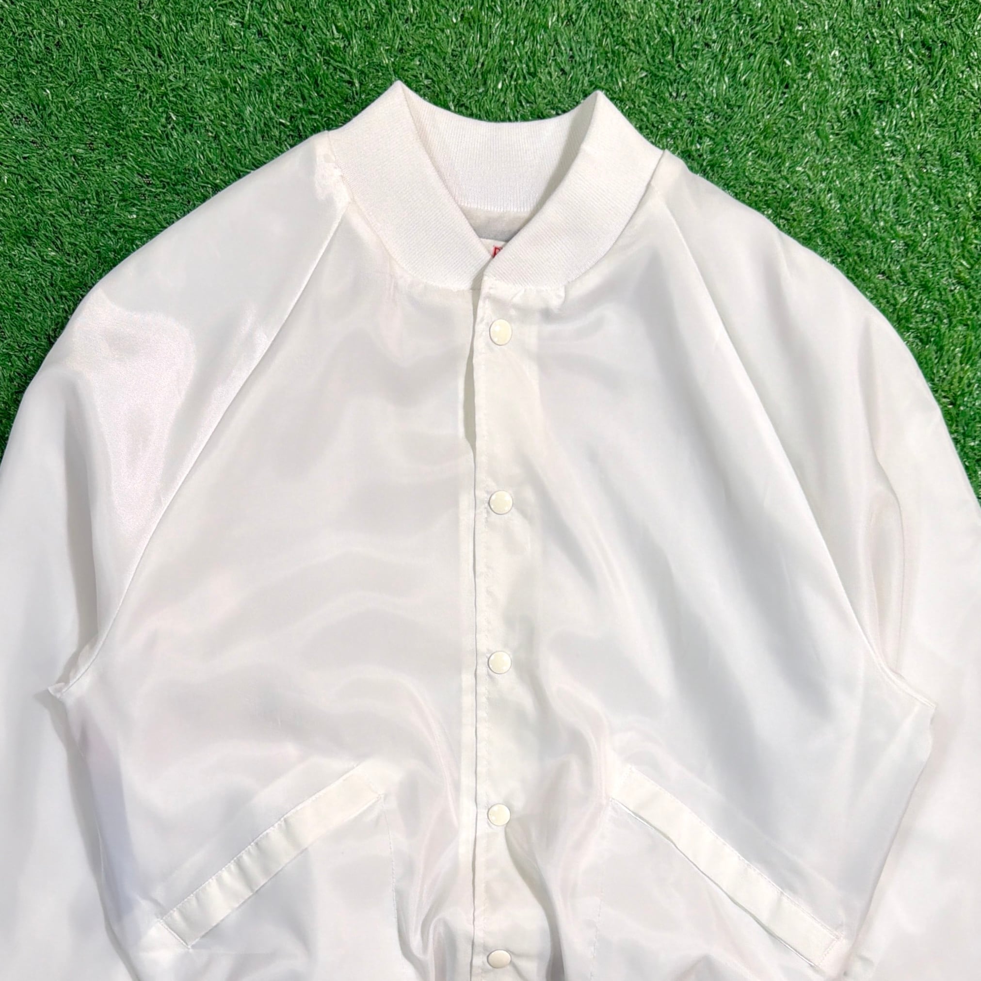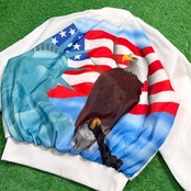 フロントはシンプルに無地ですが、背面にはイーグル、星条旗、自由の女神といったアメリカンカルチャーを象徴する大胆なデザインが描かれたインパクト抜群の一枚。薄手のポリエステル裏地付きで、軽やかに羽織れる仕様になっています。