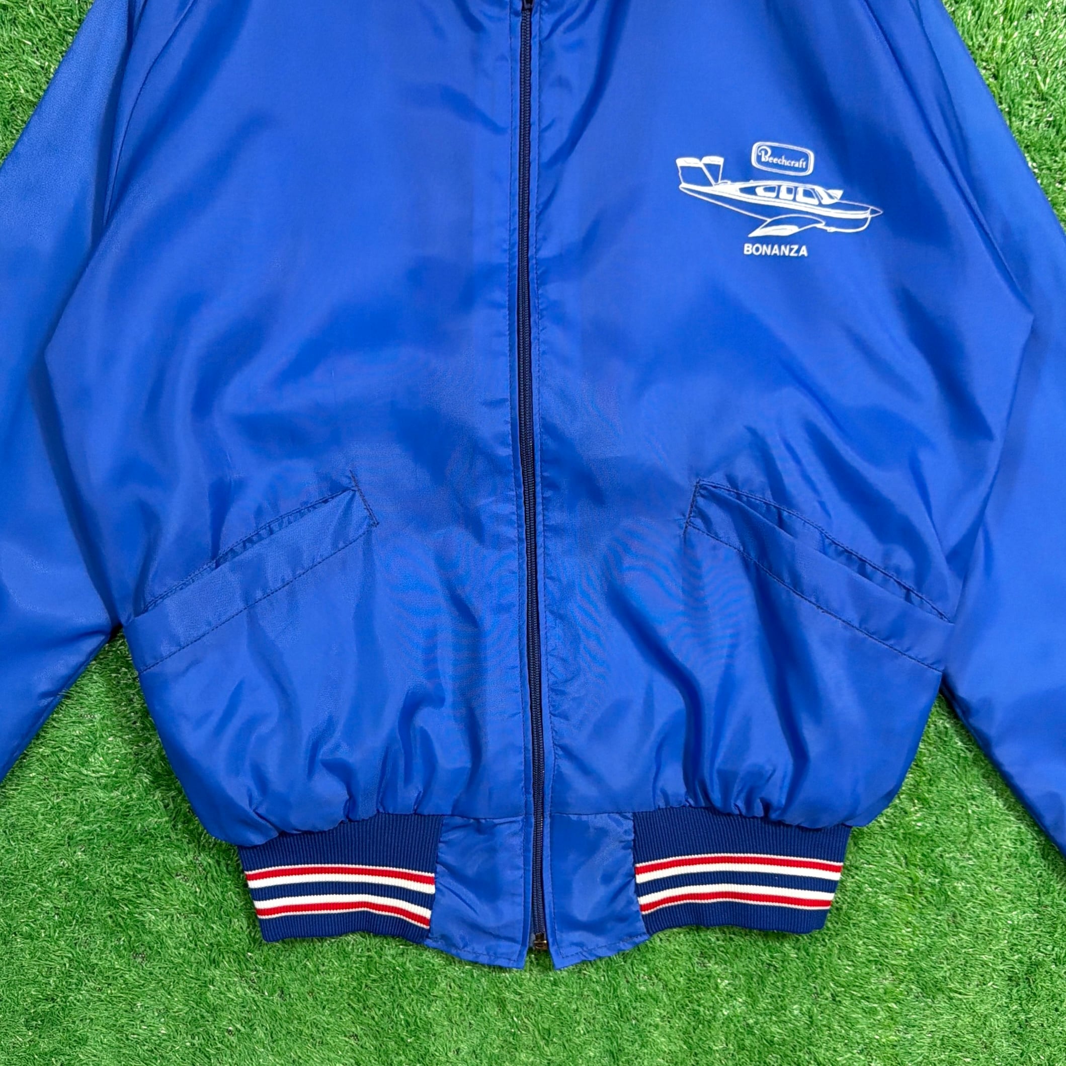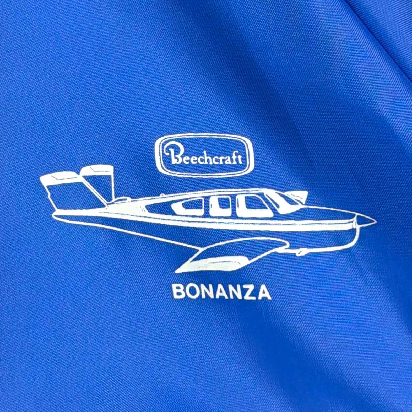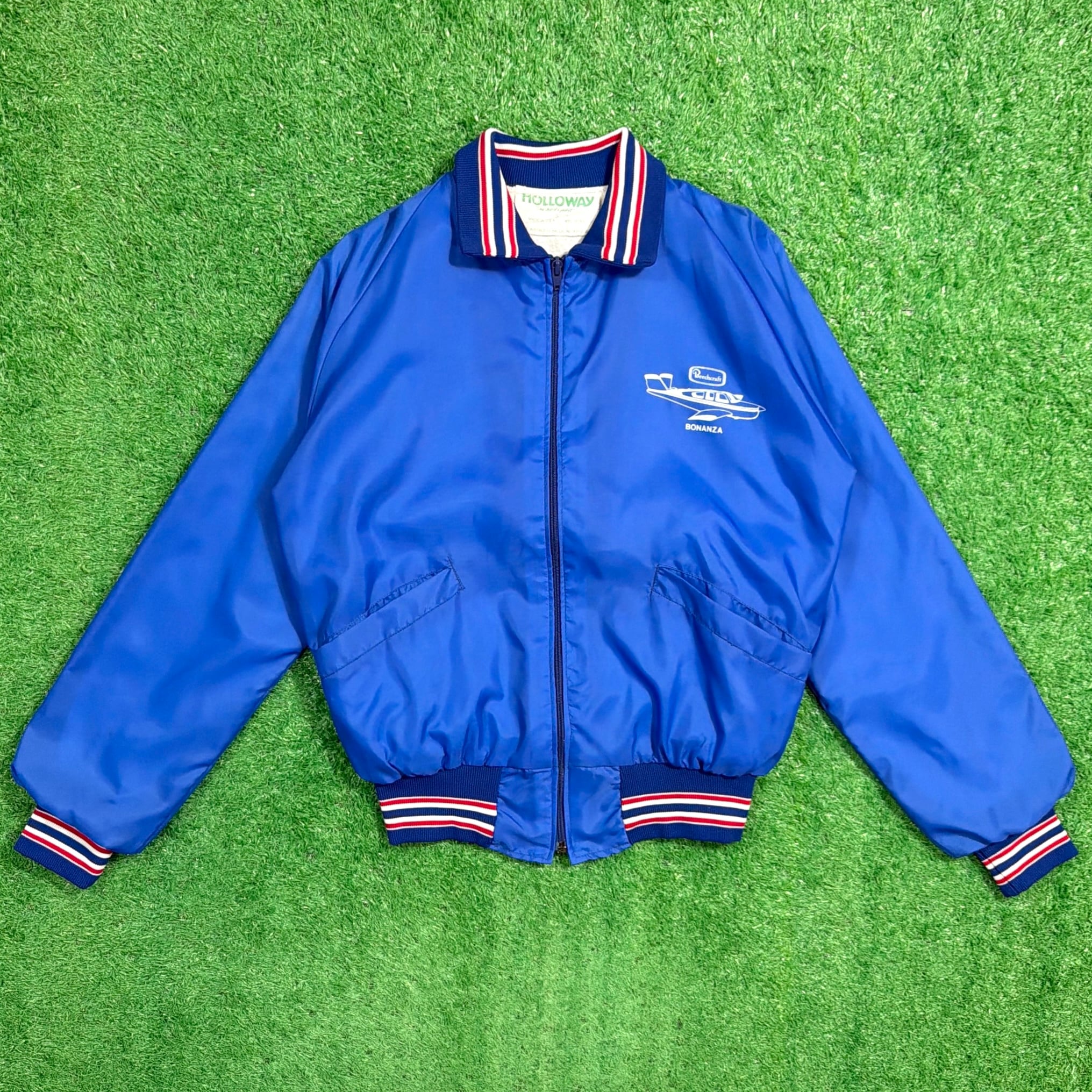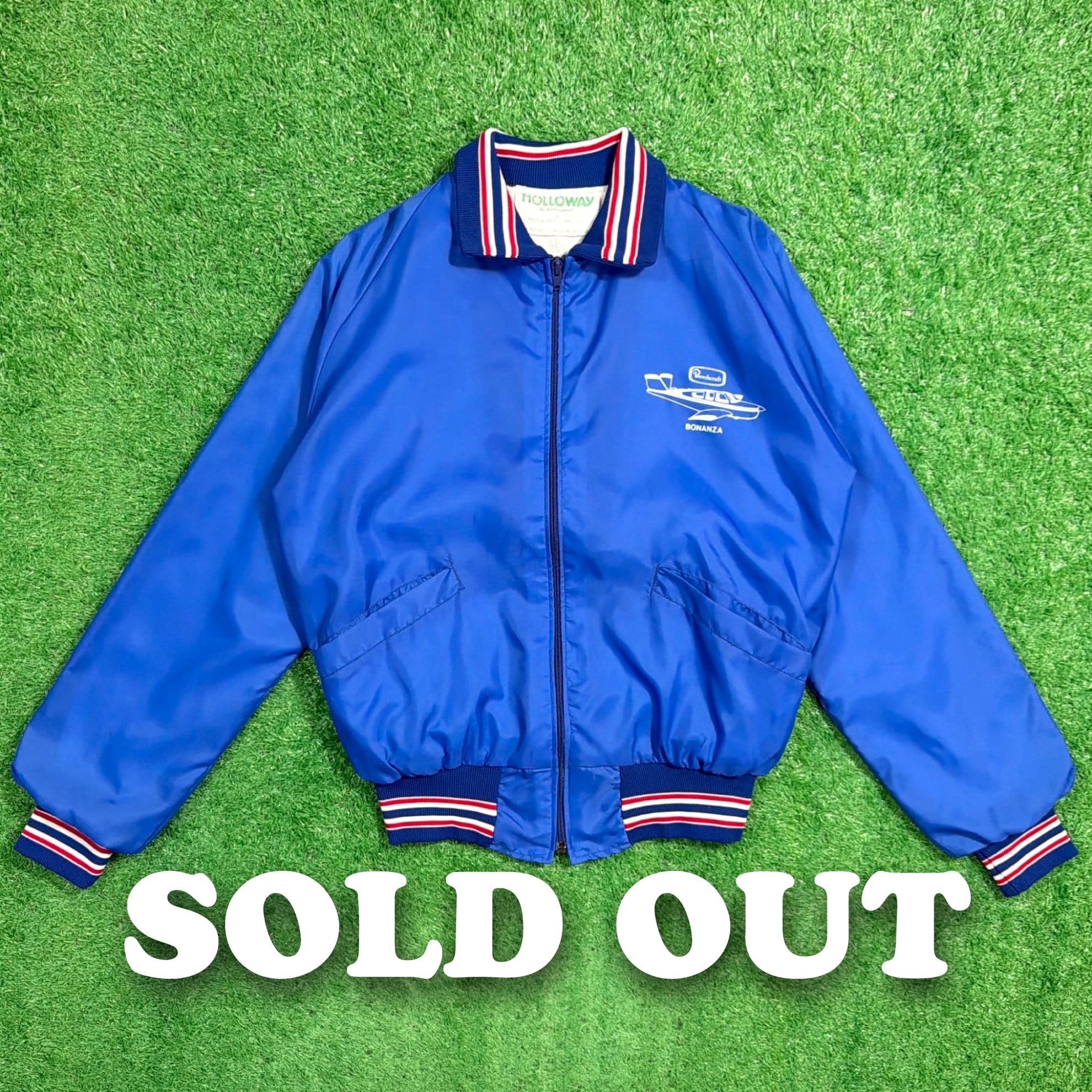 フロントには「Bonanza(ボナンザ)」の飛行機イラストとロゴがプリントされたデザイン。鮮やかなブルーカラーのボディに、トリコロールカラーのリブが映える一着です。軽量でさらっと羽織れるナイロン素材で、スポーティーかつユニークな企業系ジャケットらしい雰囲気が魅力的。