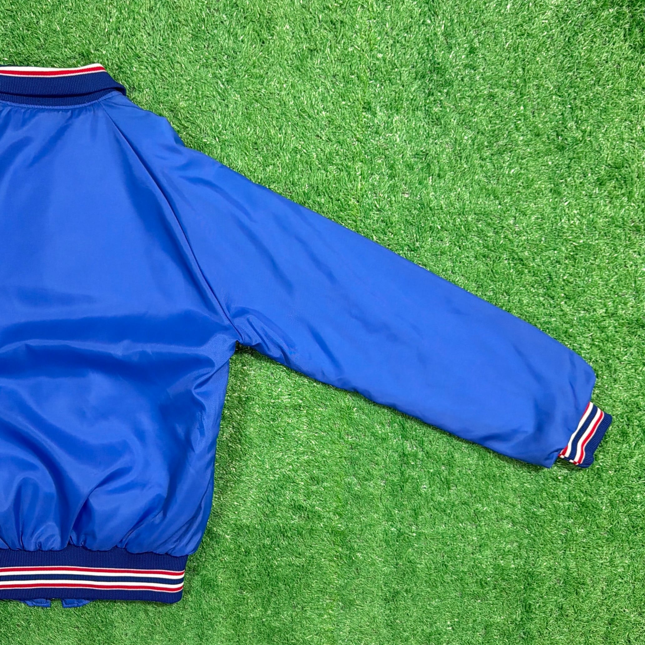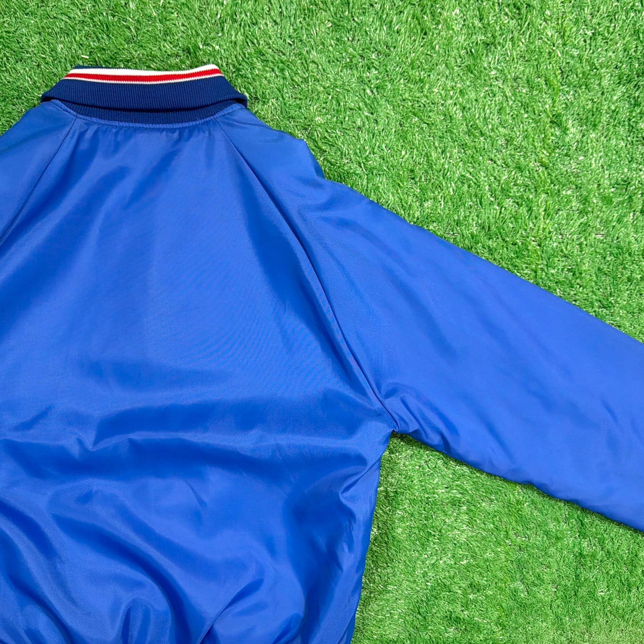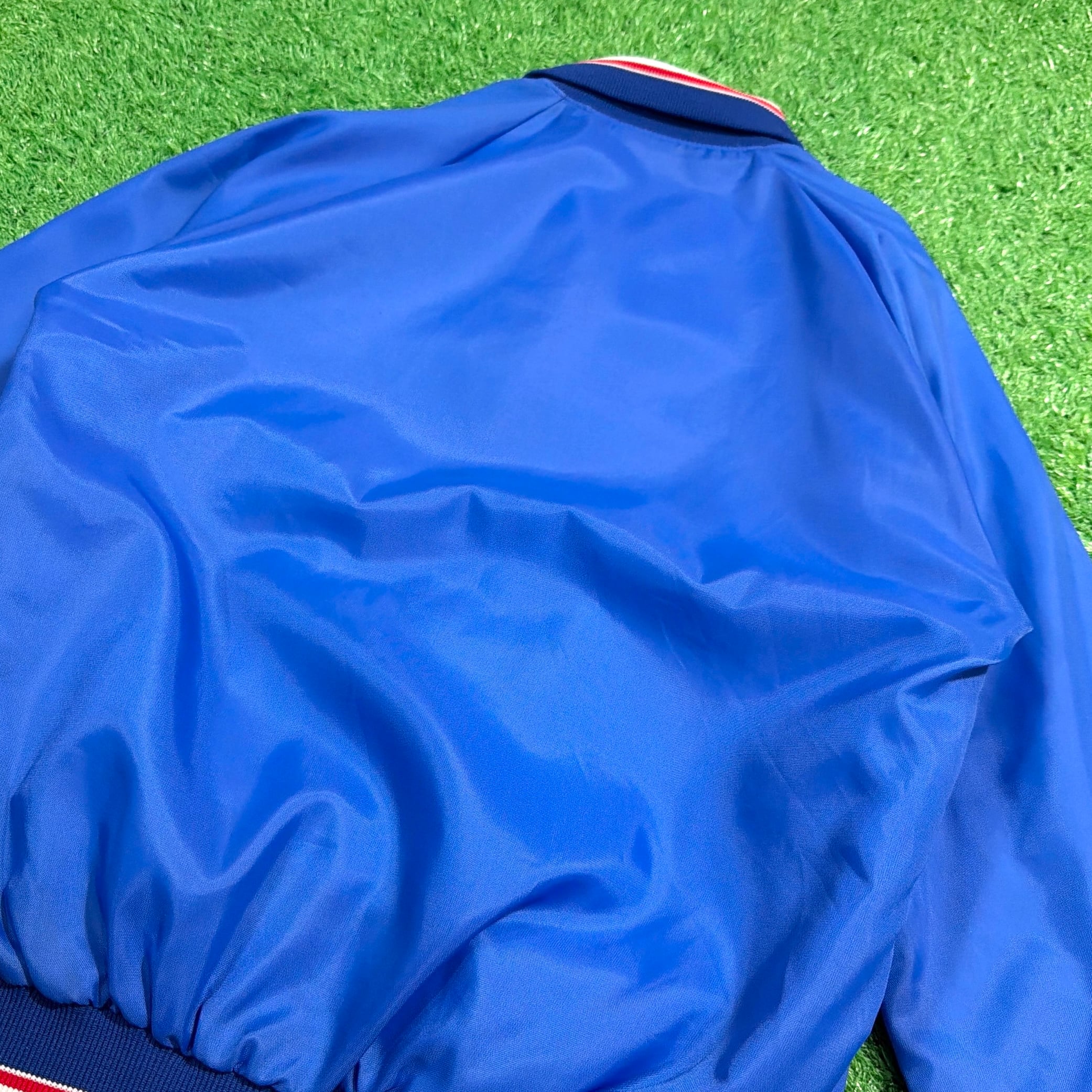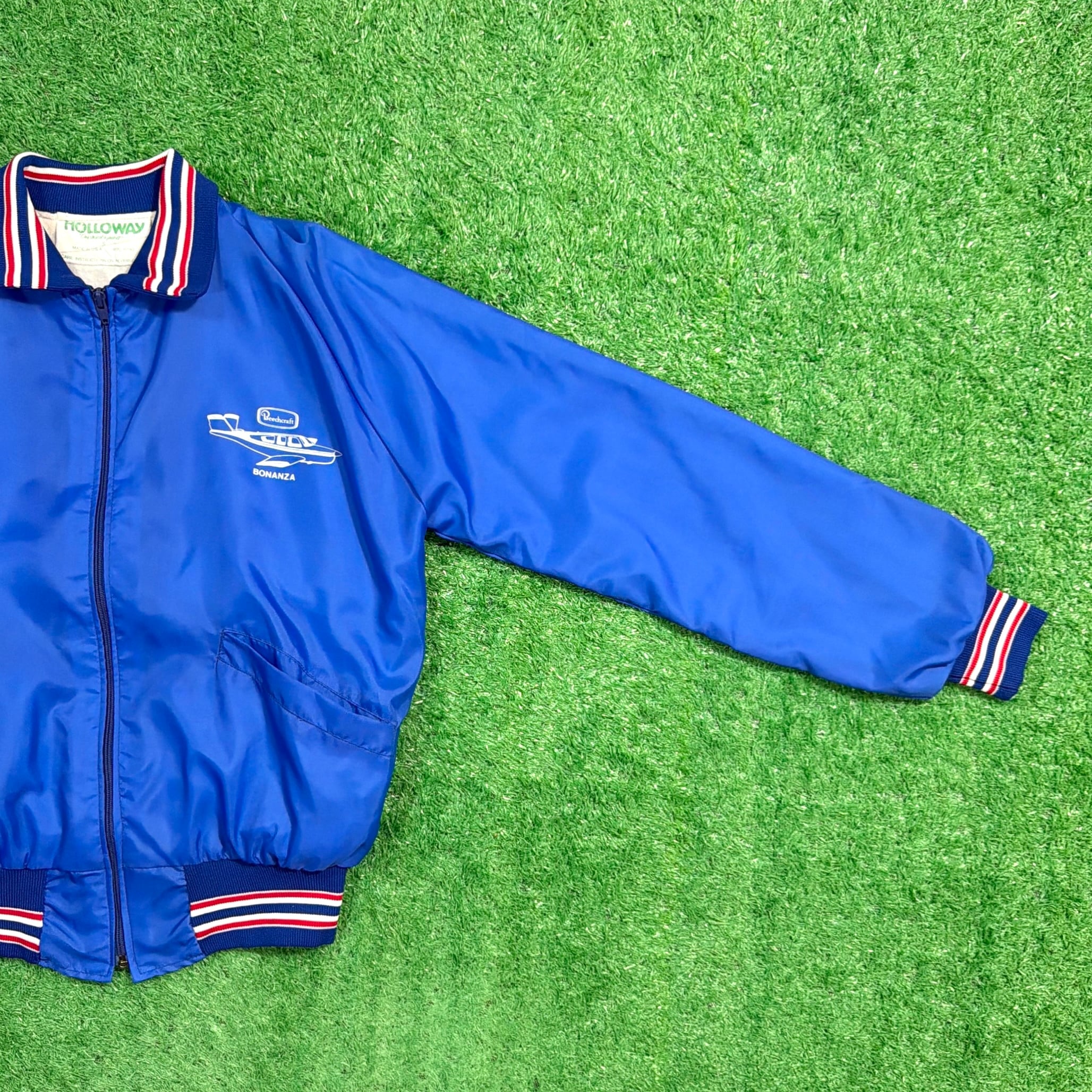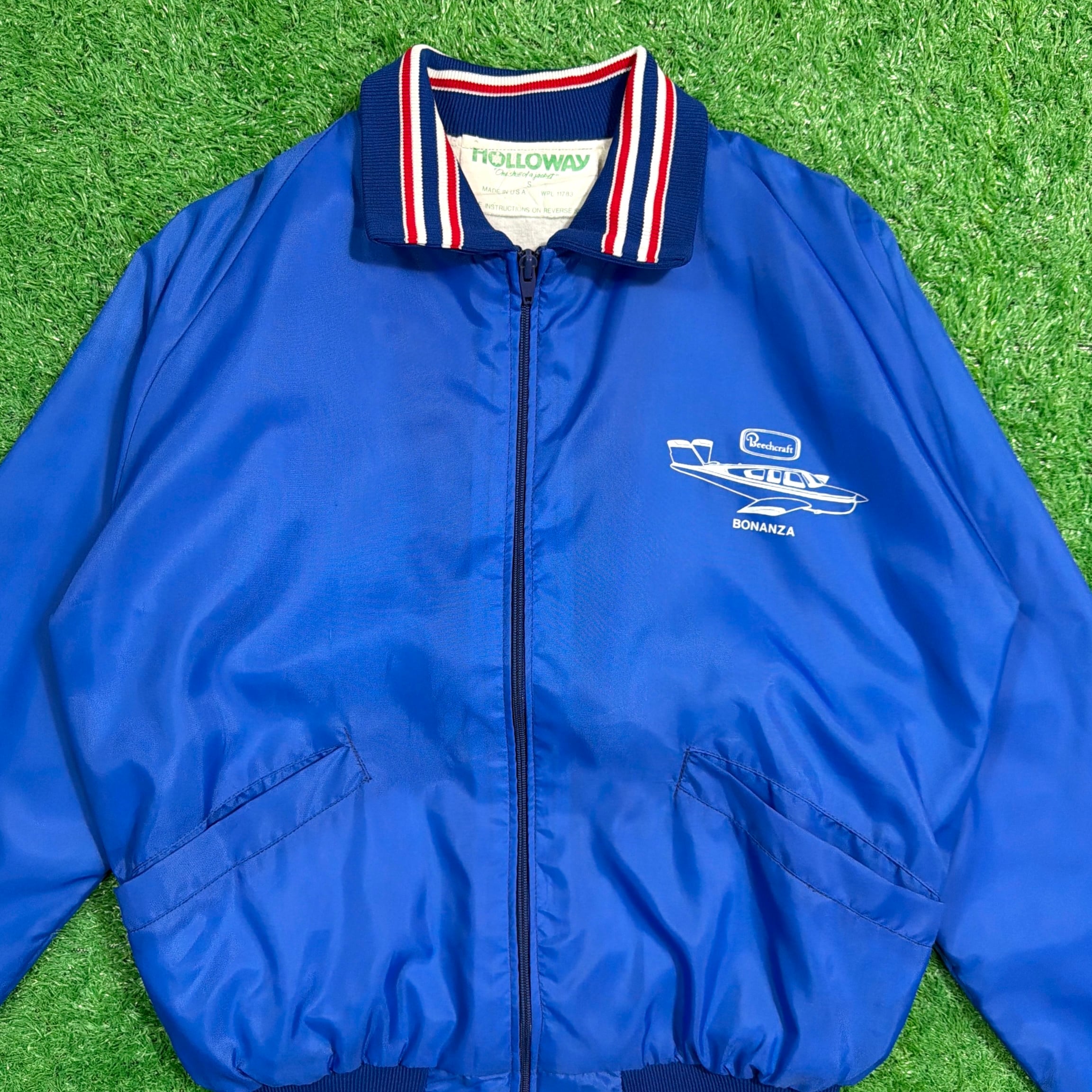 フロントには「Bonanza(ボナンザ)」の飛行機イラストとロゴがプリントされたデザイン。鮮やかなブルーカラーのボディに、トリコロールカラーのリブが映える一着です。軽量でさらっと羽織れるナイロン素材で、スポーティーかつユニークな企業系ジャケットらしい雰囲気が魅力的。