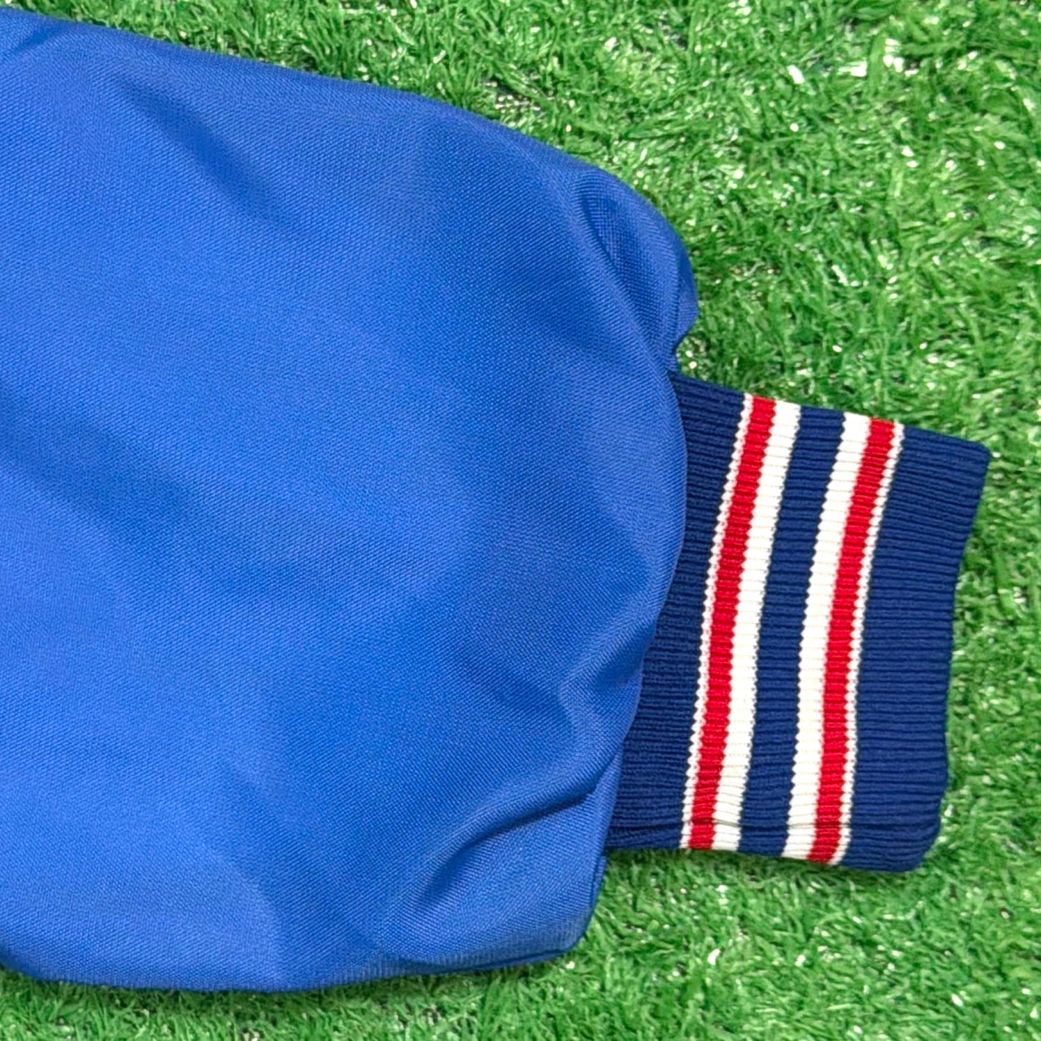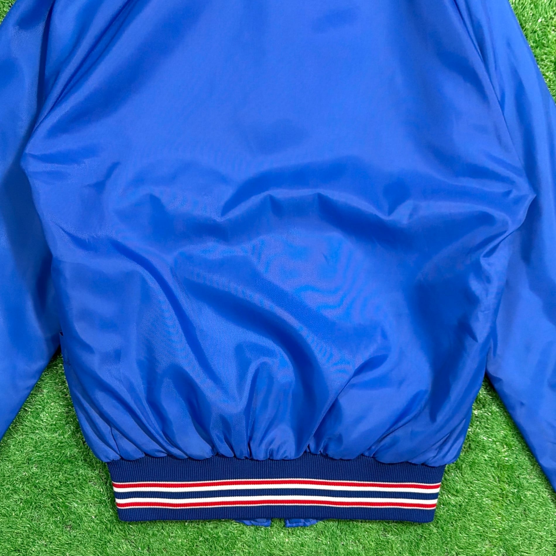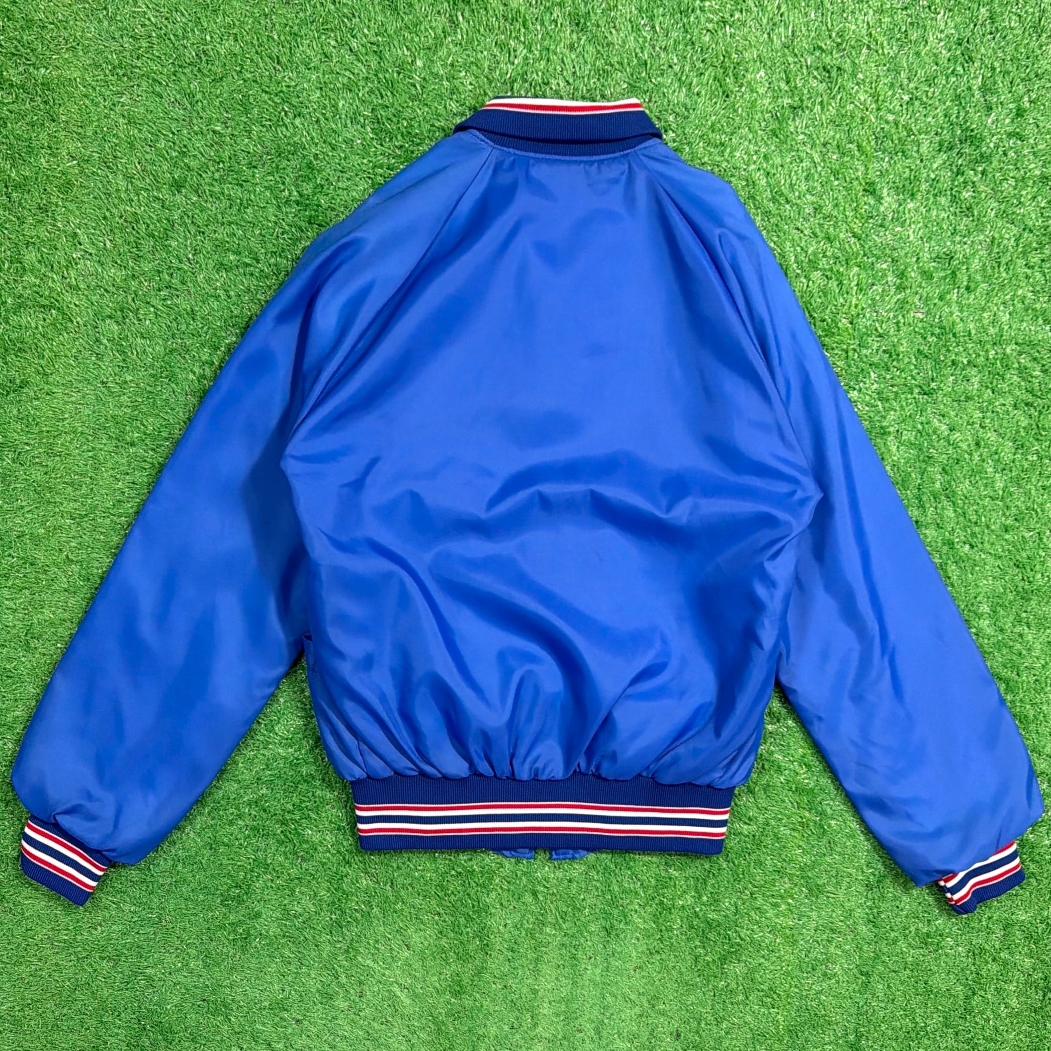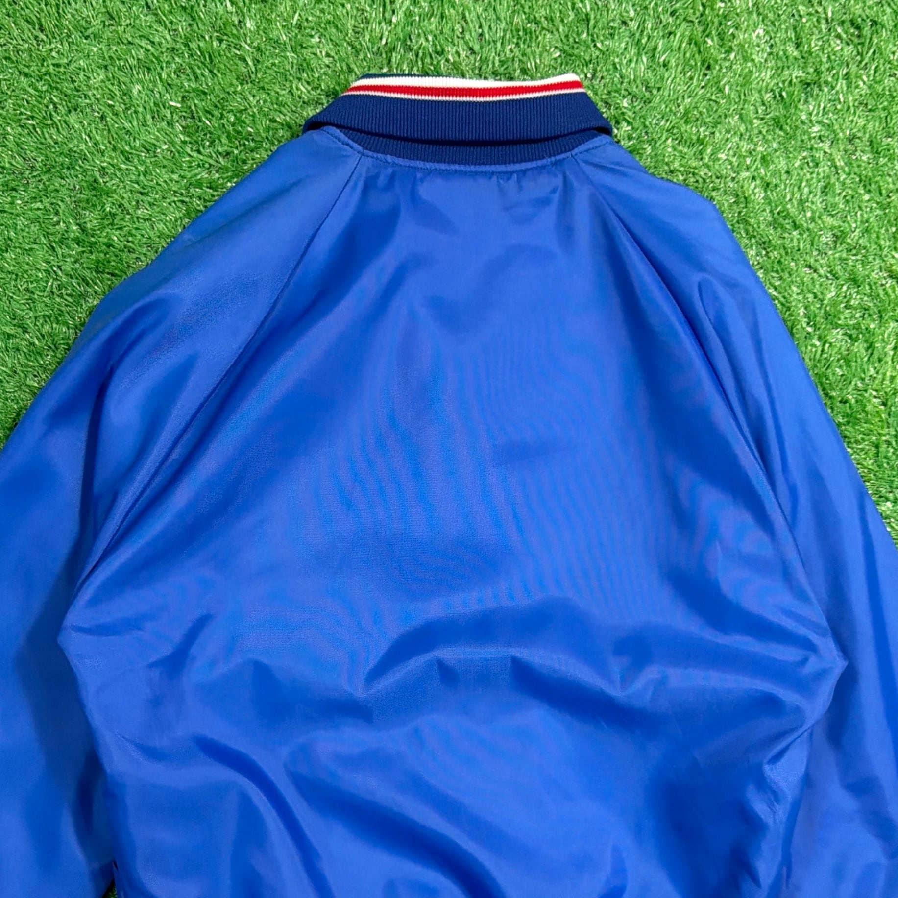 フロントには「Bonanza(ボナンザ)」の飛行機イラストとロゴがプリントされたデザイン。鮮やかなブルーカラーのボディに、トリコロールカラーのリブが映える一着です。軽量でさらっと羽織れるナイロン素材で、スポーティーかつユニークな企業系ジャケットらしい雰囲気が魅力的。