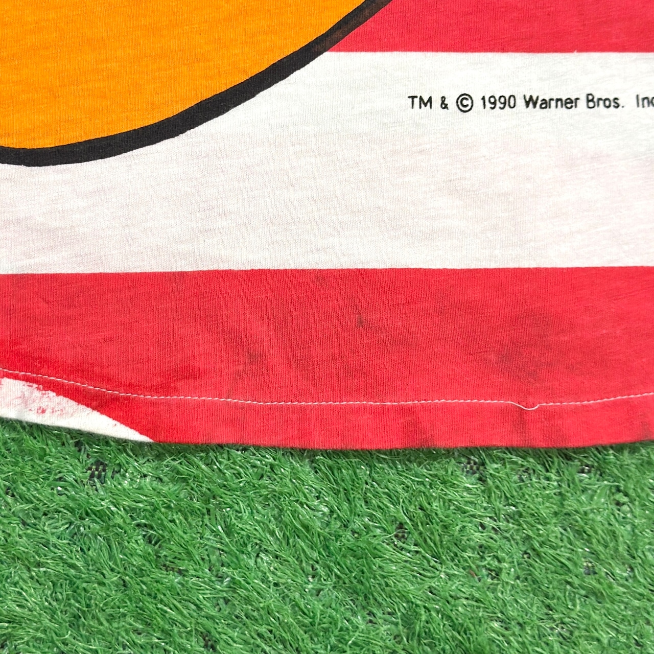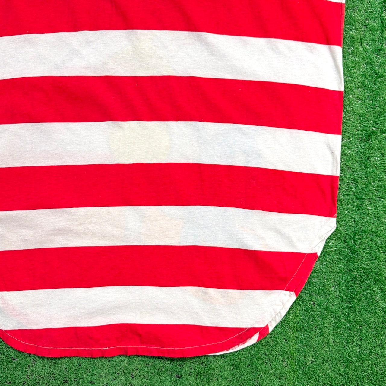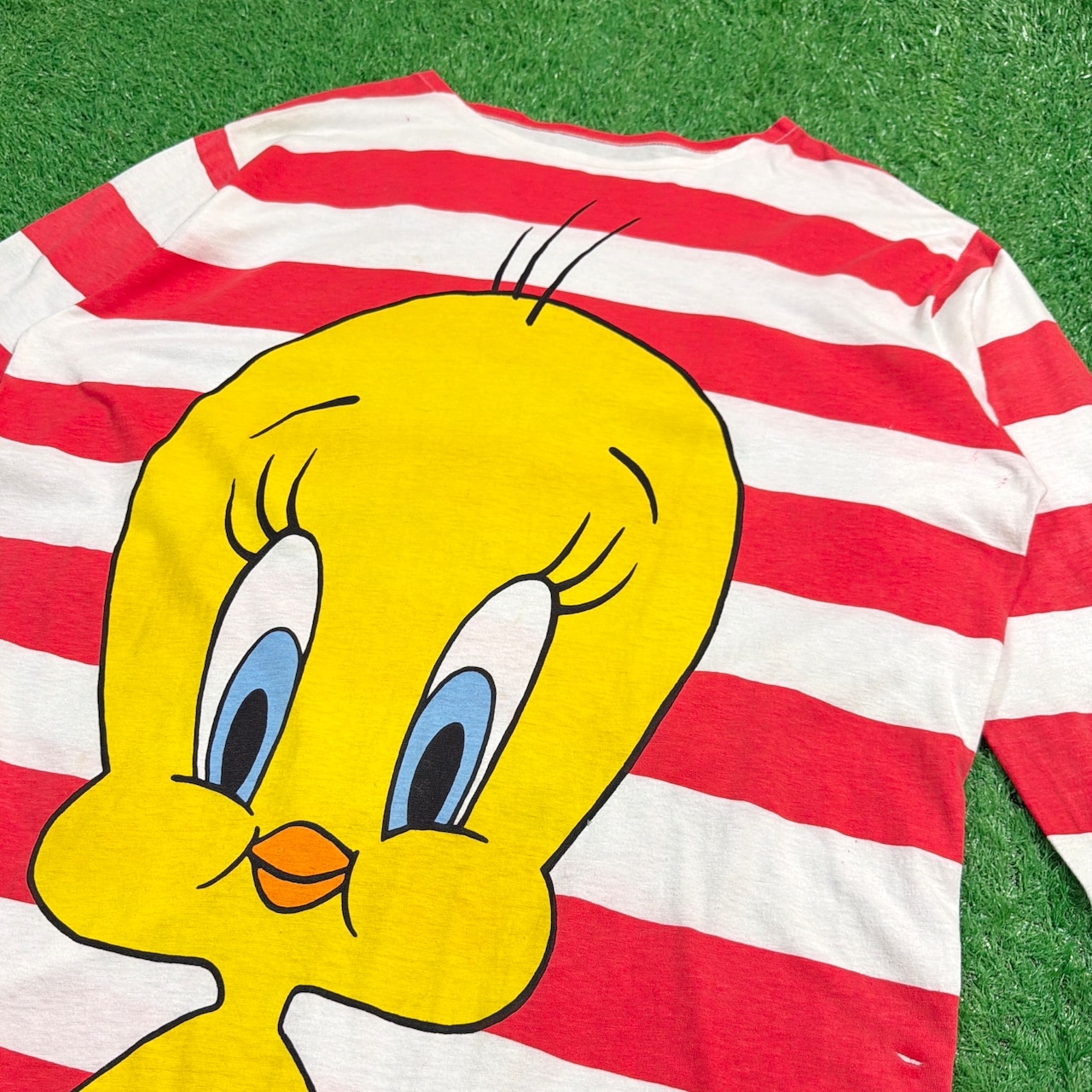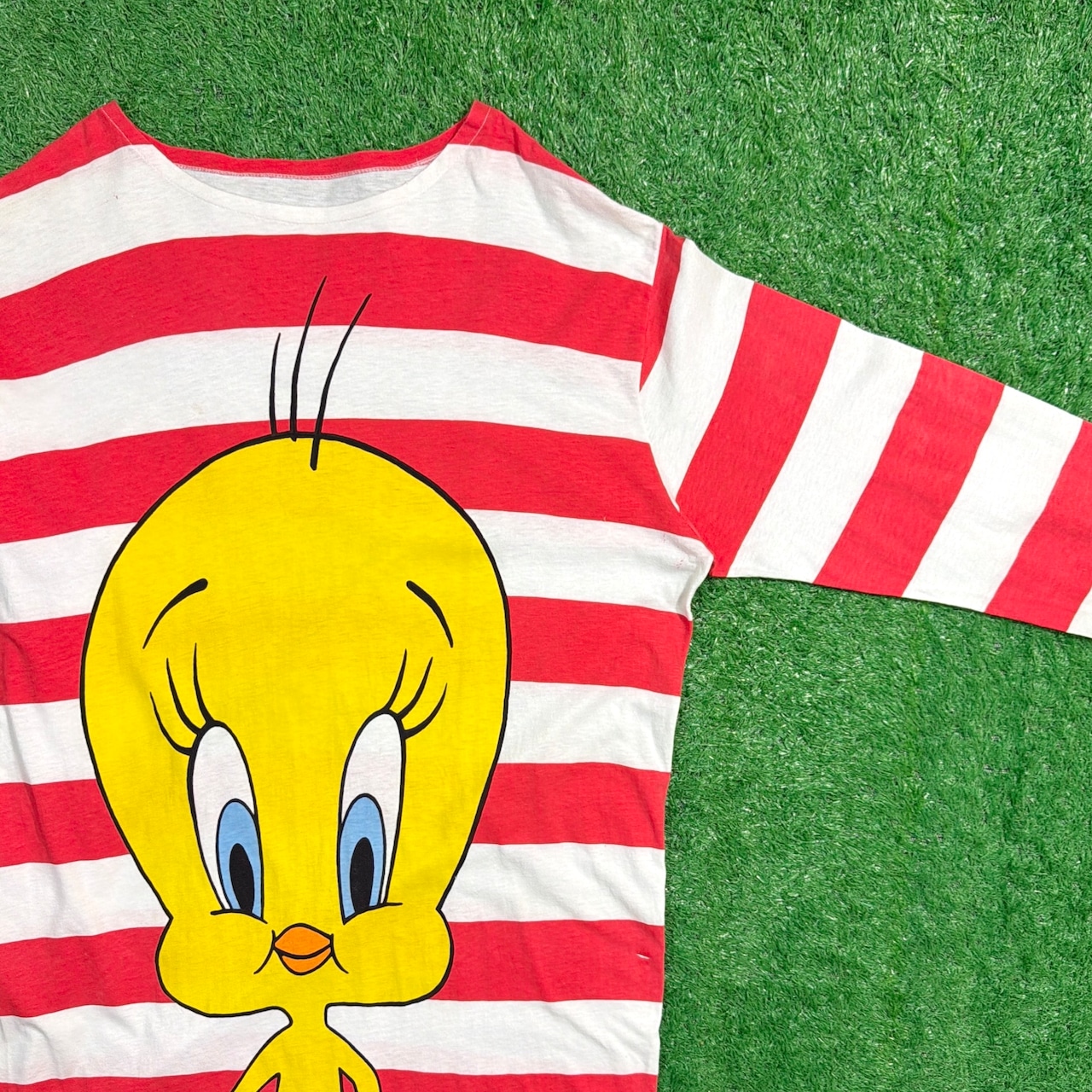 レッド×ホワイトのボーダーボディに、大きくトゥイーティーのプリントが施された存在感抜群のデザイン。ぬいぐるみを持ったキャラクターがポップで、90sらしいキャラクターアイテムの魅力が詰まった一枚です。スネくらいのシルエットになります。