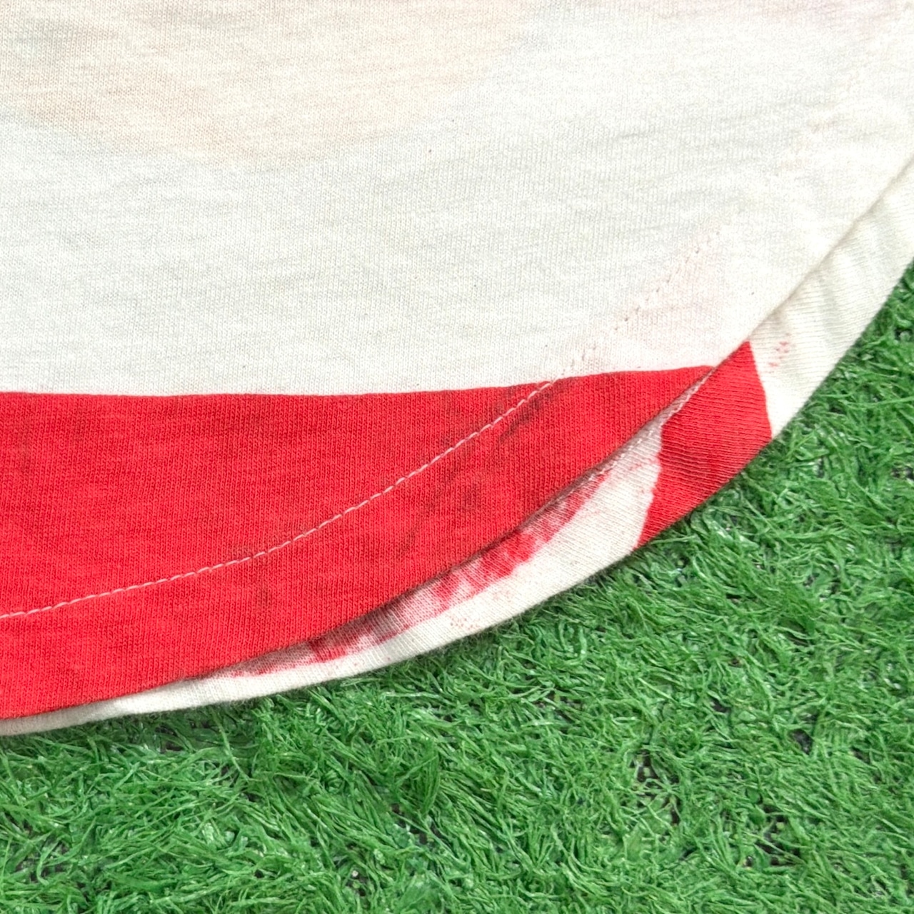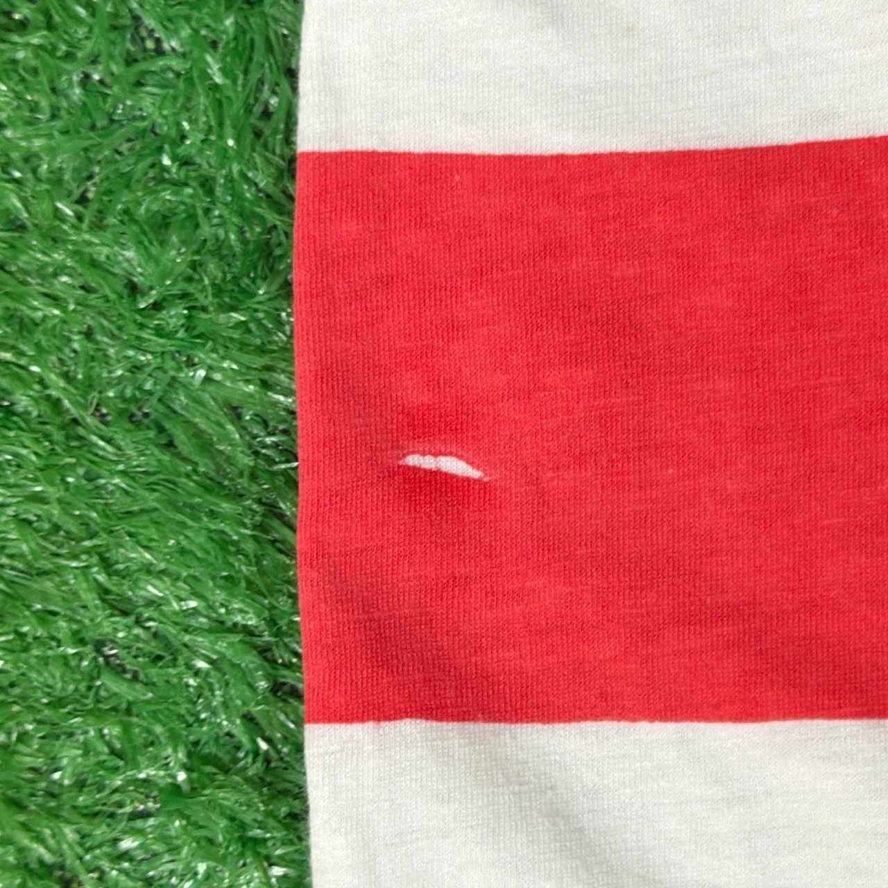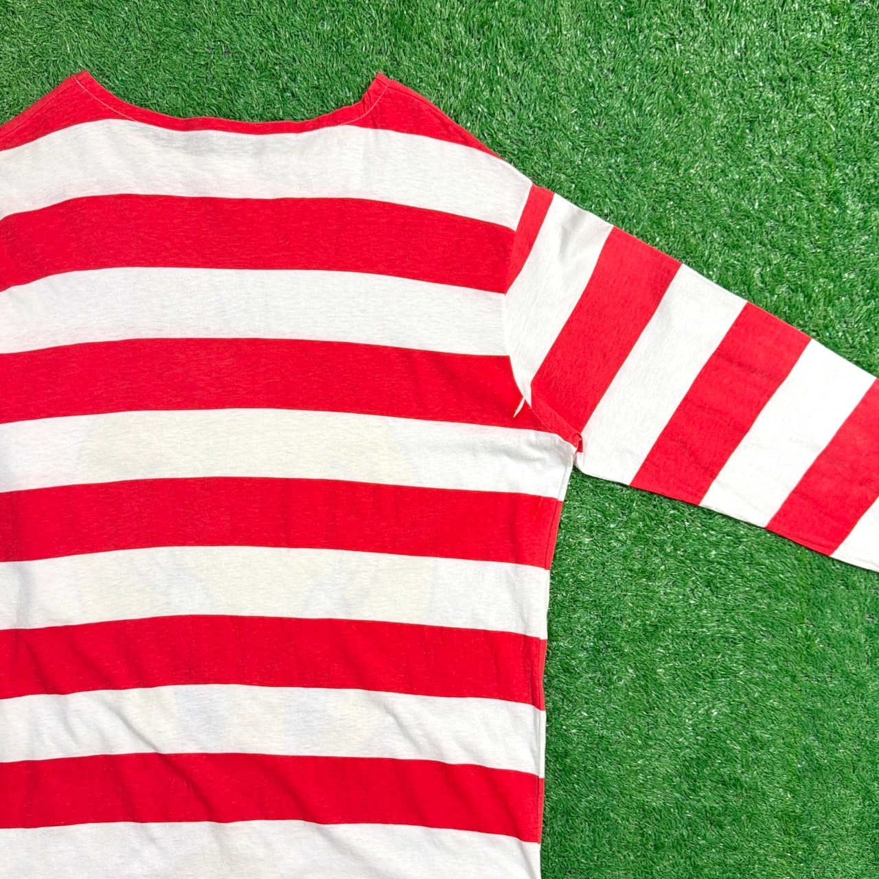 レッド×ホワイトのボーダーボディに、大きくトゥイーティーのプリントが施された存在感抜群のデザイン。ぬいぐるみを持ったキャラクターがポップで、90sらしいキャラクターアイテムの魅力が詰まった一枚です。スネくらいのシルエットになります。