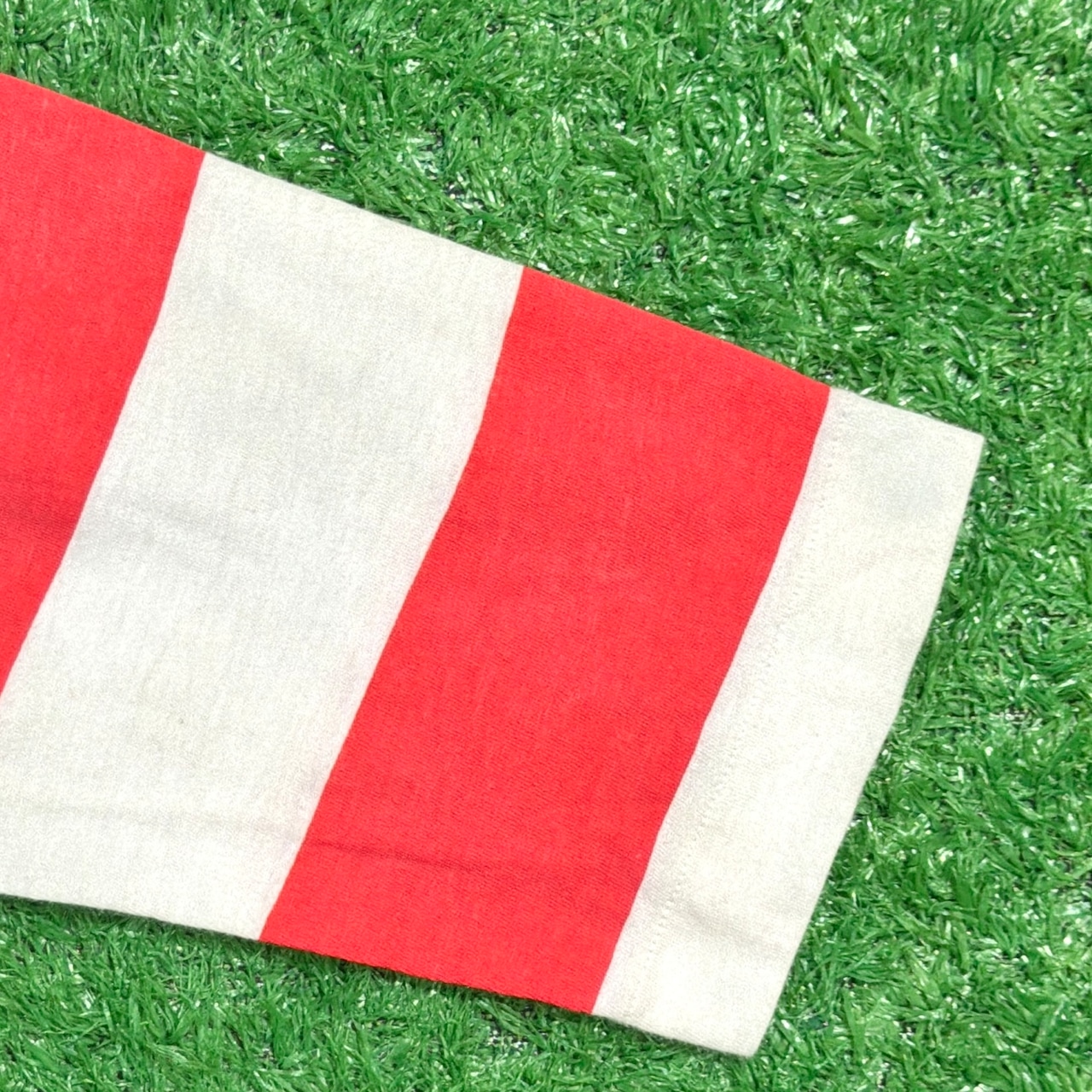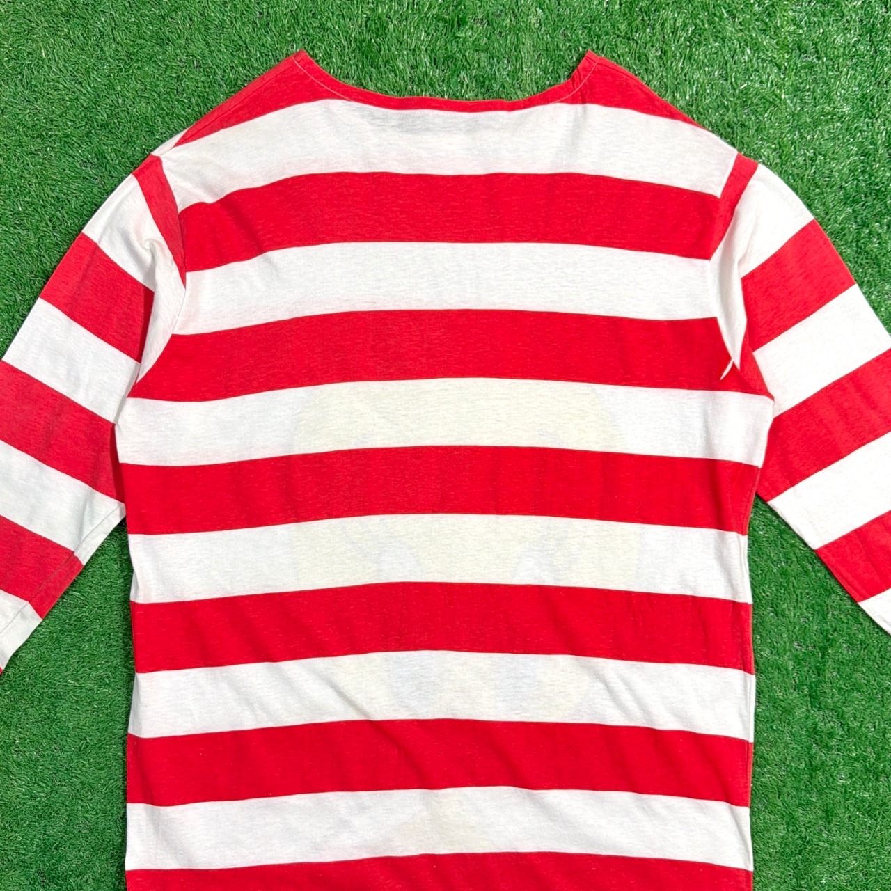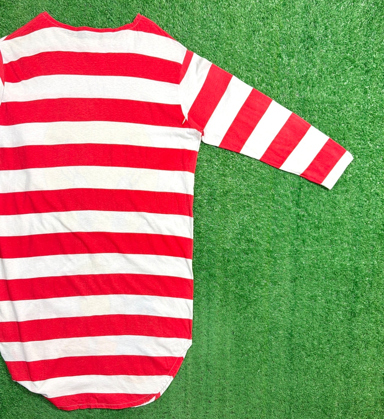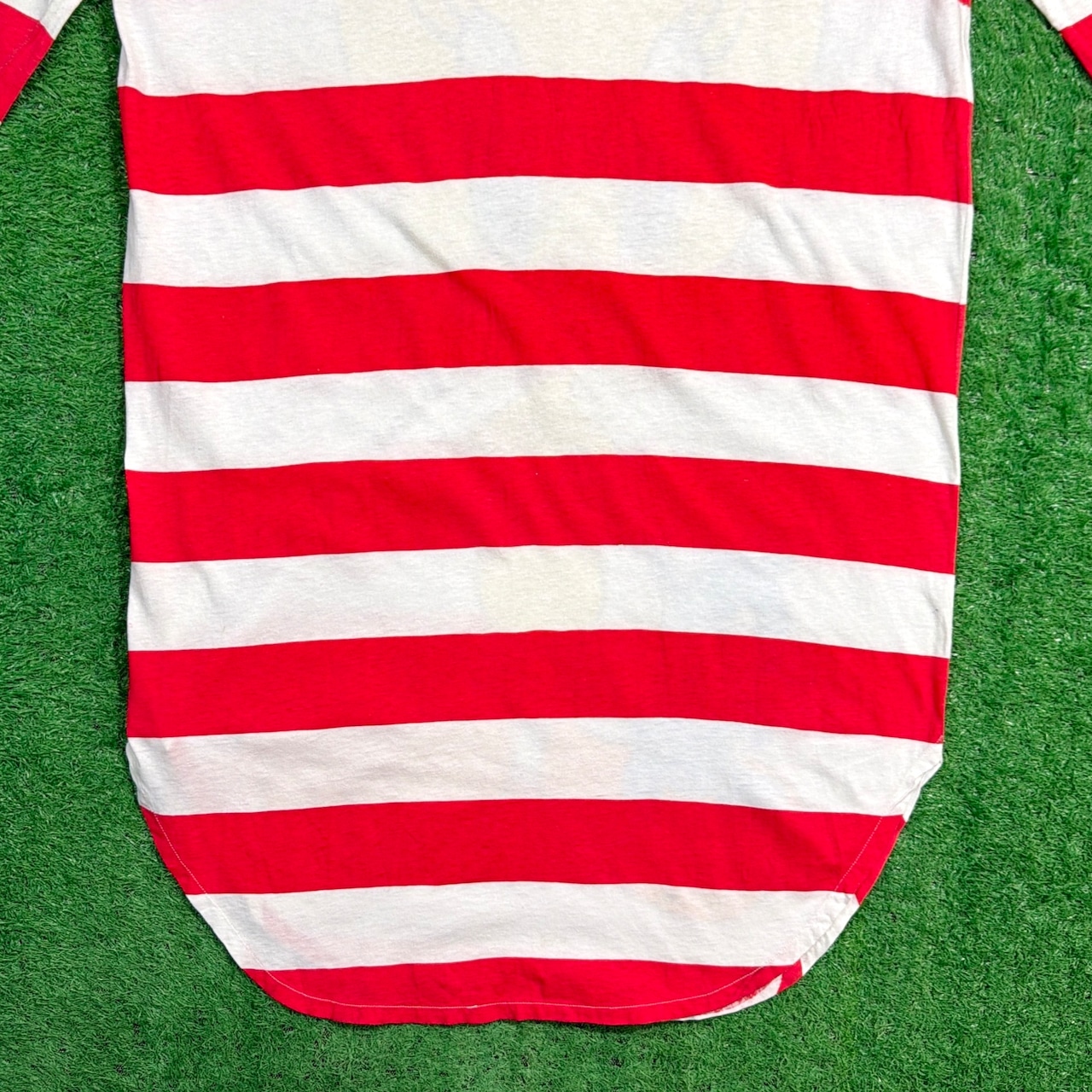 レッド×ホワイトのボーダーボディに、大きくトゥイーティーのプリントが施された存在感抜群のデザイン。ぬいぐるみを持ったキャラクターがポップで、90sらしいキャラクターアイテムの魅力が詰まった一枚です。スネくらいのシルエットになります。