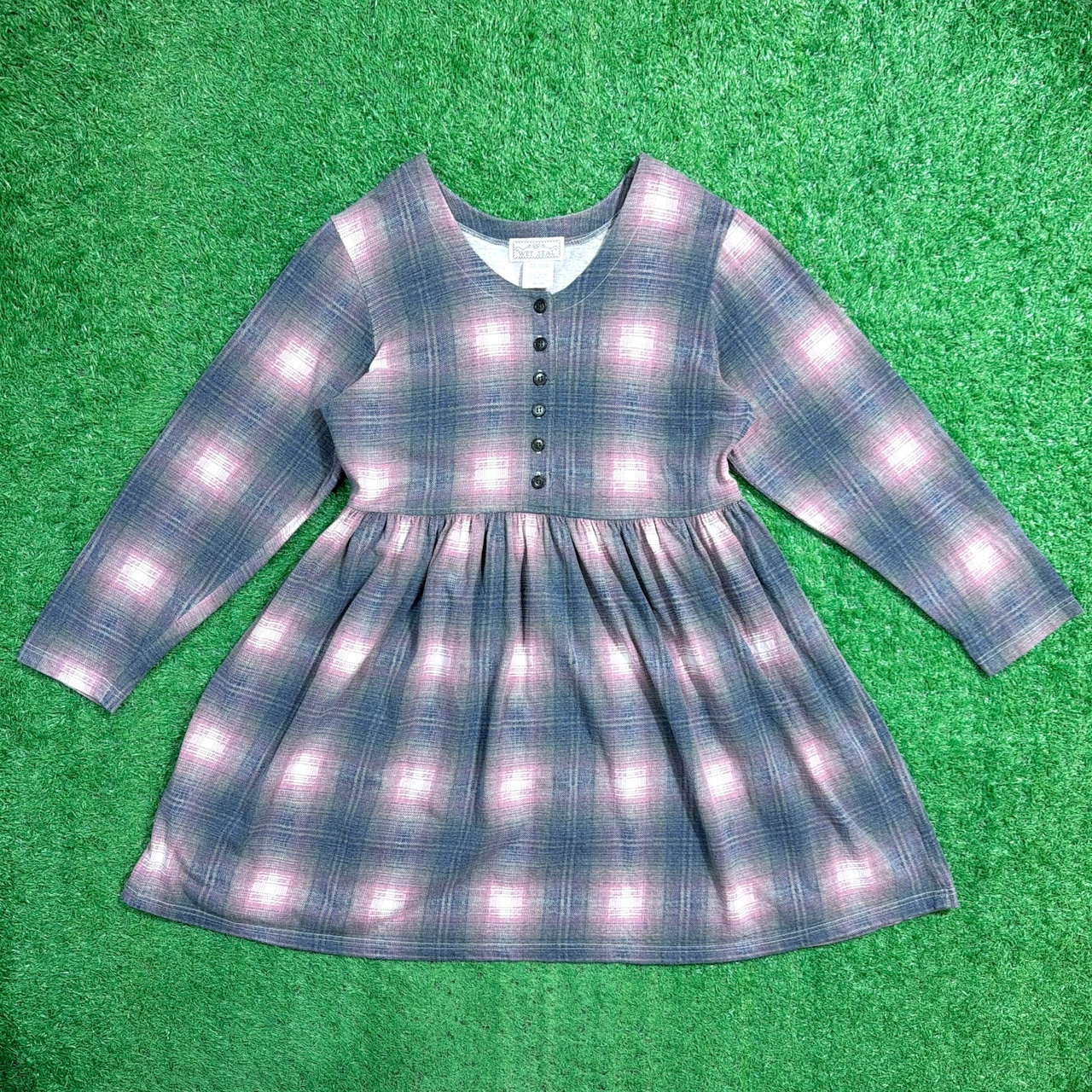 ブルー×グレー系の柔らかなグラデーションチェック柄で、落ち着いた雰囲気の一枚。胸元には小さなボタンが並び、ウエストからふんわり広がるシルエットが特徴です。膝丈ほどの丈感になります。