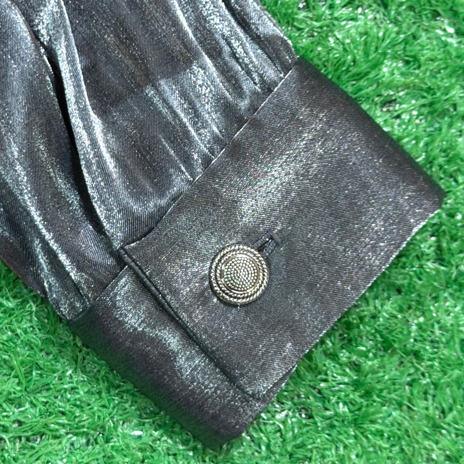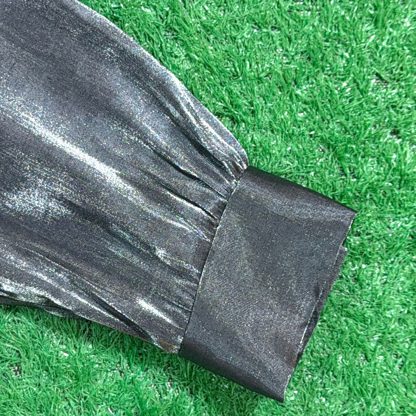 光沢感のある素材で、角度によって艶やかに見える存在感抜群の一枚。シンプルなデザインながらも、生地の質感によって90sらしいモードな雰囲気を演出します。程よくゆったりとしたシルエットで、コーディネートの主役になるアイテムです。